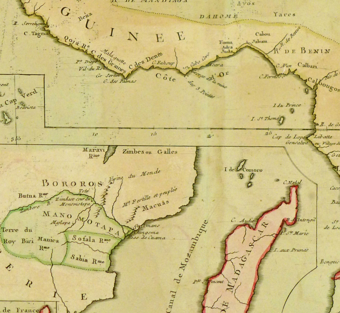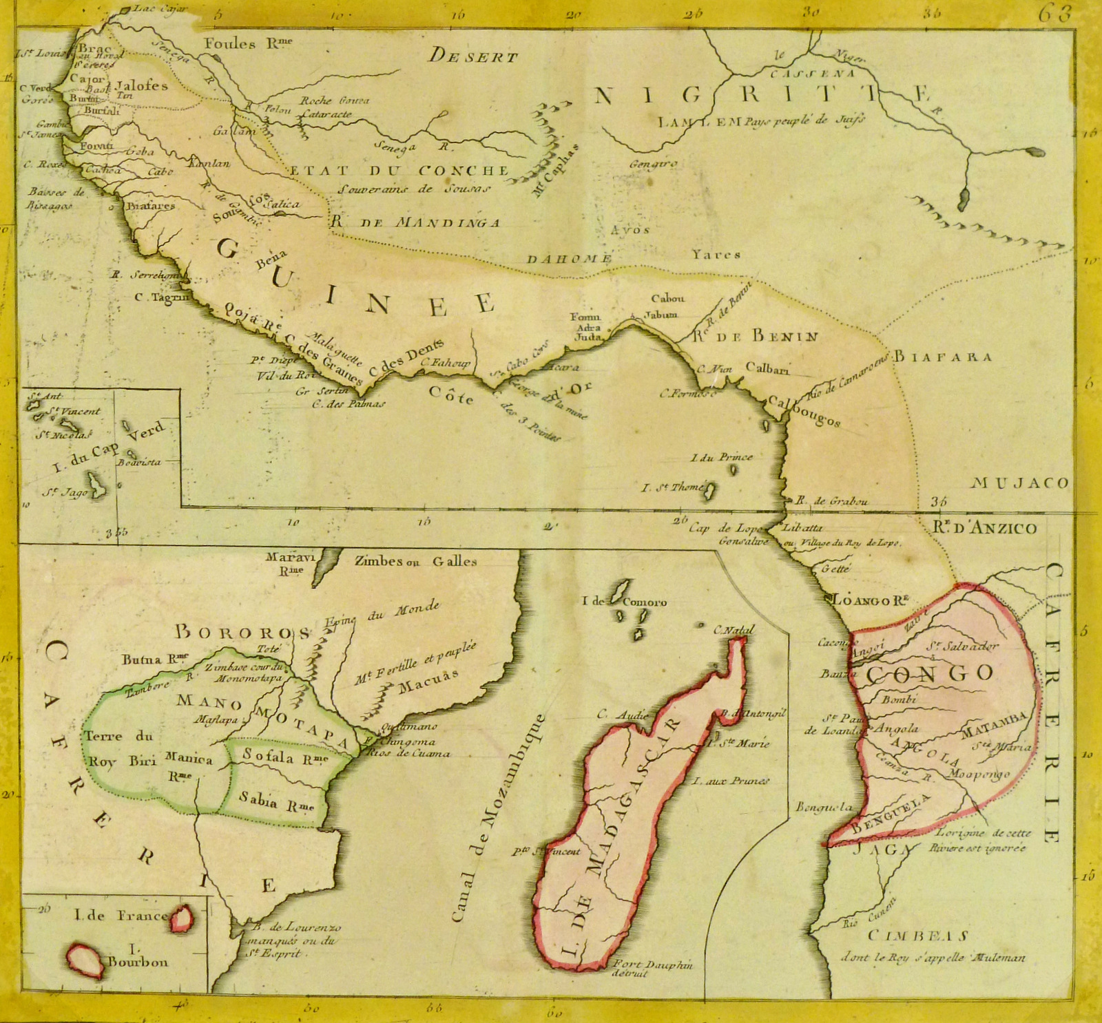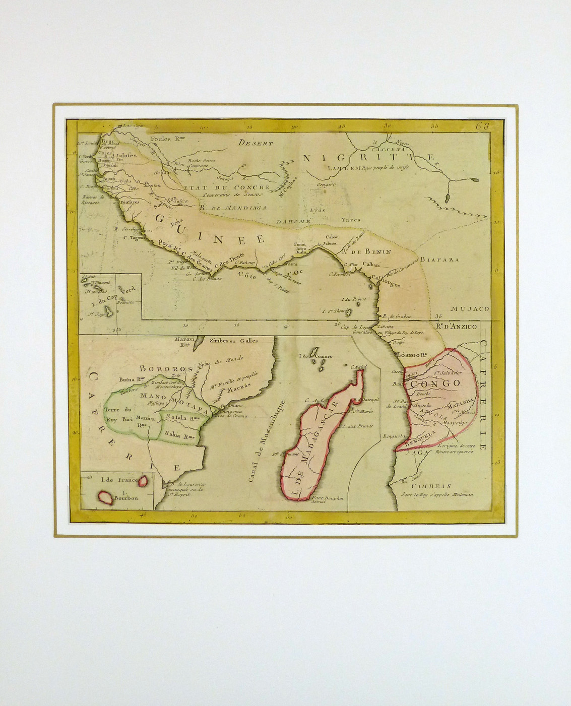 Copper engraving of Africa by Clouet, 1767. Shows West Africa, East Africa, Congo, and Madagascar. Note fabled kingdom of Monomotapa and many peoples and kingdoms listed. Original hand-coloring.