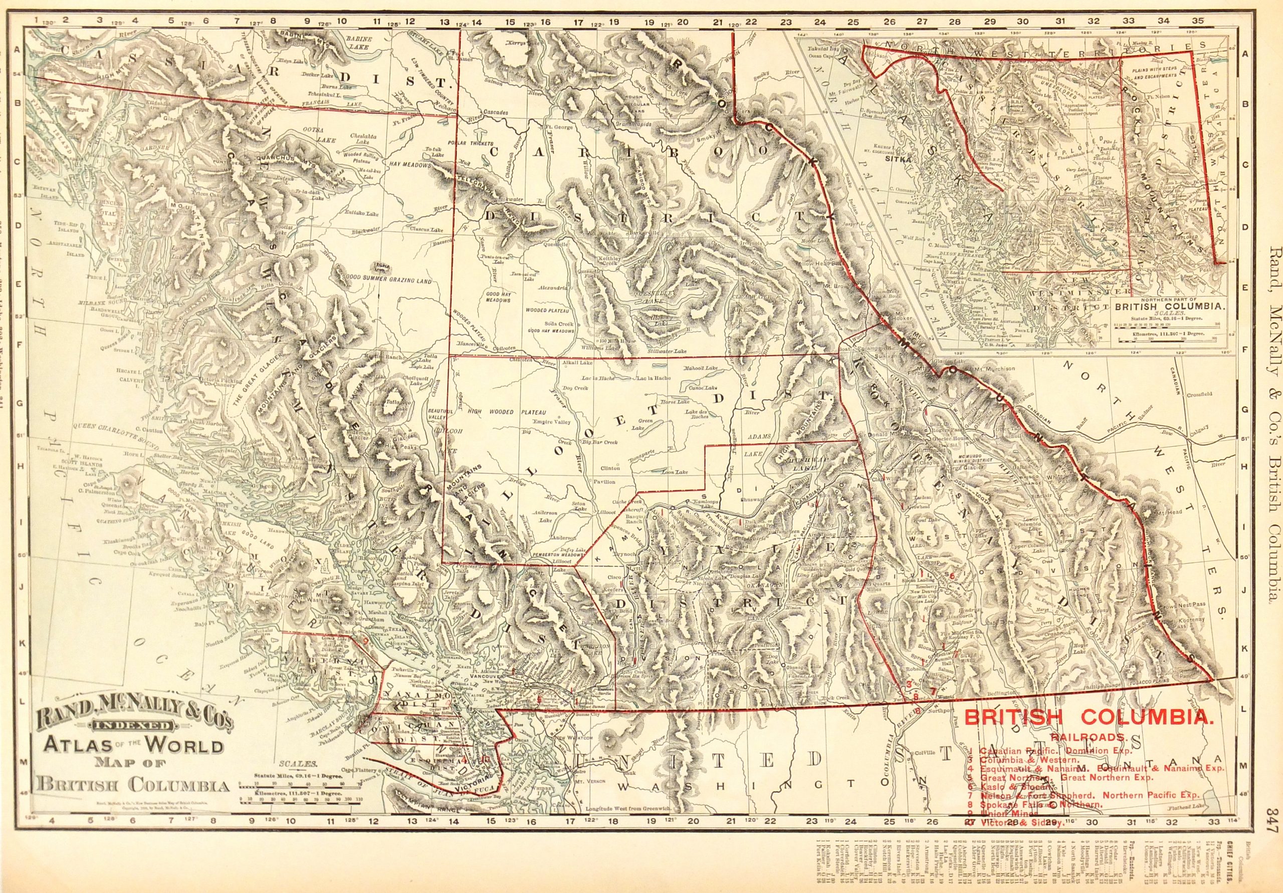 Large map of the province of British Columbia, 1895. Shows counties, railroads and towns. Note interesting index of town populations at bottom and railroad ownership in red lower right.