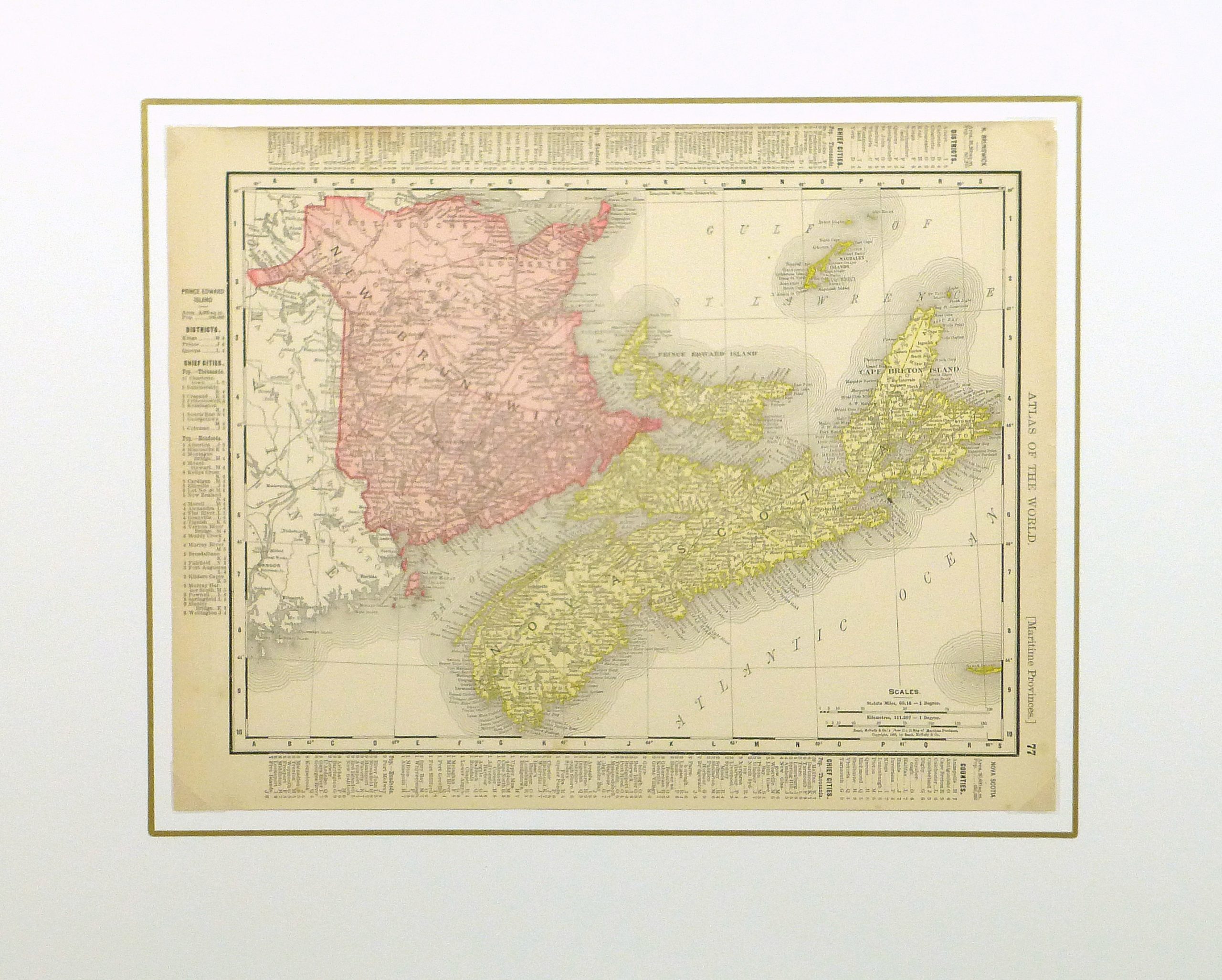 Colorful map of Canada’s three Maritime Provinces including New Brunswick, Nova Scotia, and Prince Edward Islands, 1895. Note index of populations in margins.