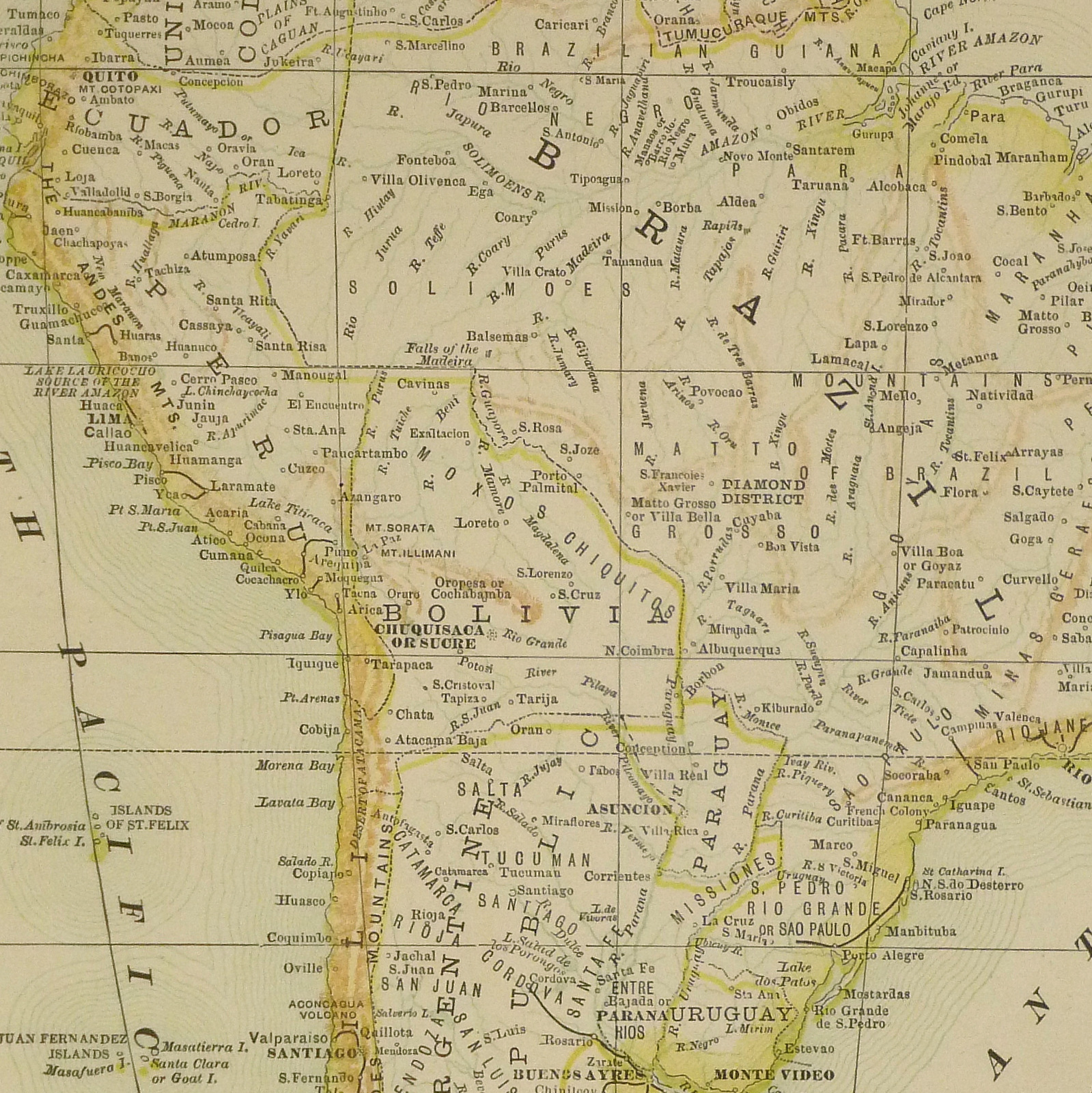 Bright antique engraved map of South America, 1890. Shows borders, early railroads, rivers, mountains and towns. Note inset of Panama, still part of Colombia.