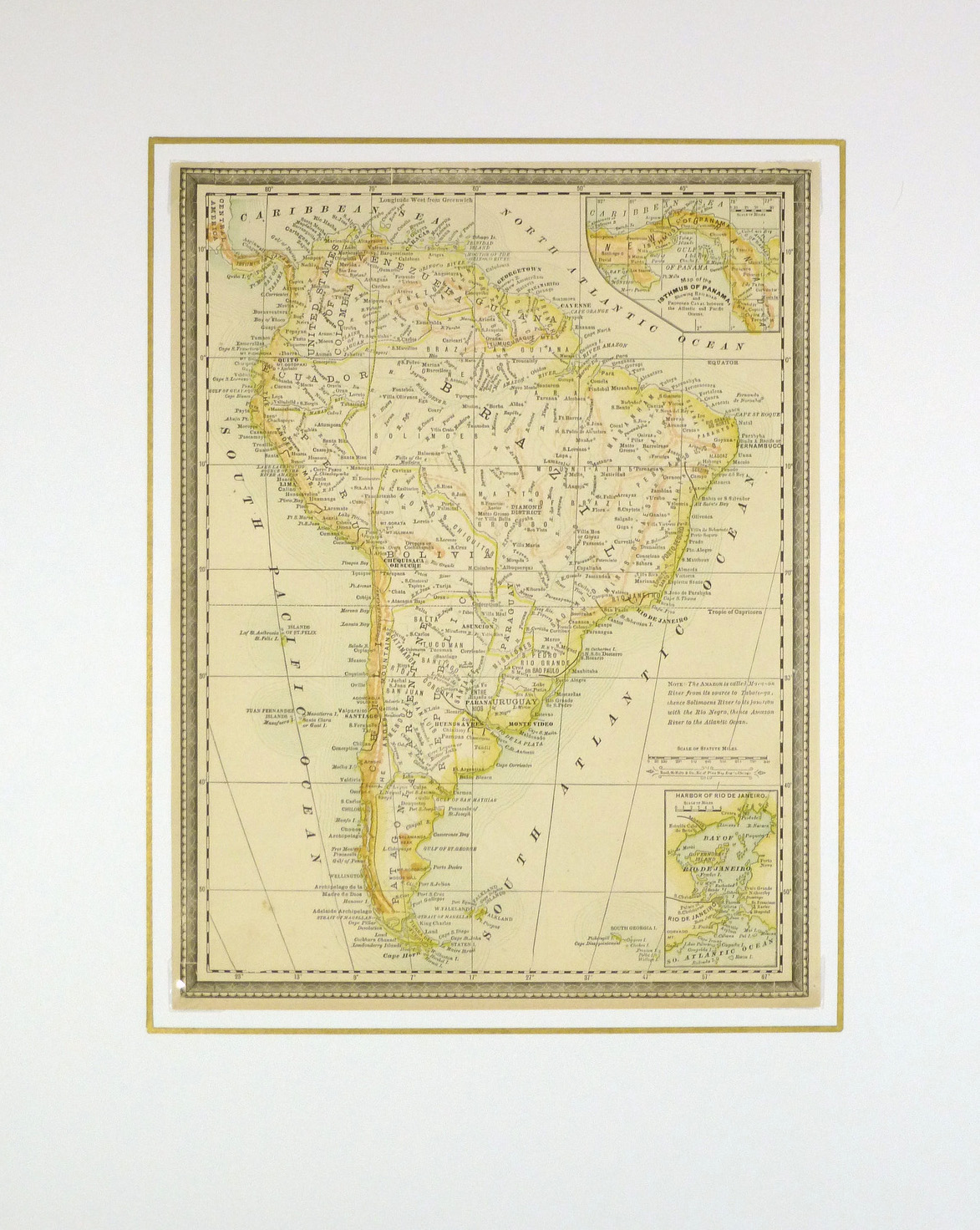 Original antique map on paper displayed on a white mat with a gold border. Mat fits a standard-size frame. Archival plastic sleeve and Certificate of Authenticity included. Map, 9.75″L x 12.75″H; mat, 16″L x 20″H.