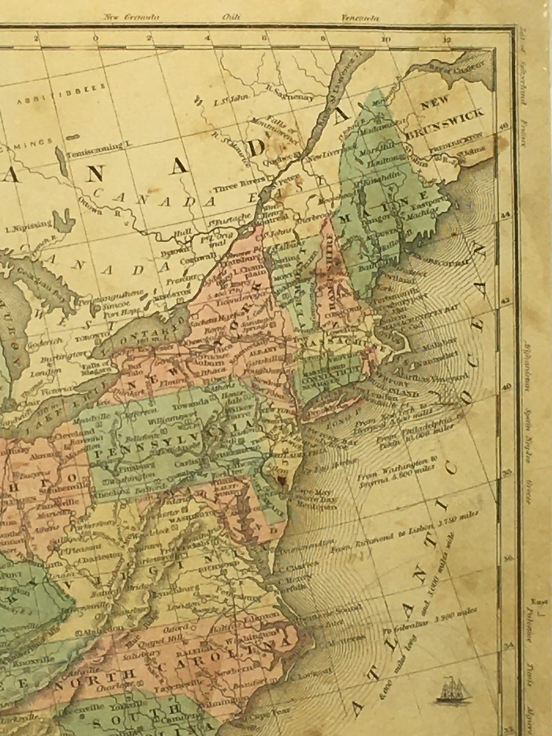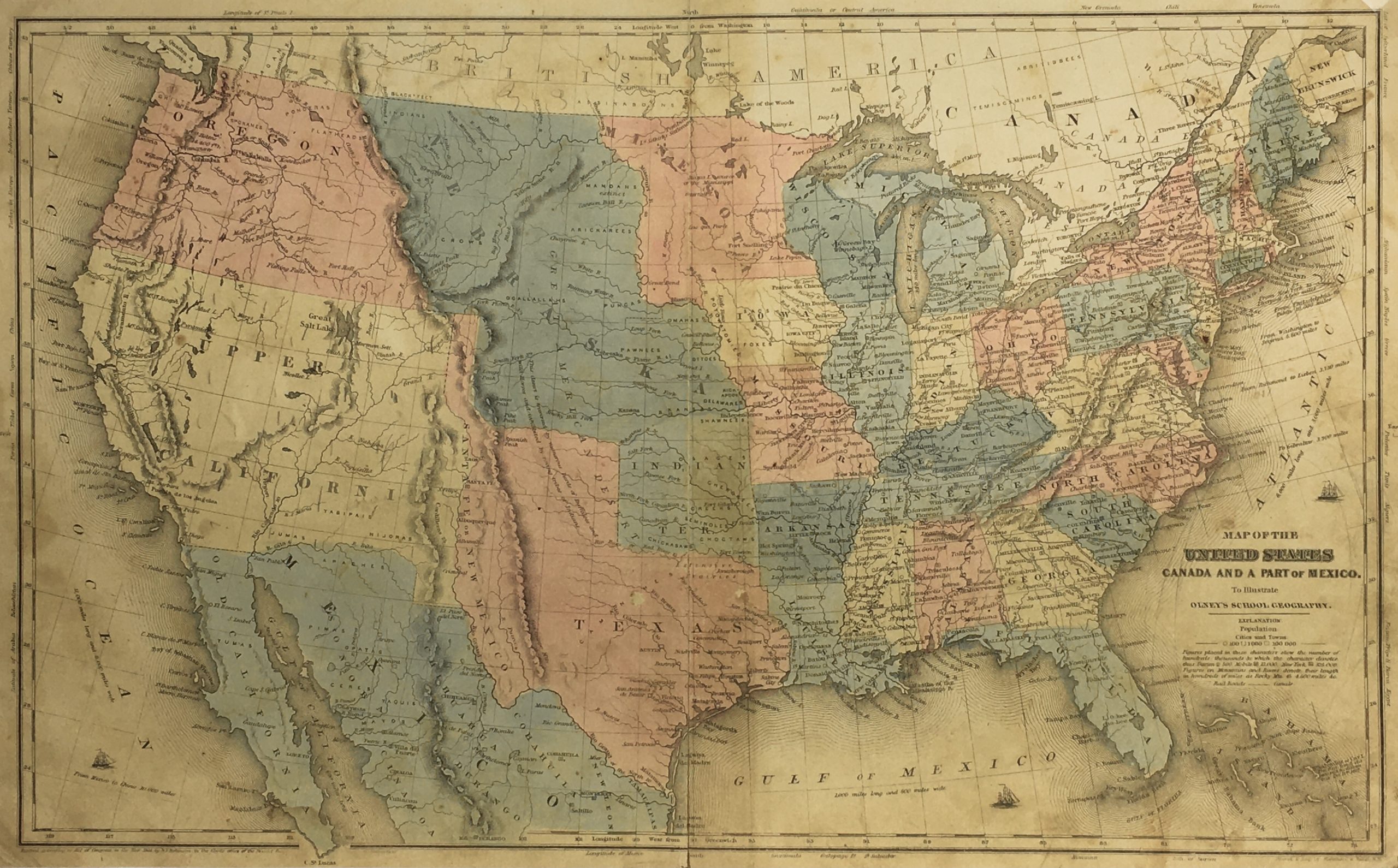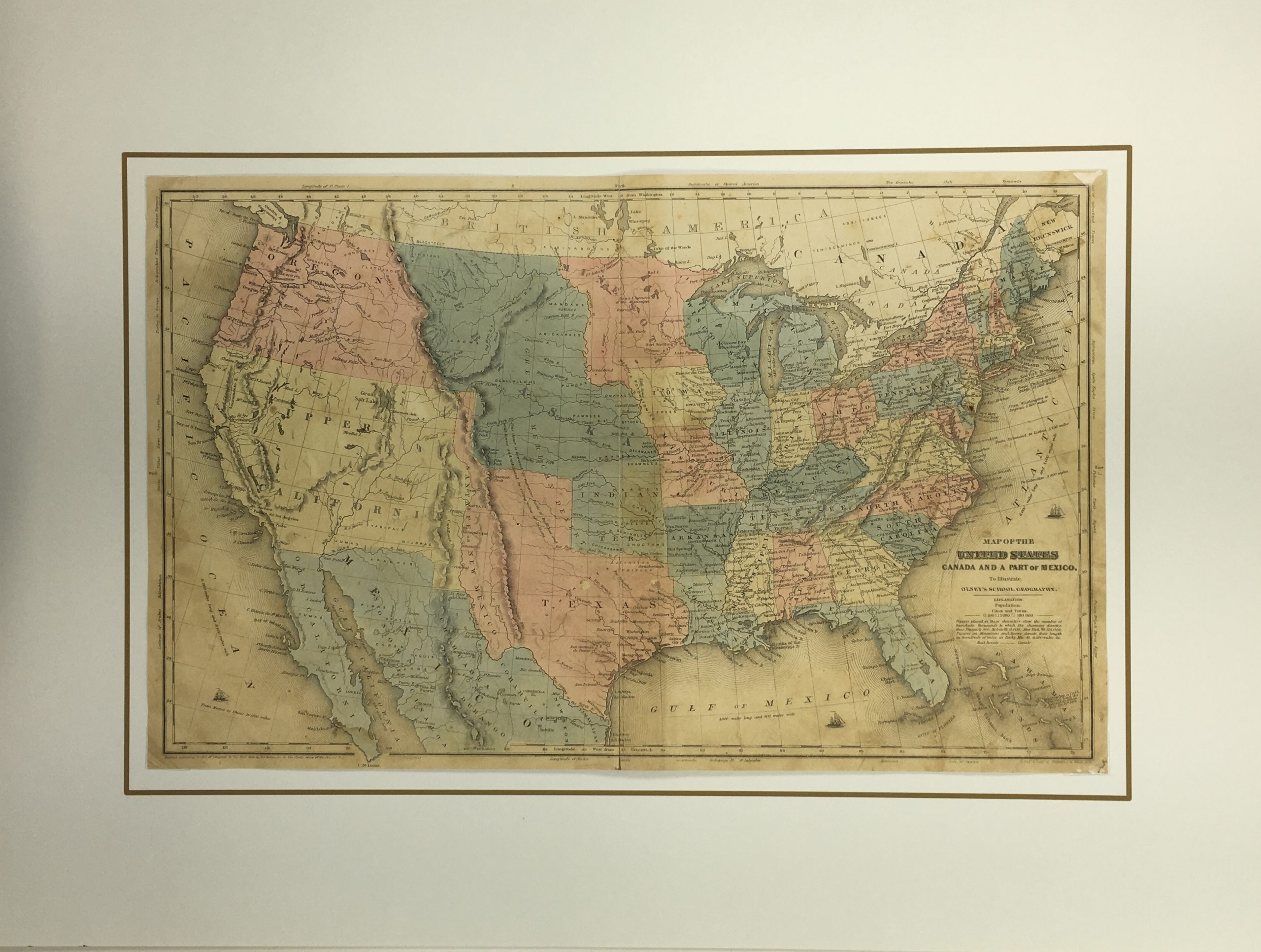 Antique Map on paper displayed on a white mat with a gold border. Mat fits a standard-size frame. Archival plastic sleeve and Certificate of Authenticity included. Antique Map, 18.1″W x 11.1″H; mat, 24″W x 18″H.