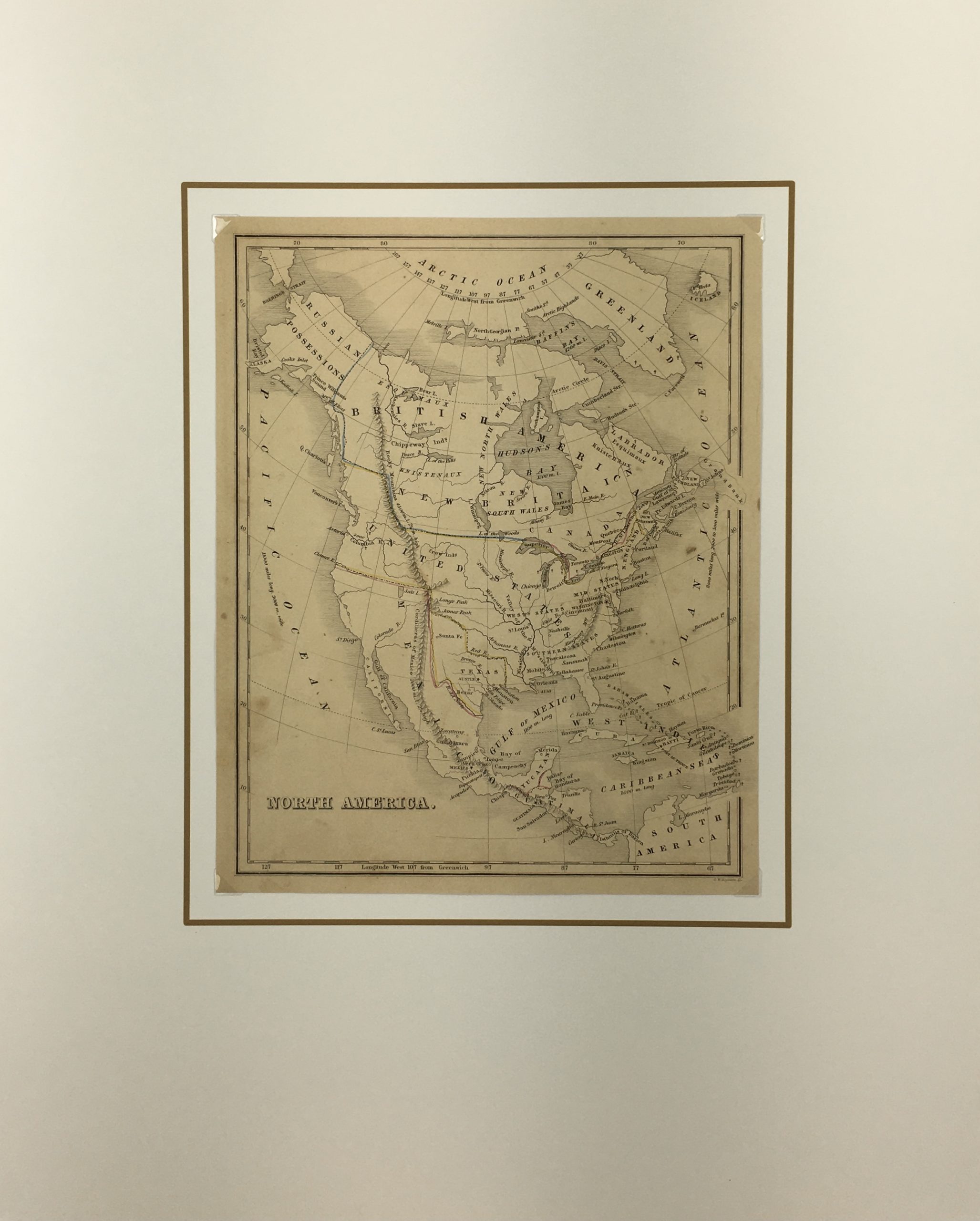 Antique Map on paper displayed on a white mat with a gold border. Mat fits a standard-size frame. Archival plastic sleeve and Certificate of Authenticity included. Antique Map, 8.8″W x 11″H; mat, 16″W x 20″H.