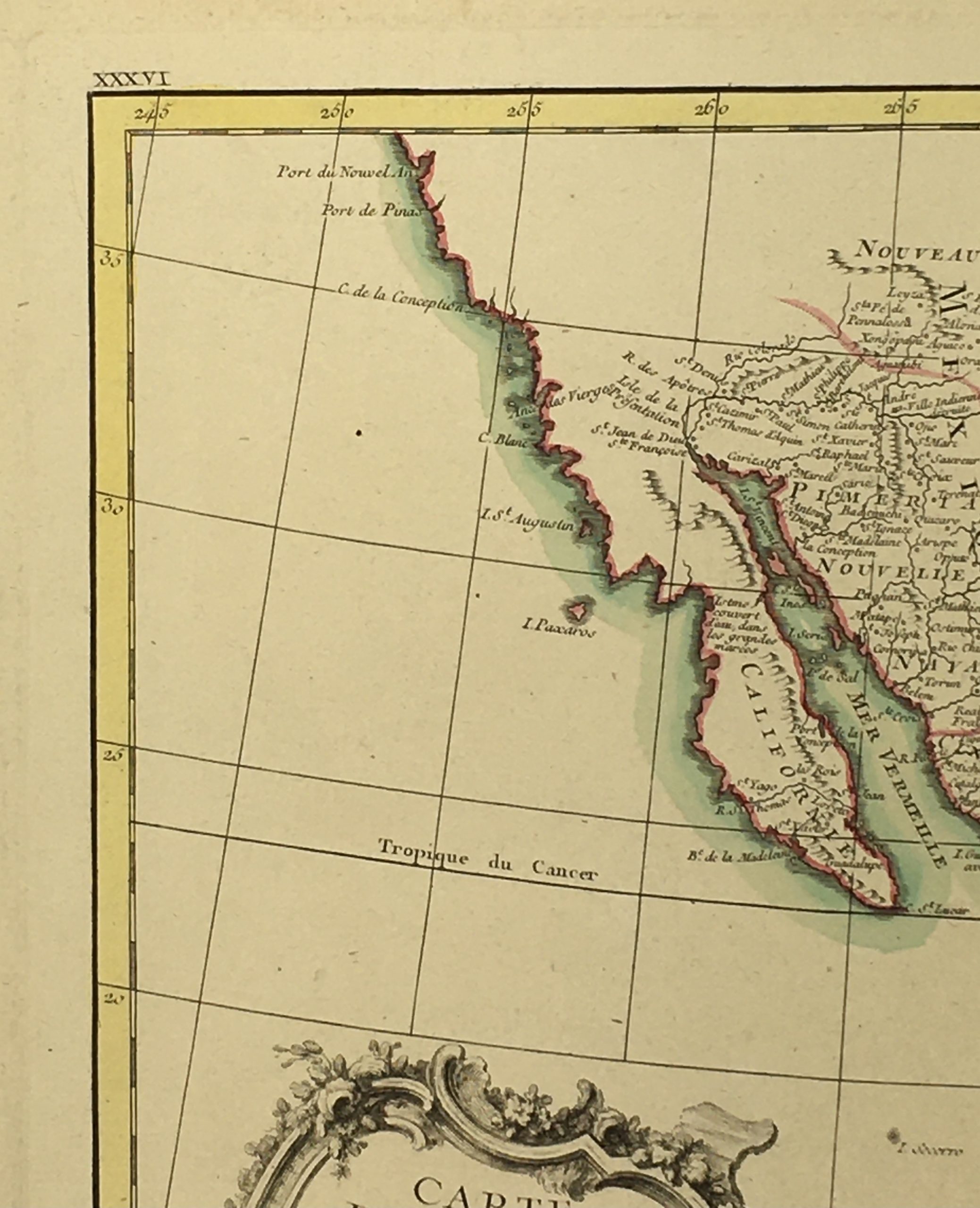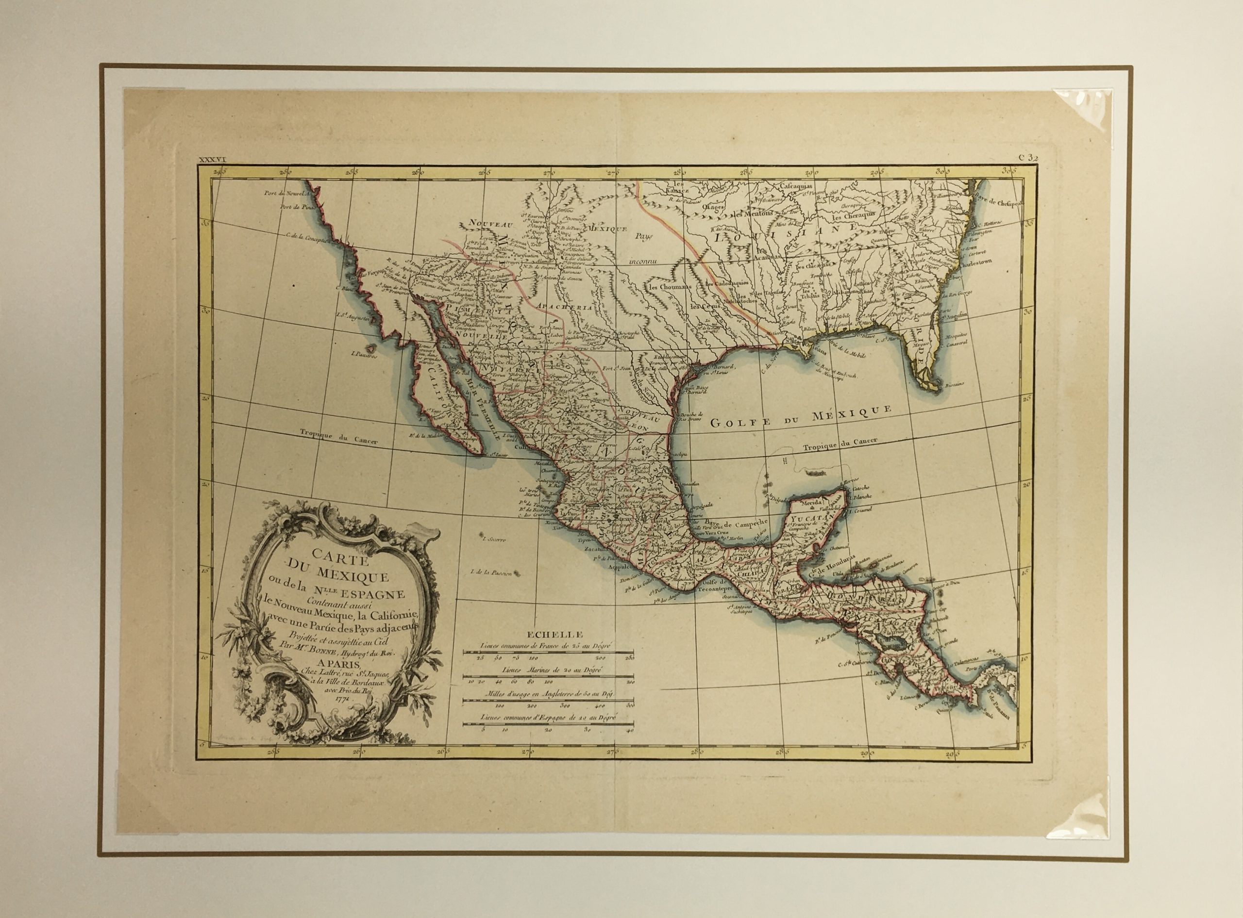Antique Map on paper displayed on a white mat with a gold border. Mat fits a standard-size frame. Archival plastic sleeve and Certificate of Authenticity included. Antique Map, 19″W x 14.2″H; mat, 24″W x 18″H.