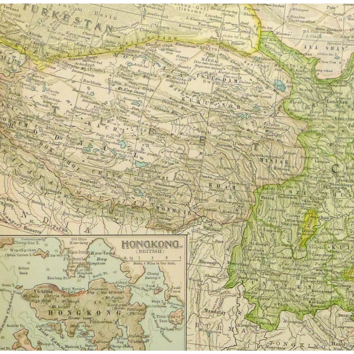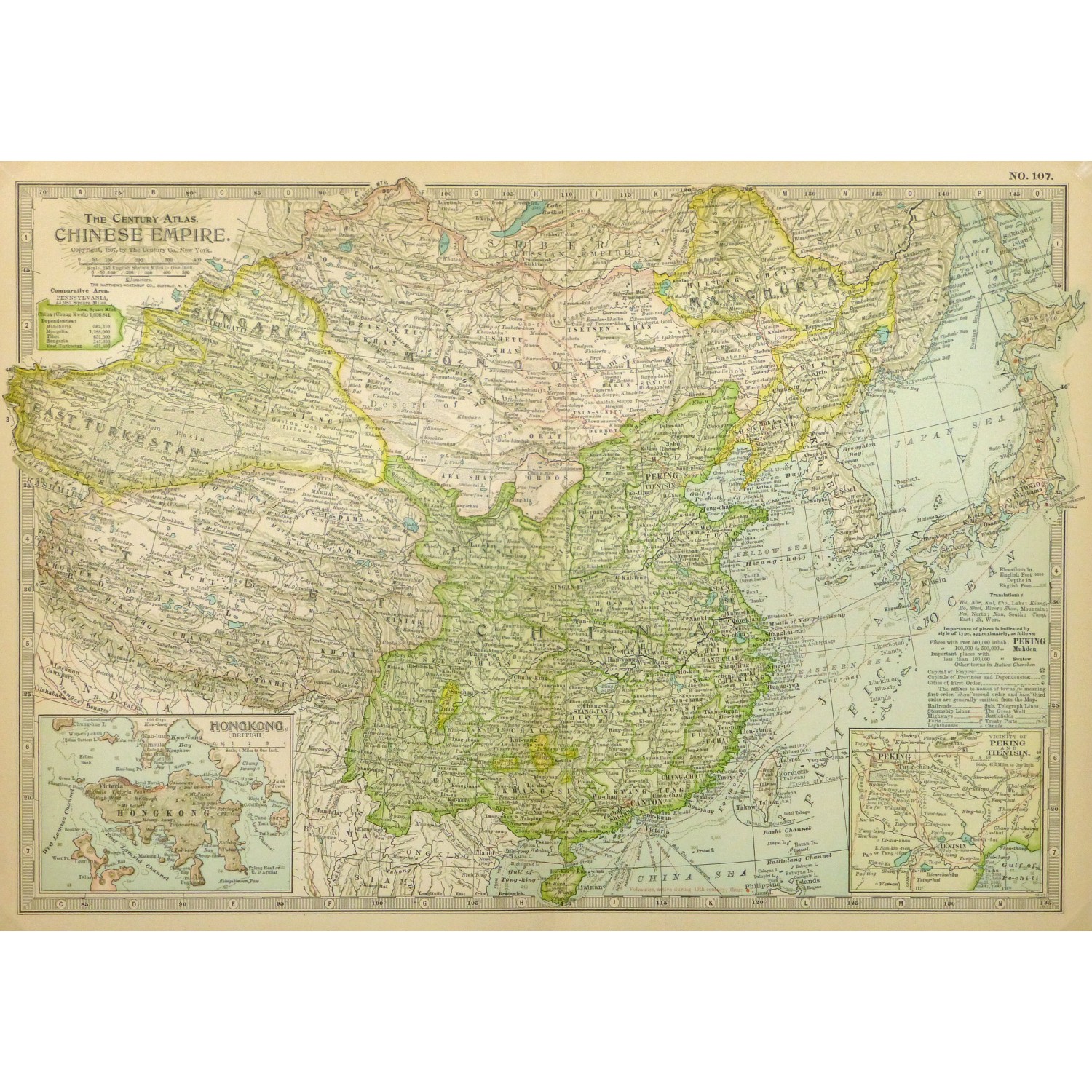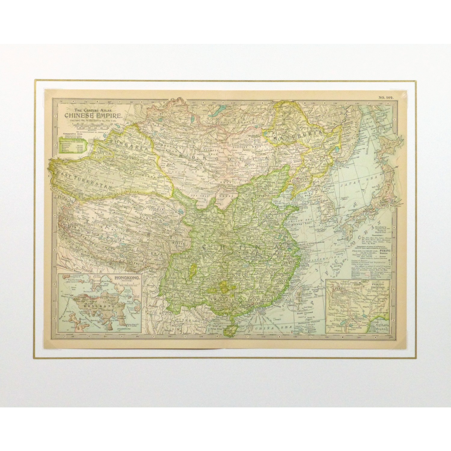 Exceptional and detailed antique map of the Chinese Empire, includes insets of Hong Kong and Peking from Century Atlas, 1897.