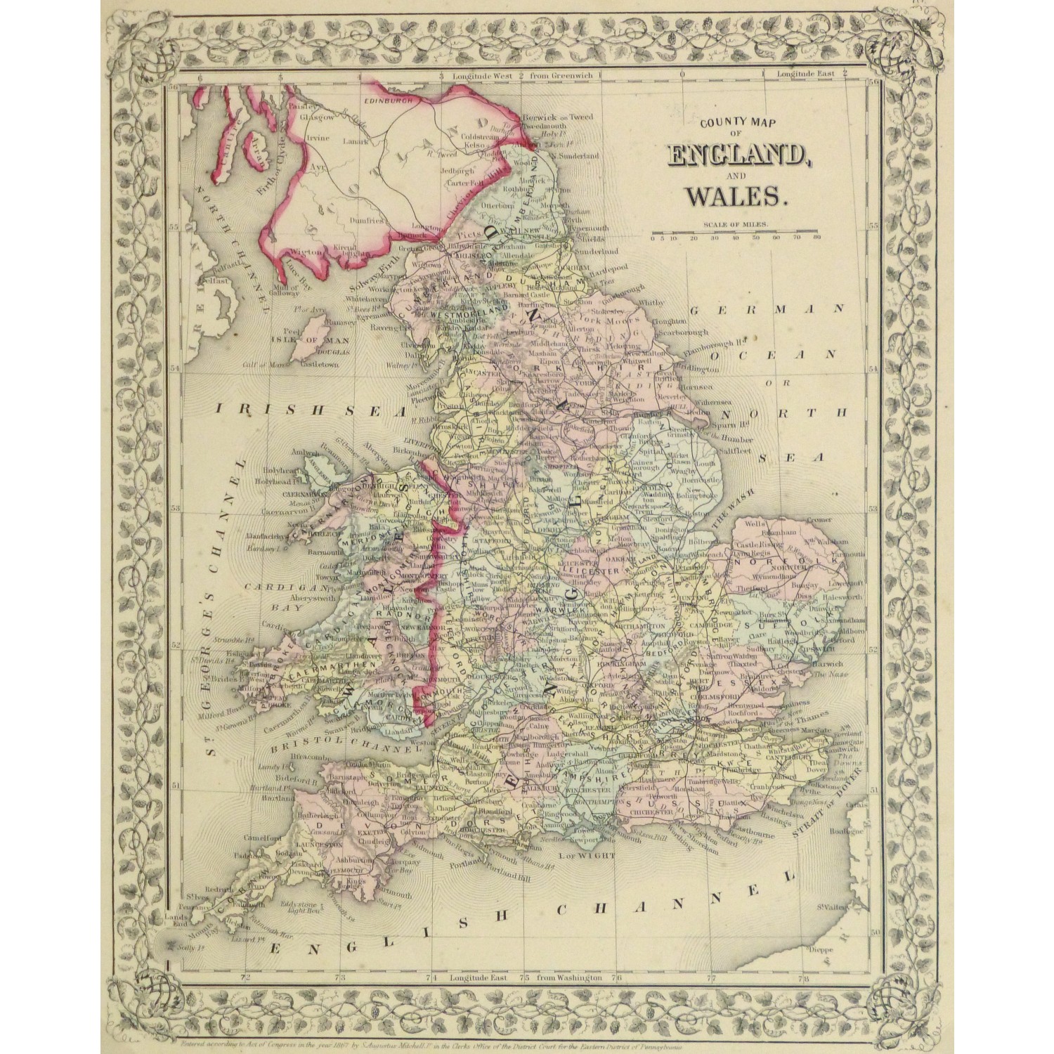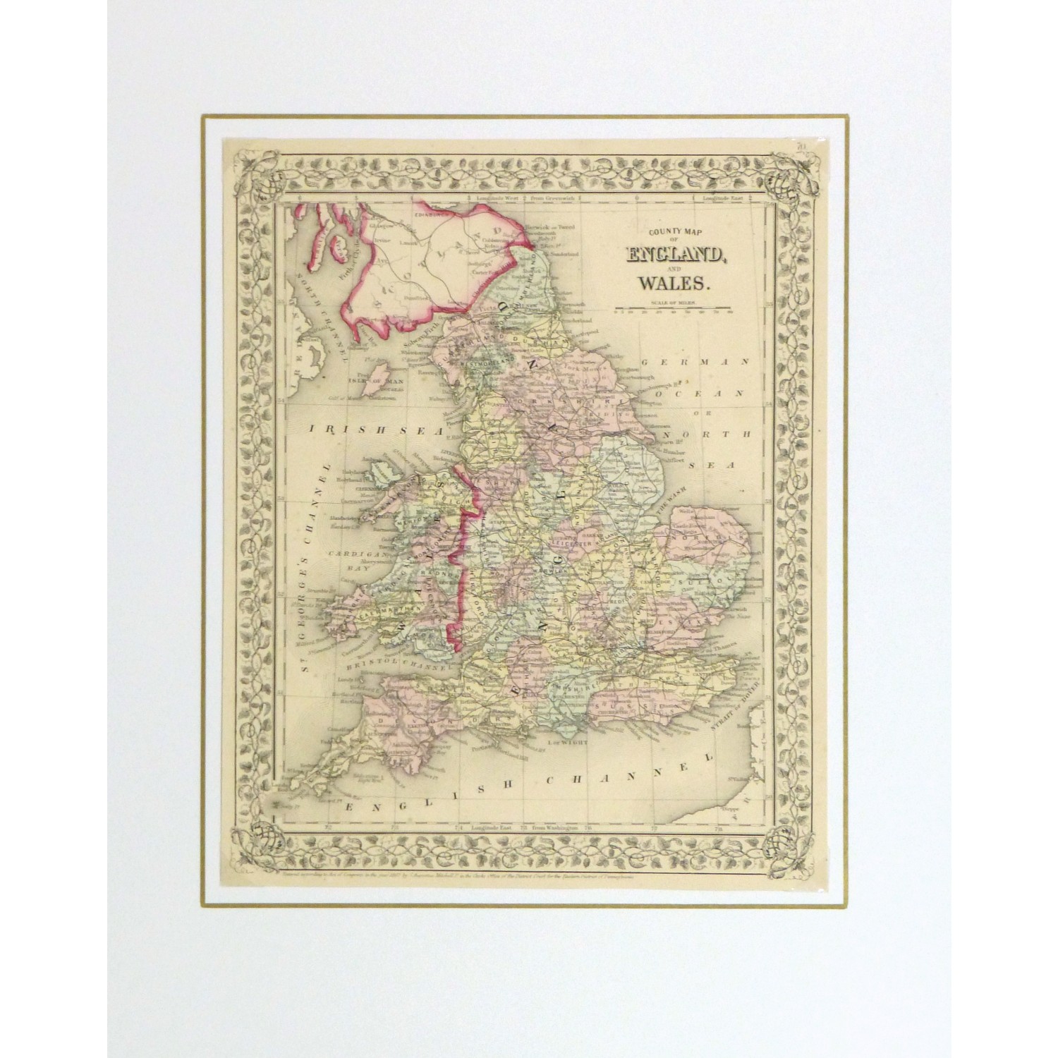 Beautifully detailed and colorful antique map of England and Wales by Mitchell, 1867.