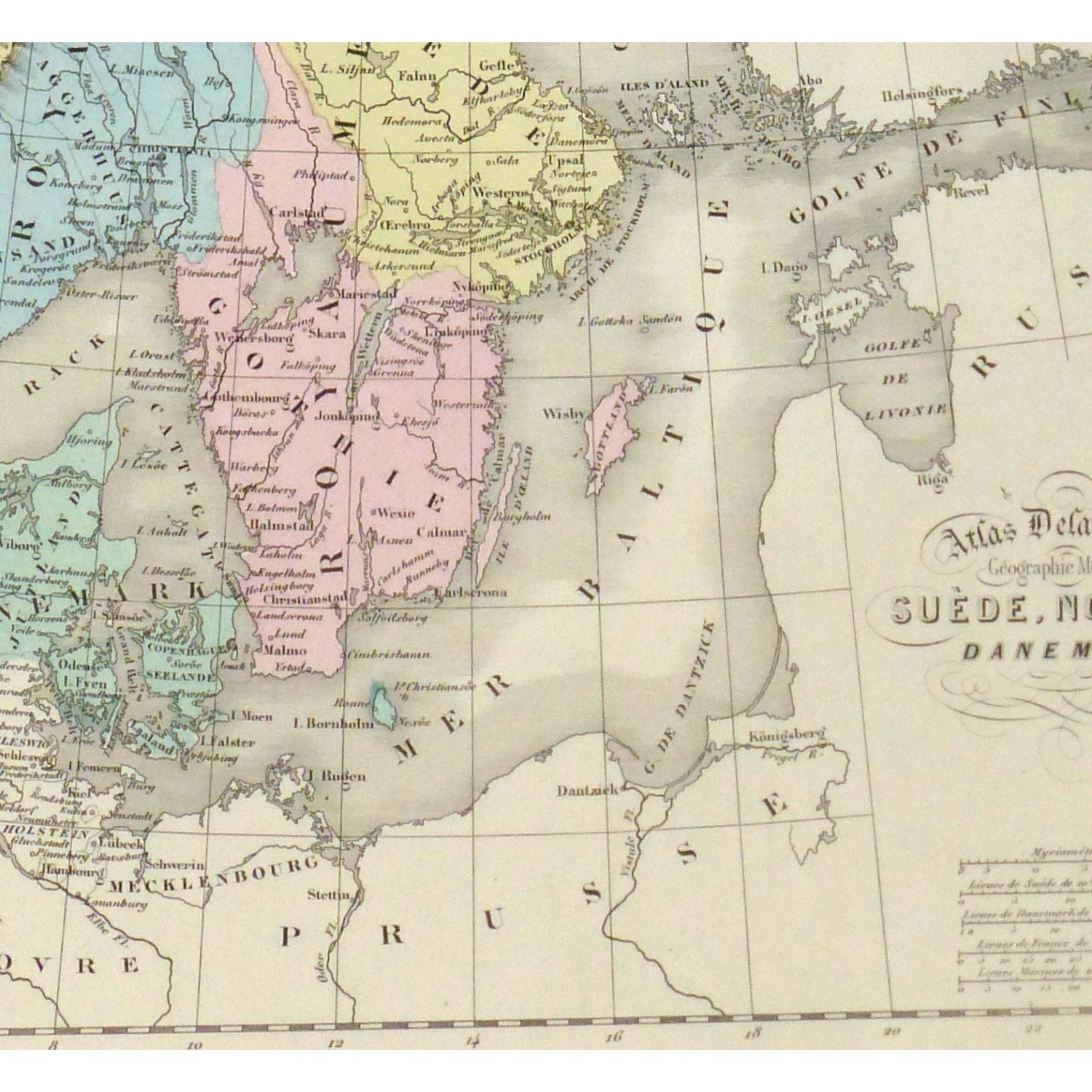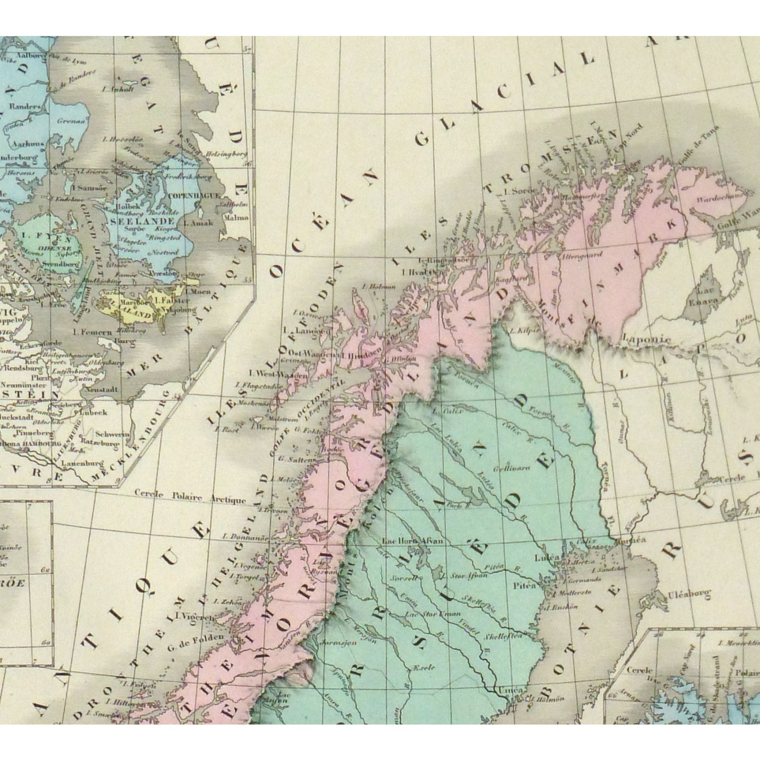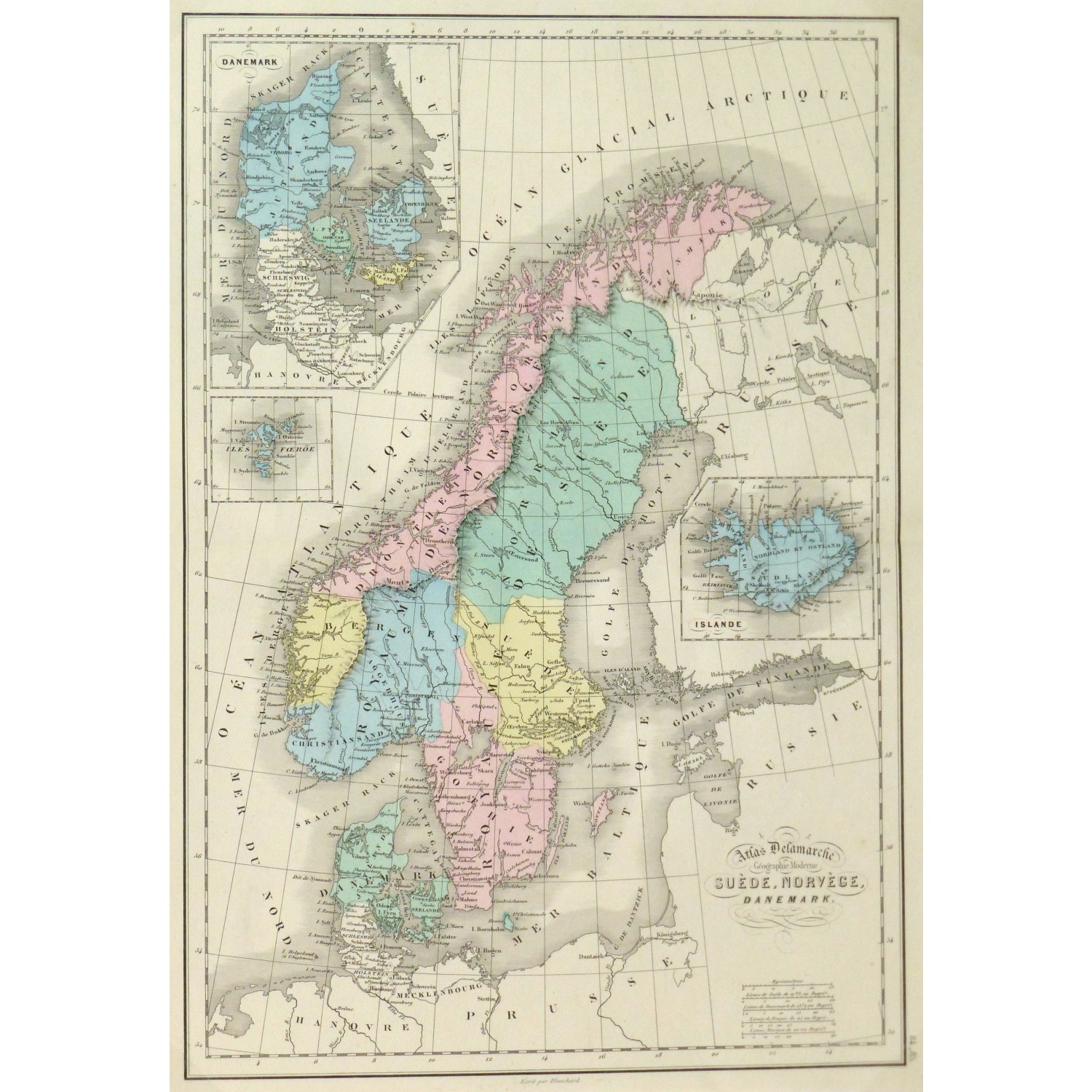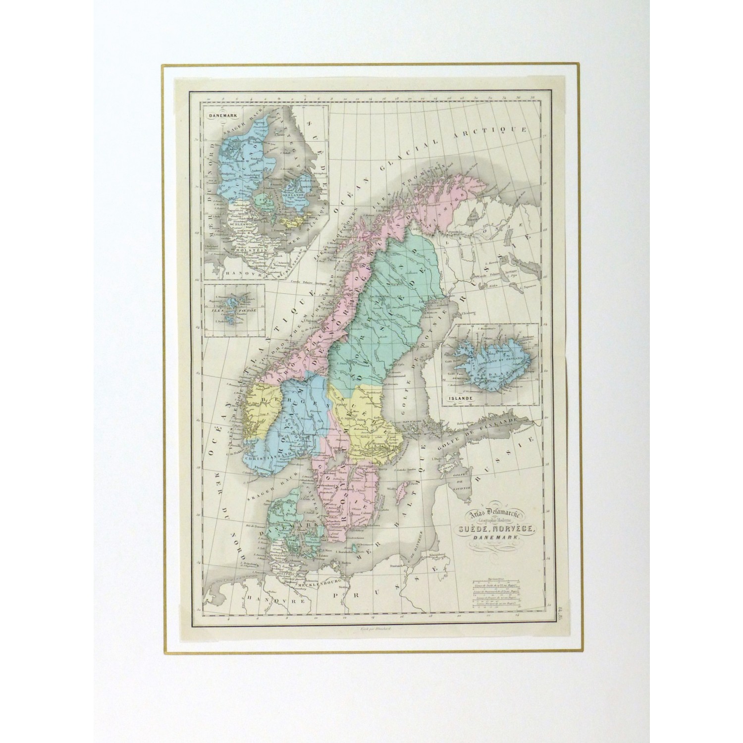 Colorful and finely detailed antique map of Sweden and Norway including insets of Denmark and Iceland by French mapmaker Delamarche, 1873.