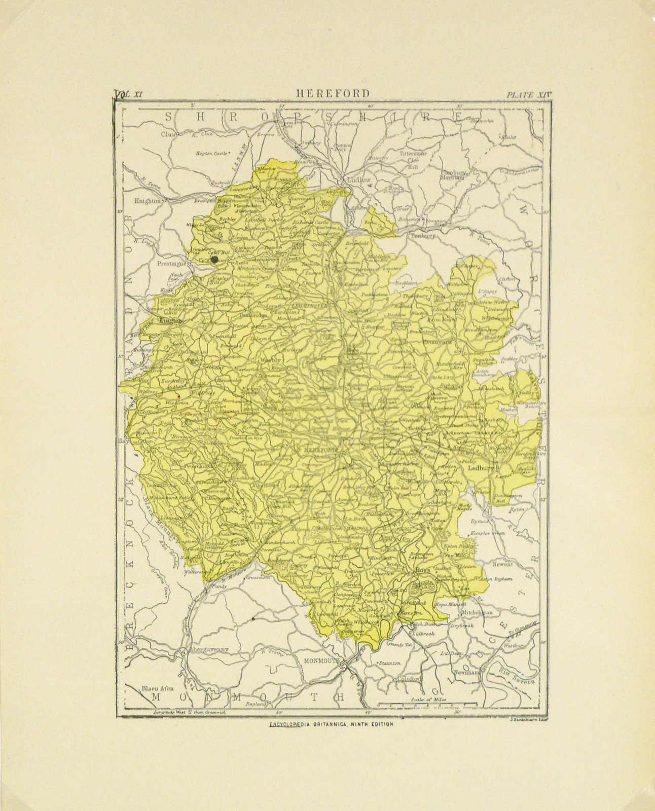 Antique map of Hereford, England from circa 1880. Shows county and towns.