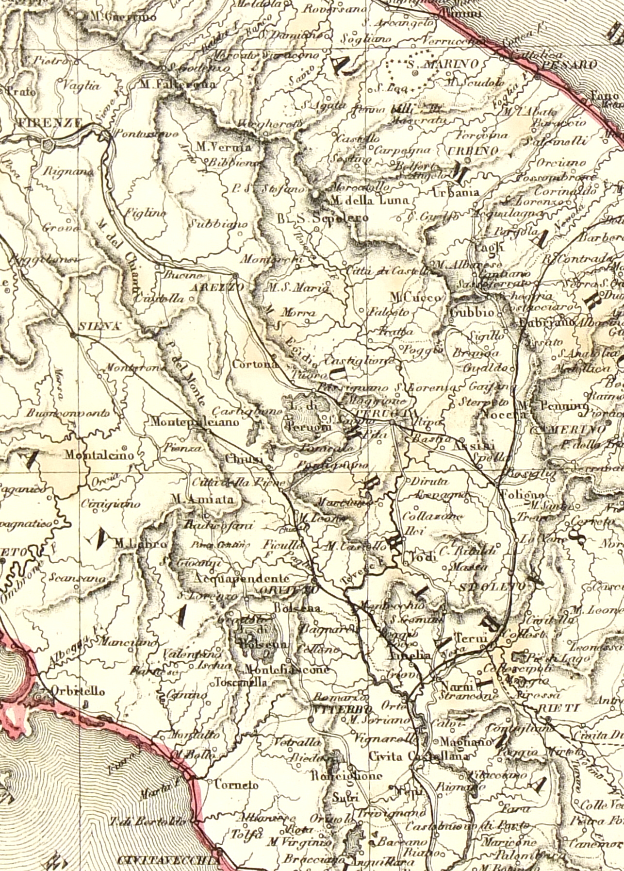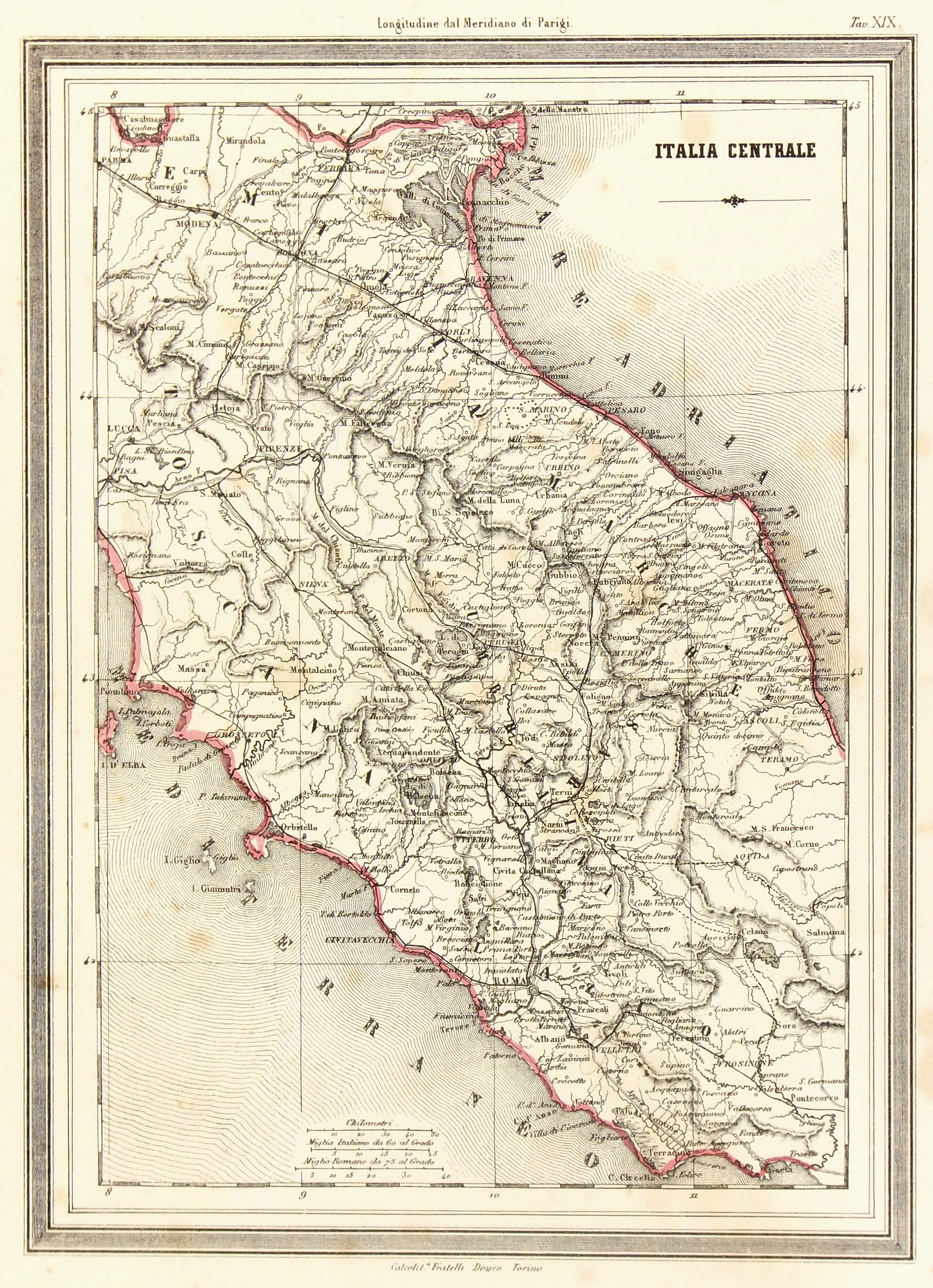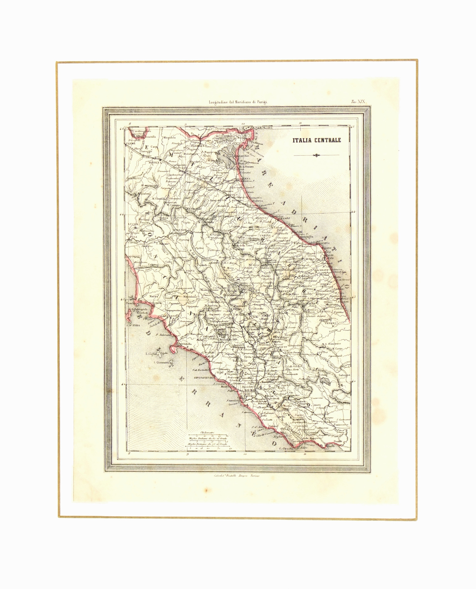 Italian antique engraving of central Italy by Marmocchi, 1885. Shows provinces, mountains, transport, and towns. Original hand-color outlines.
