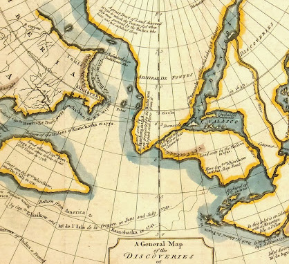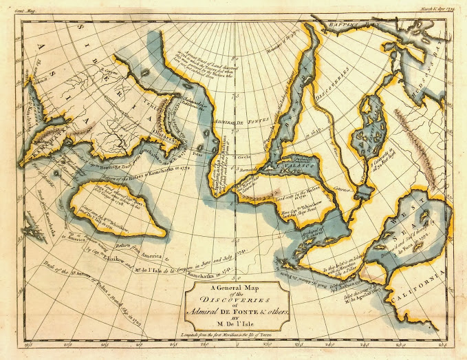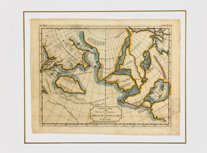Hand-colored original engraving of the American Northwest by Royal cartographer De L’Isle from a scarce English edition, 1754. Pre-dates explorations by Captain James Cook therefore showing speculations of a possible water passage through the North American continent and other apocryphal elements. Note voyage of Admiral de Fonte. Many interesting annotations throughout.