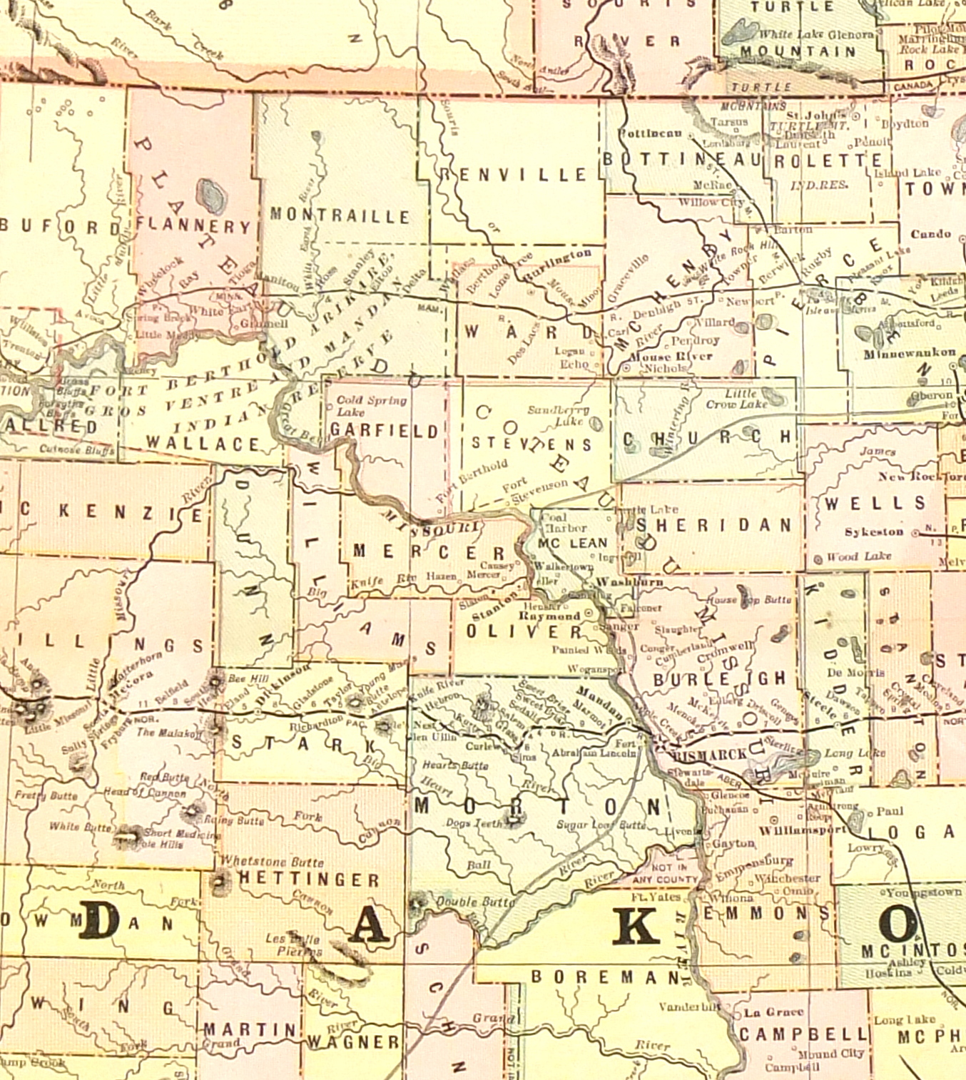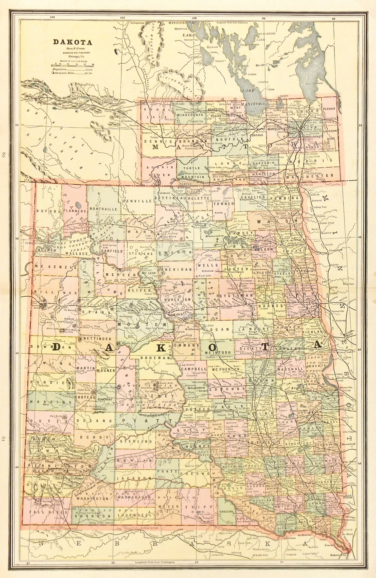 Color engraving of a single Dakota Territory encompassing current North and South Dakota before 1889 statehood, circa 1885. Shows railroads, counties, rivers and towns.