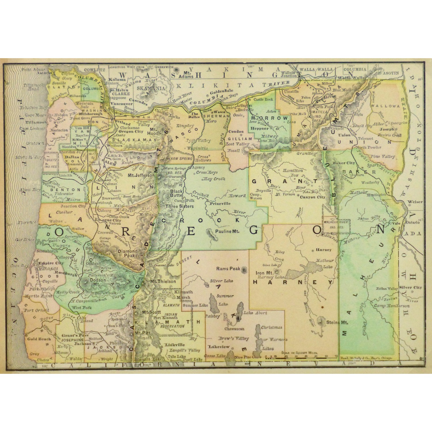 Brightly accented antique map of the state of Oregon from Encyclopedia Britannica, 1891. Shows counties, railroads, rivers and towns.