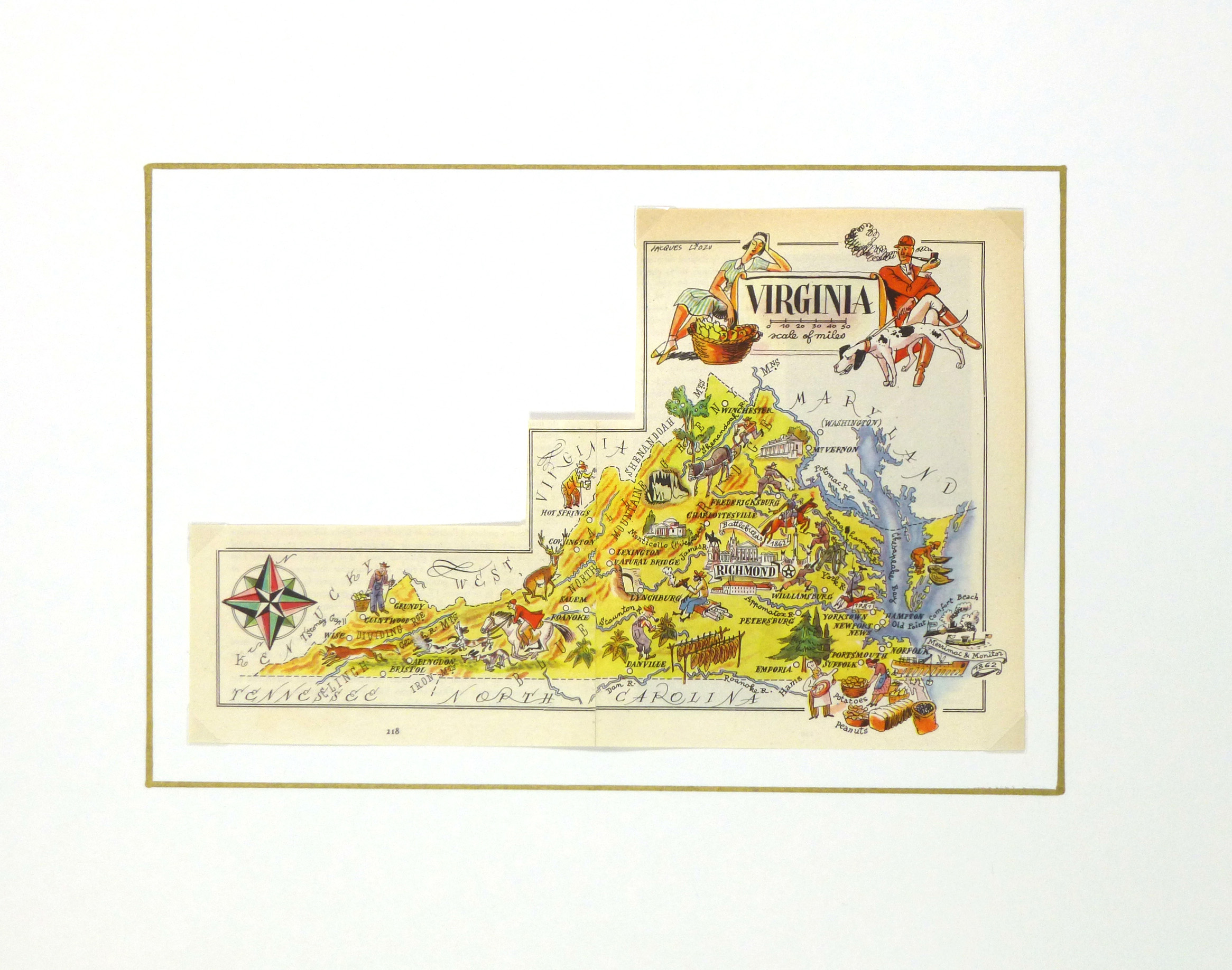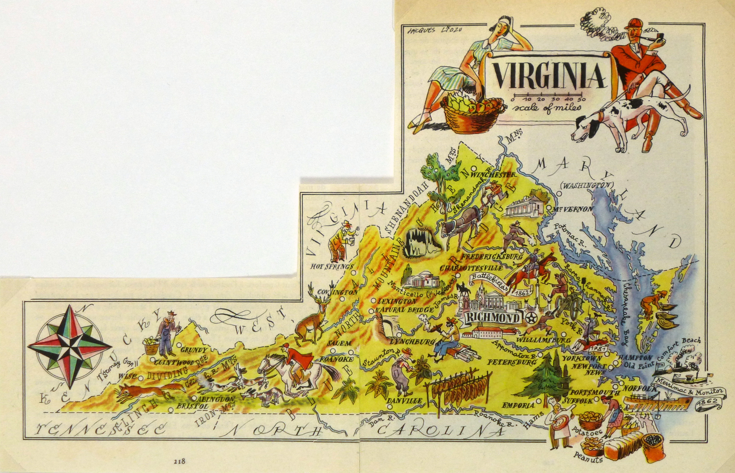 Bright and colorful pictorial map of Virginia from 1946. Note many historical and cultural sites depicted in playful designs, adorned with amusing title cartouche.