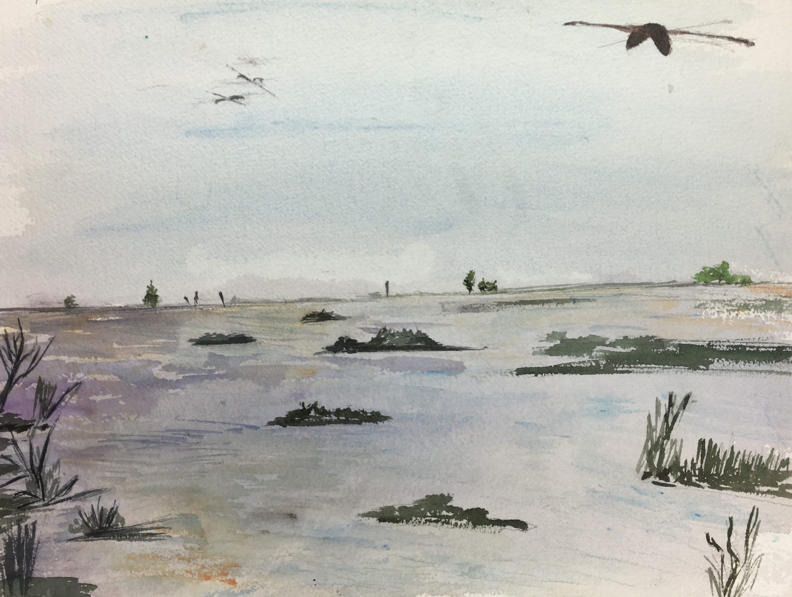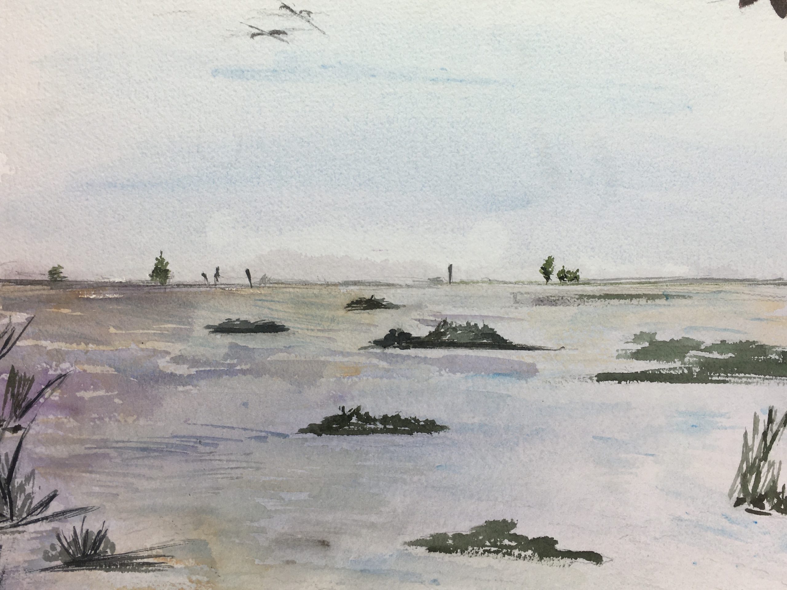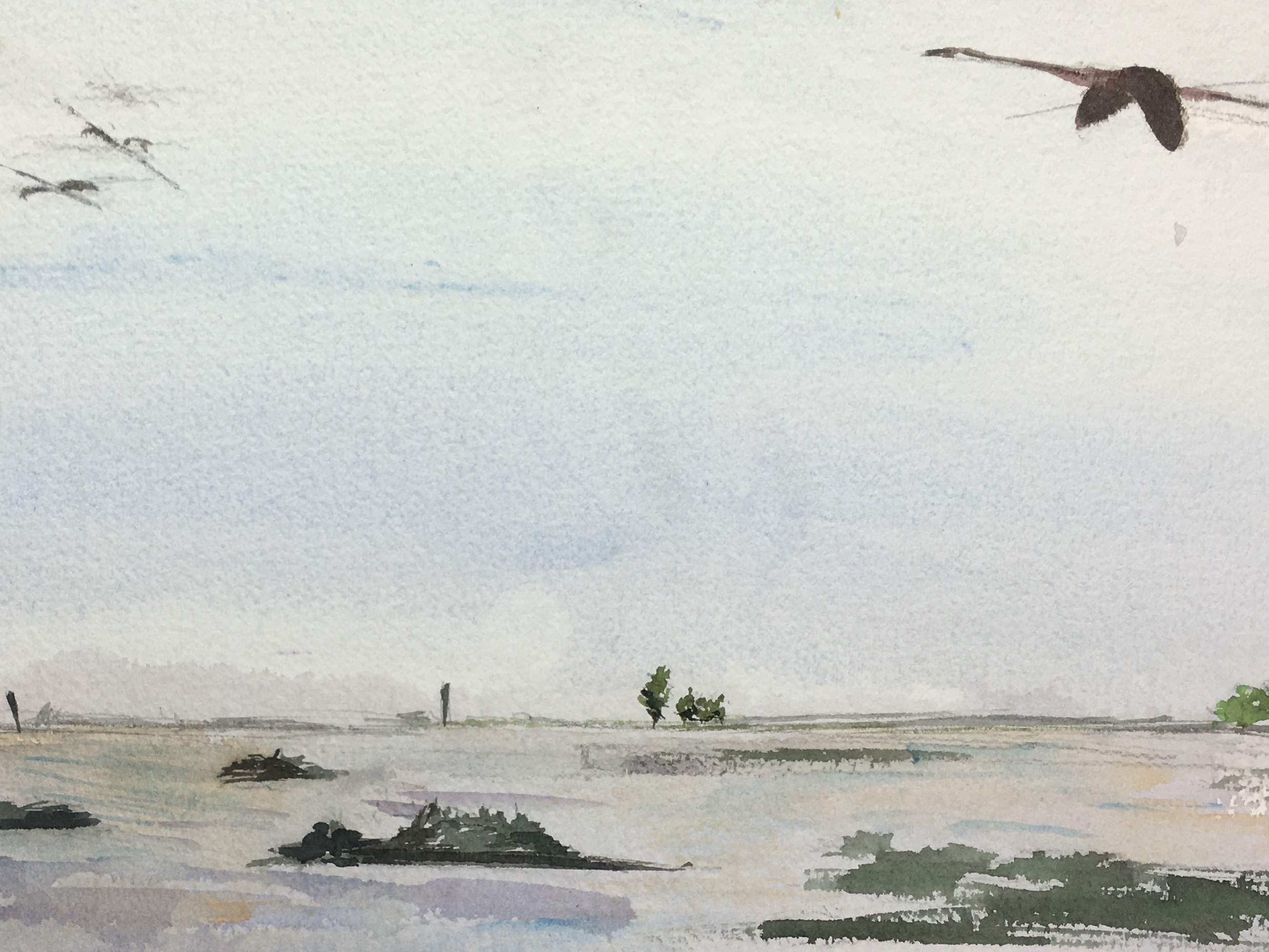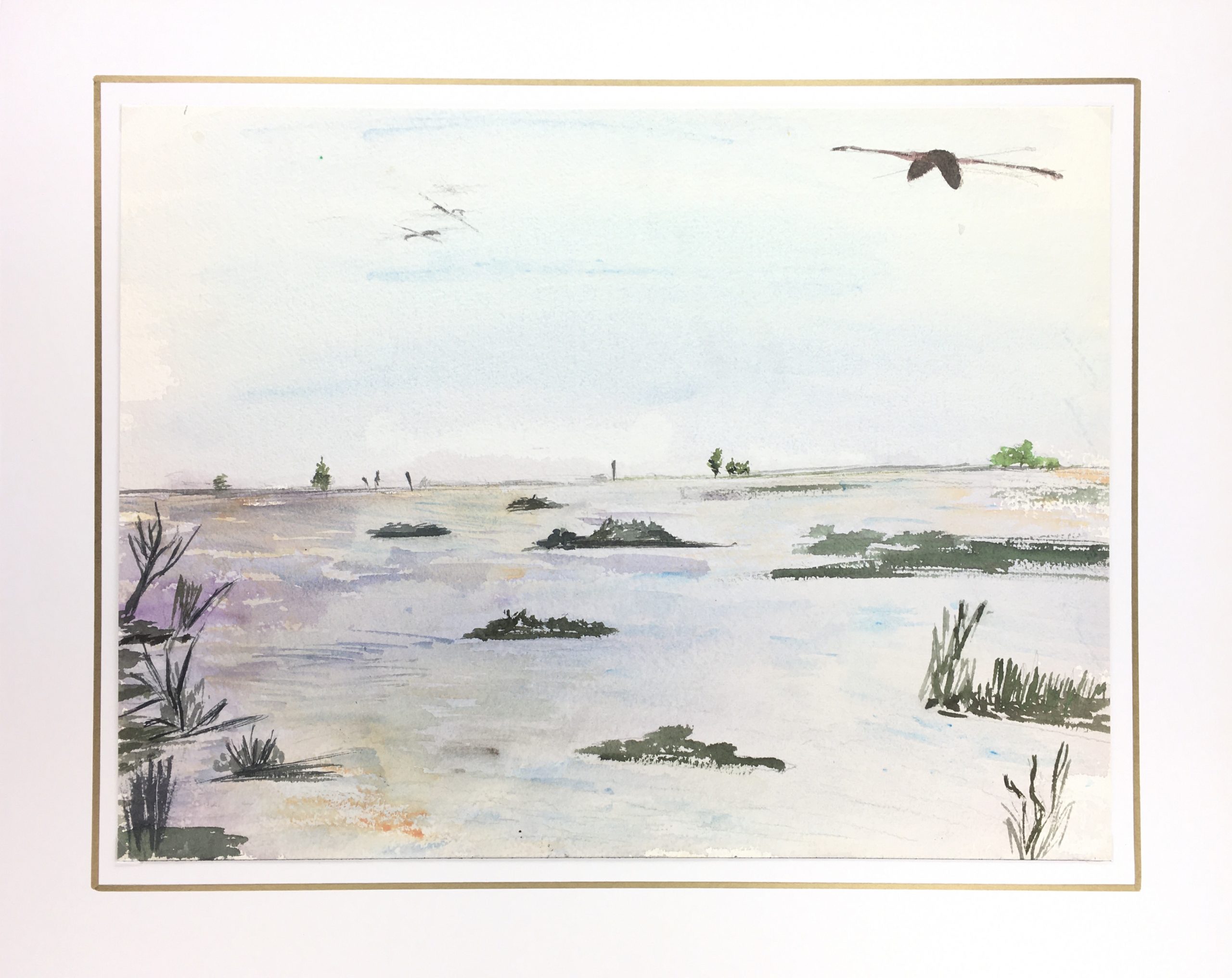 Original Art on paper displayed on a white mat with a gold border. Mat fits a standard-size frame. Archival plastic sleeve and Certificate of Authenticity included. Original Art, 16″W x 12″H; mat, 16″W x 20″H.