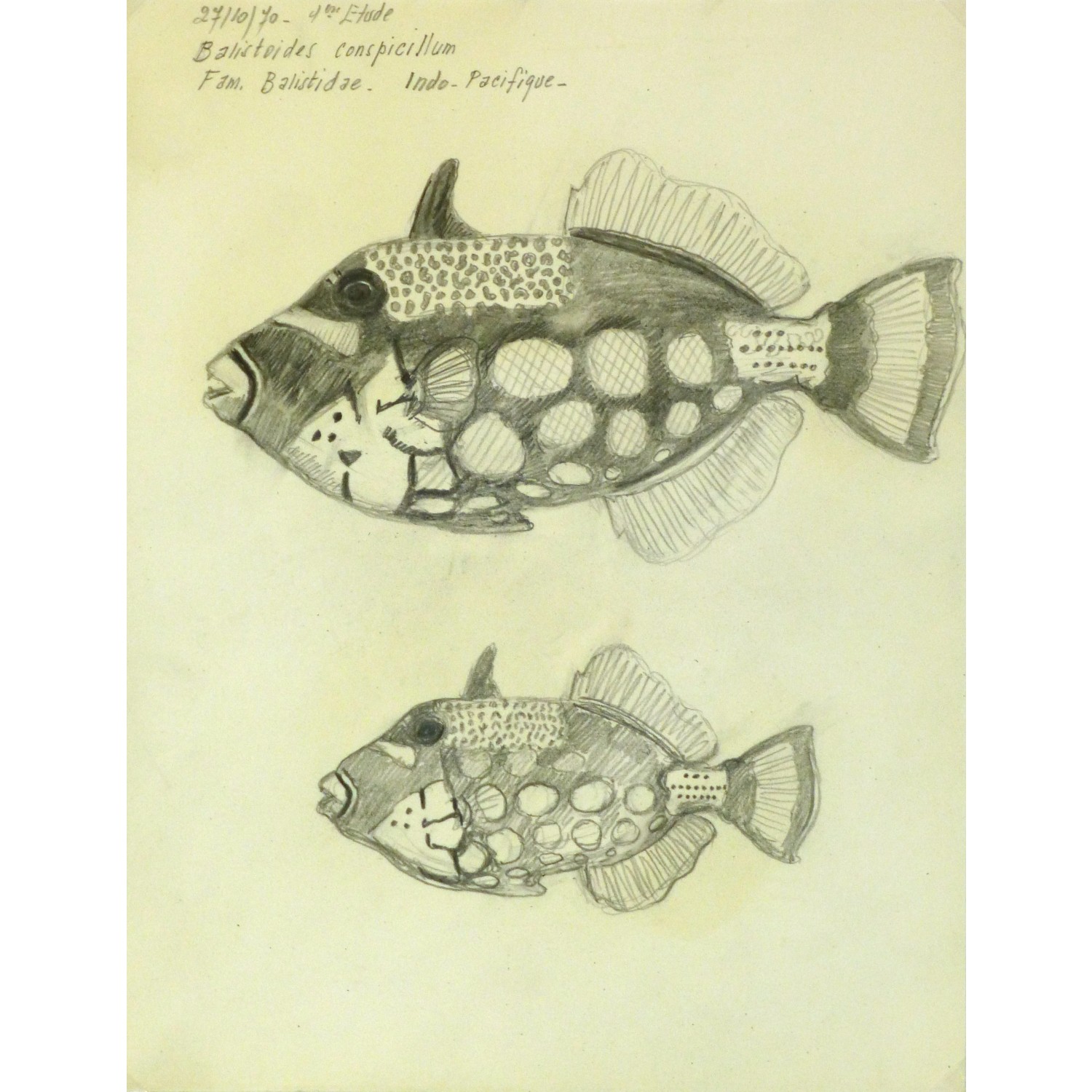 Excellent French pencil sketch of the clown triggerfish, a colorful reef fish by Marcel Bourgeois, 1970.Dated upper left.