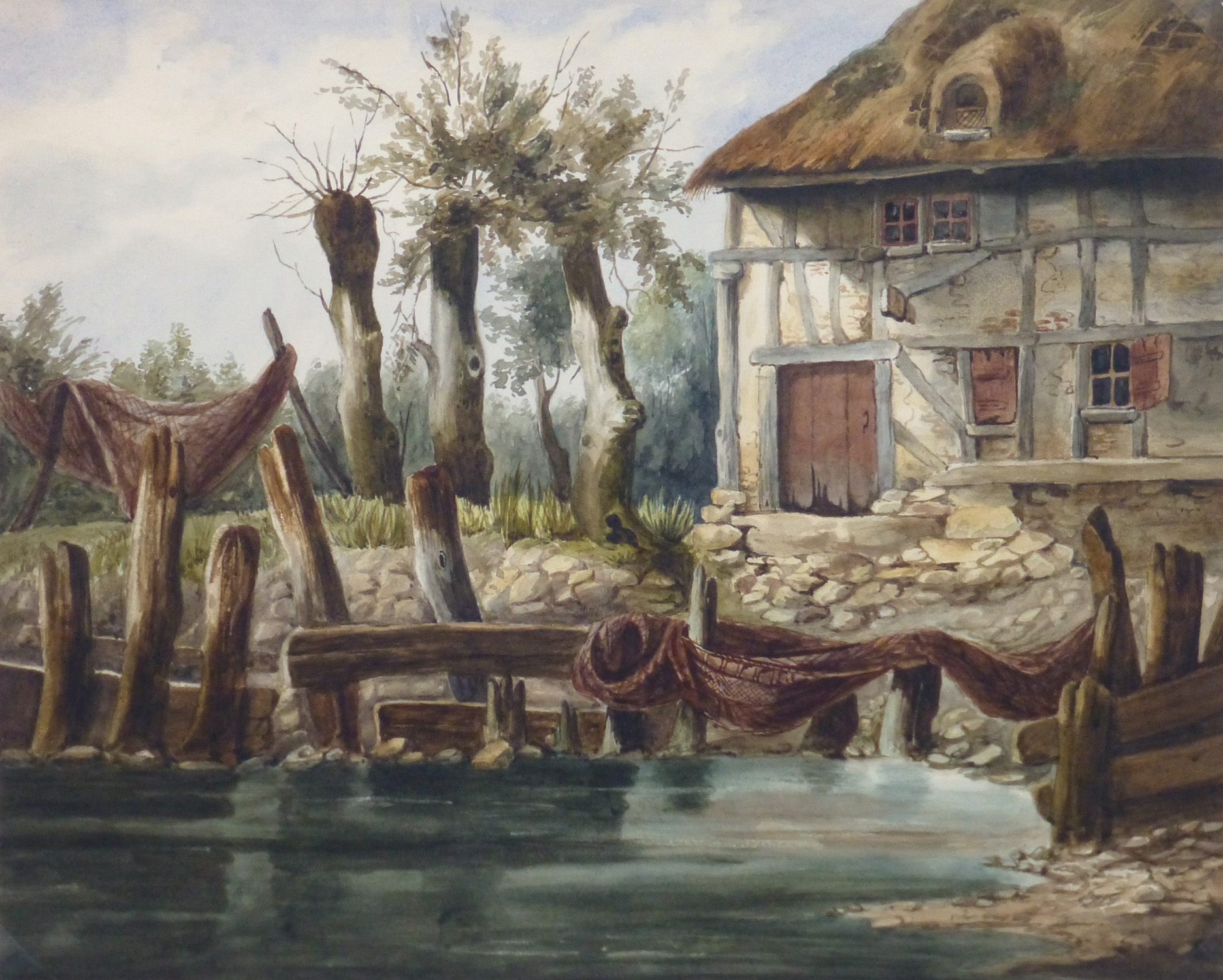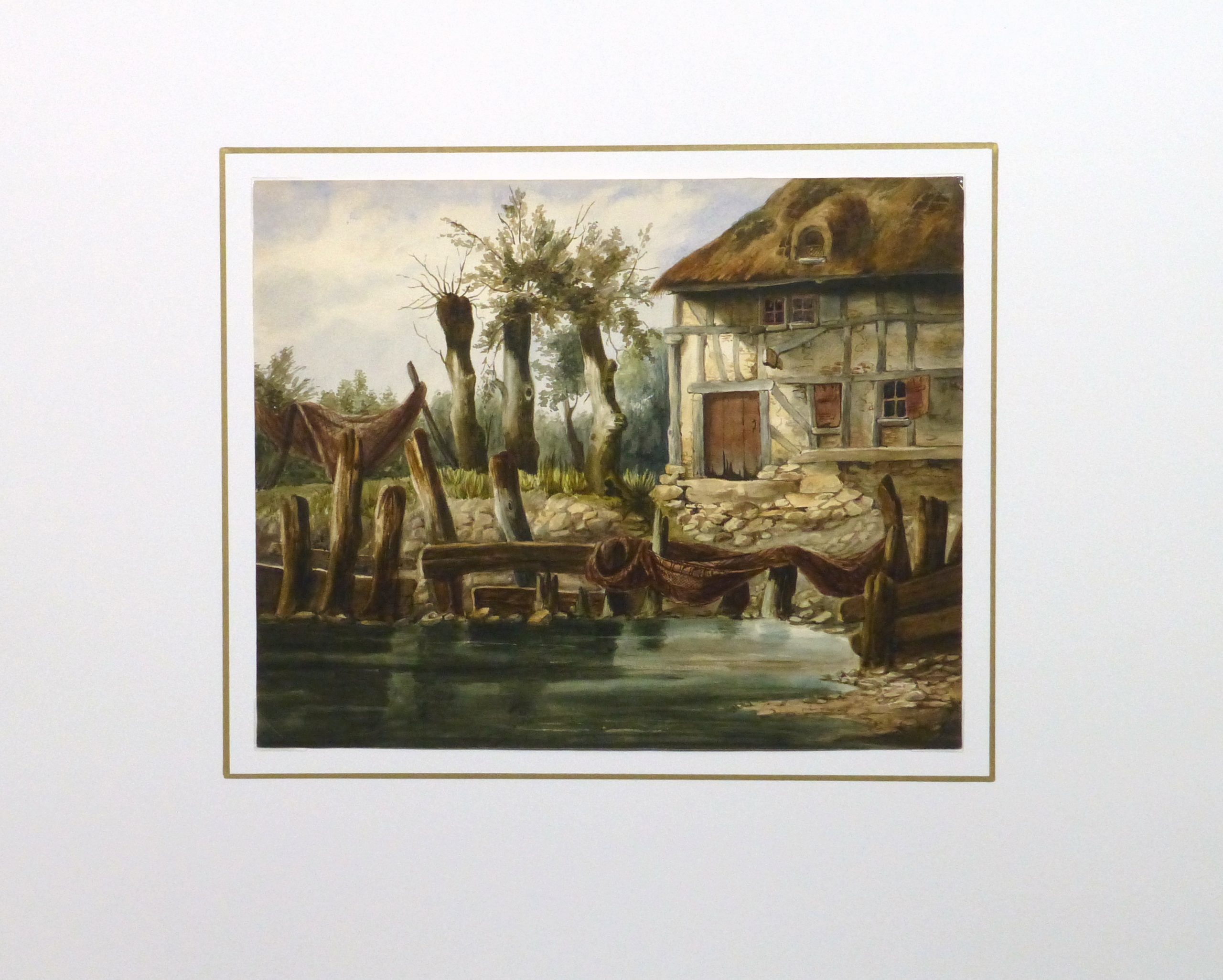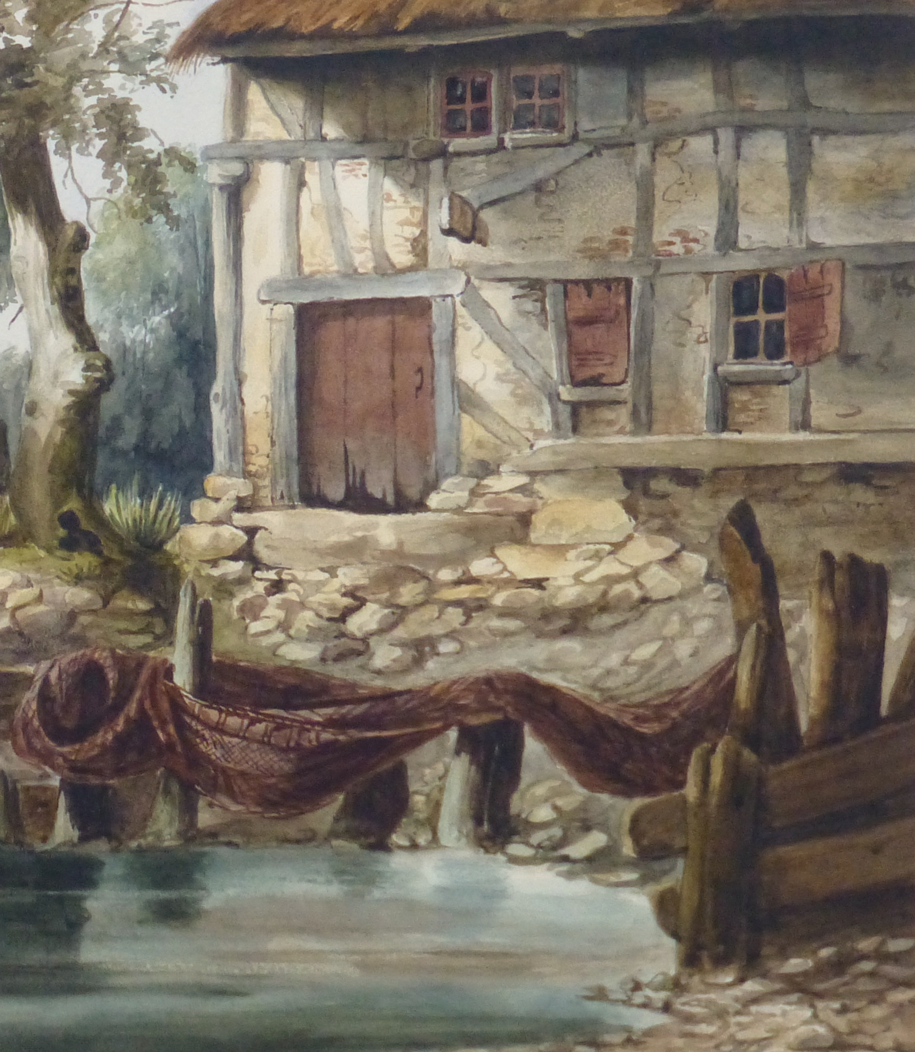 Detailed French gouache and watercolor of a fisherman’s small but quaint cottage overlooking the water by Antonin, circa 1870. Unsigned.