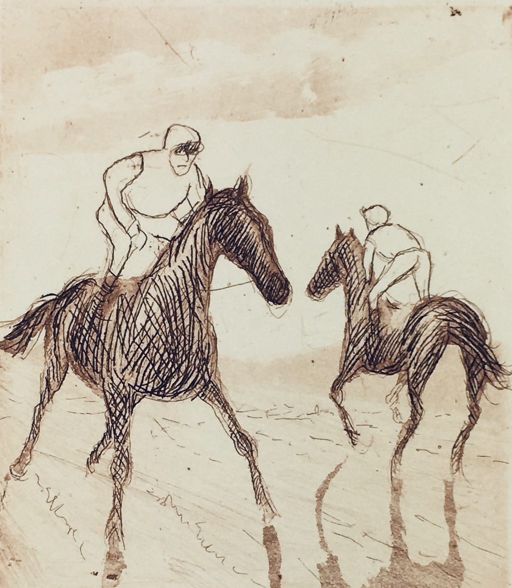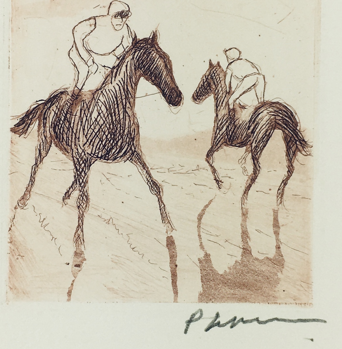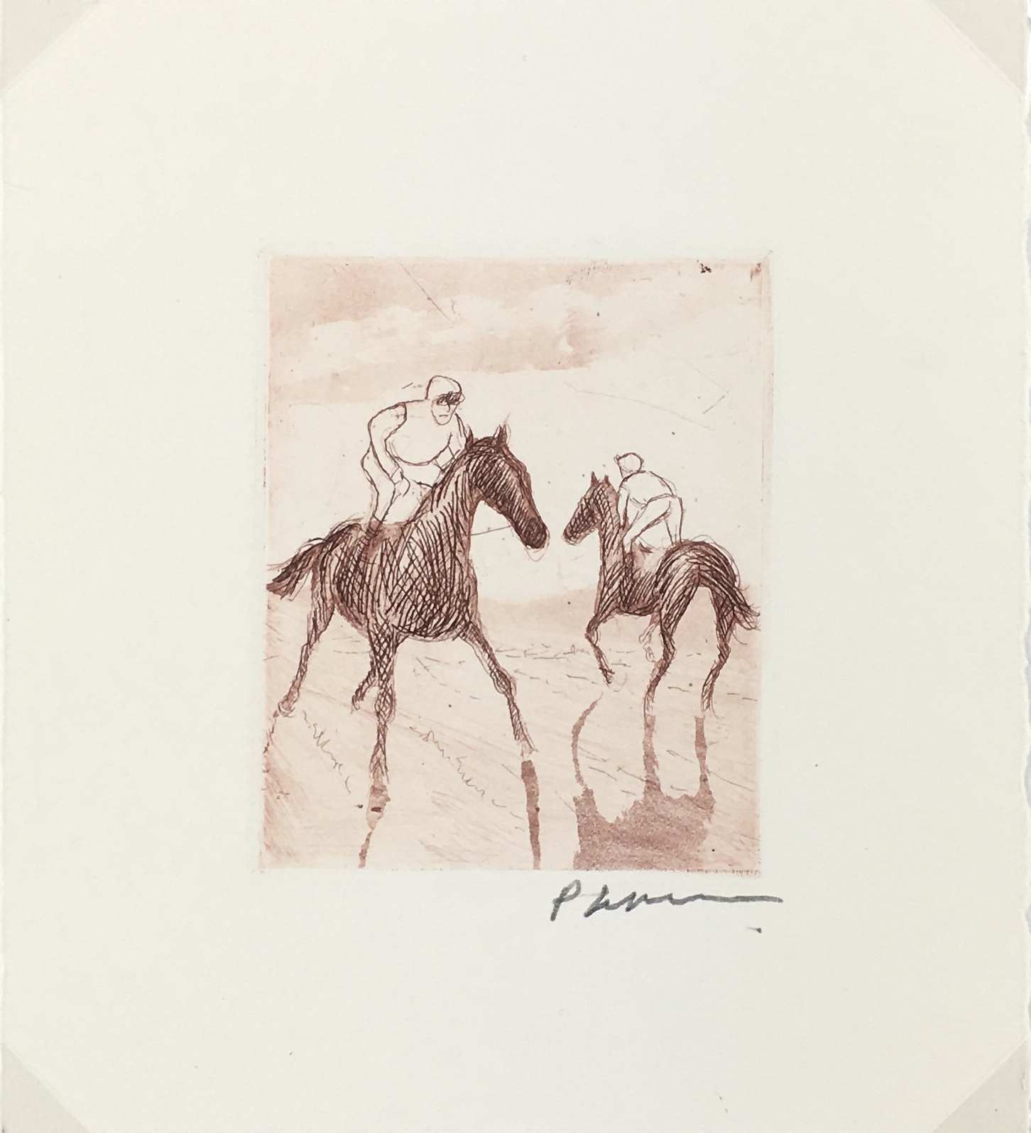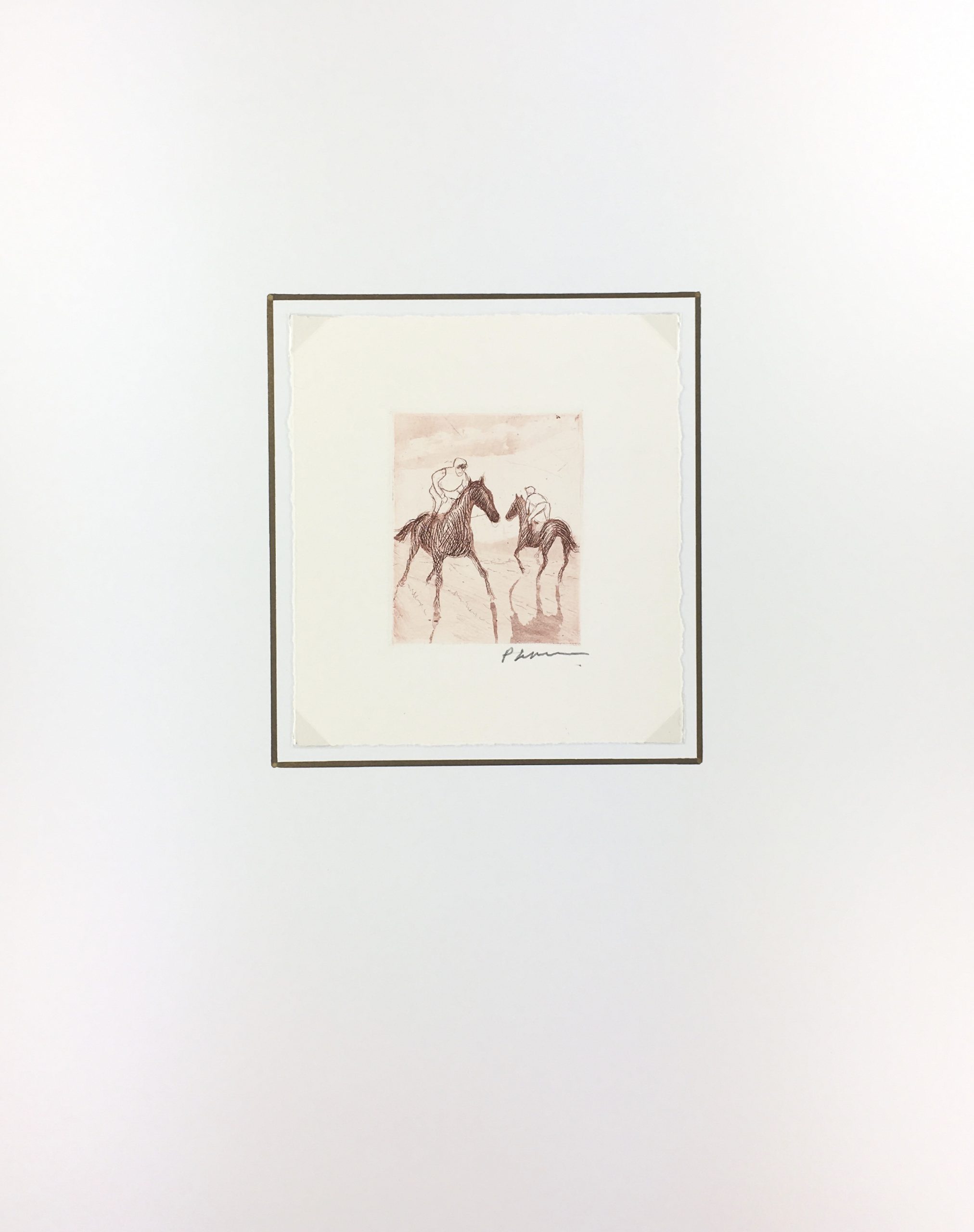 Original Art on paper displayed on a white mat with a gold border. Mat fits a standard-size frame. Archival plastic sleeve and Certificate of Authenticity included. Original Art, 6.25″W x 7″H; mat, 16″W x 20″H.