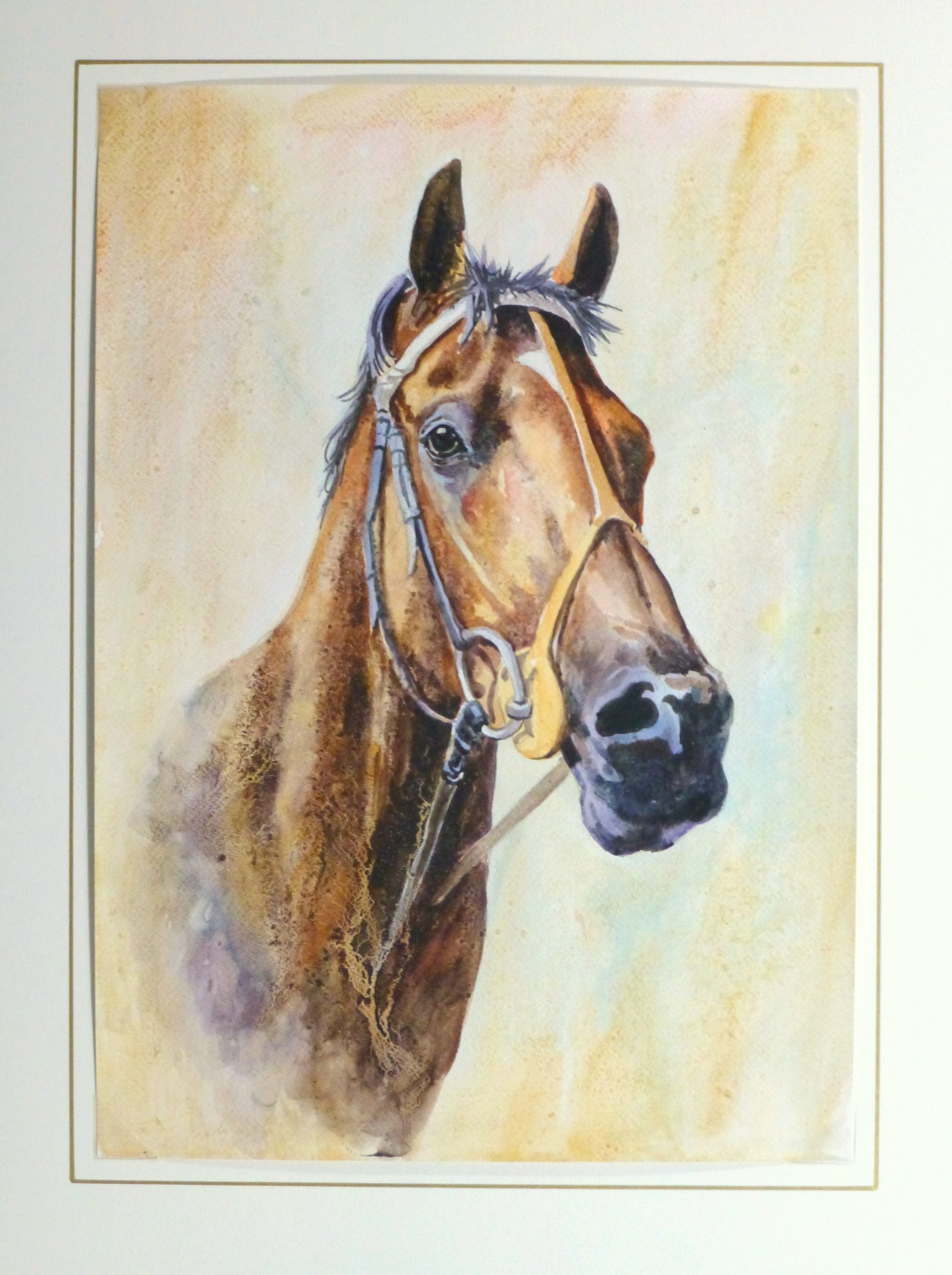 Splendid and warmly hued watercolor portrait of a handsome, chestnut colored horse, 2011.