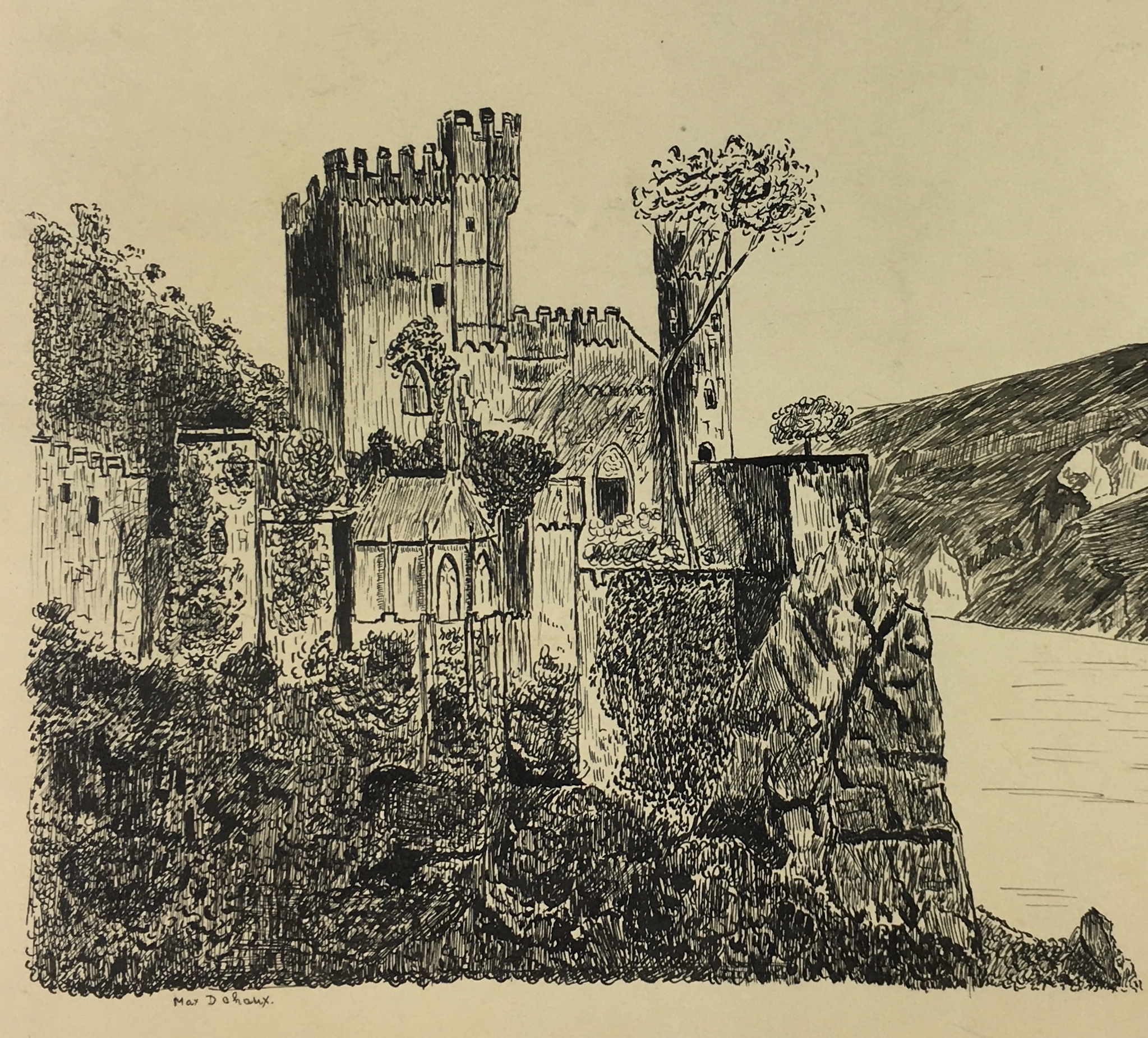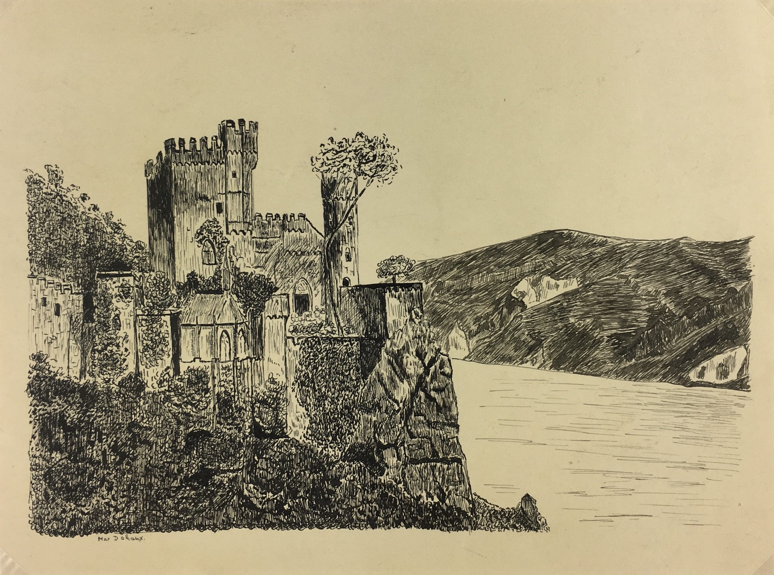 Original Art on paper displayed on a white mat with a gold border. Mat fits a standard-size frame. Archival plastic sleeve and Certificate of Authenticity included. Original Art, 9.25″W x 7″H; mat, 16″W x 20″H.