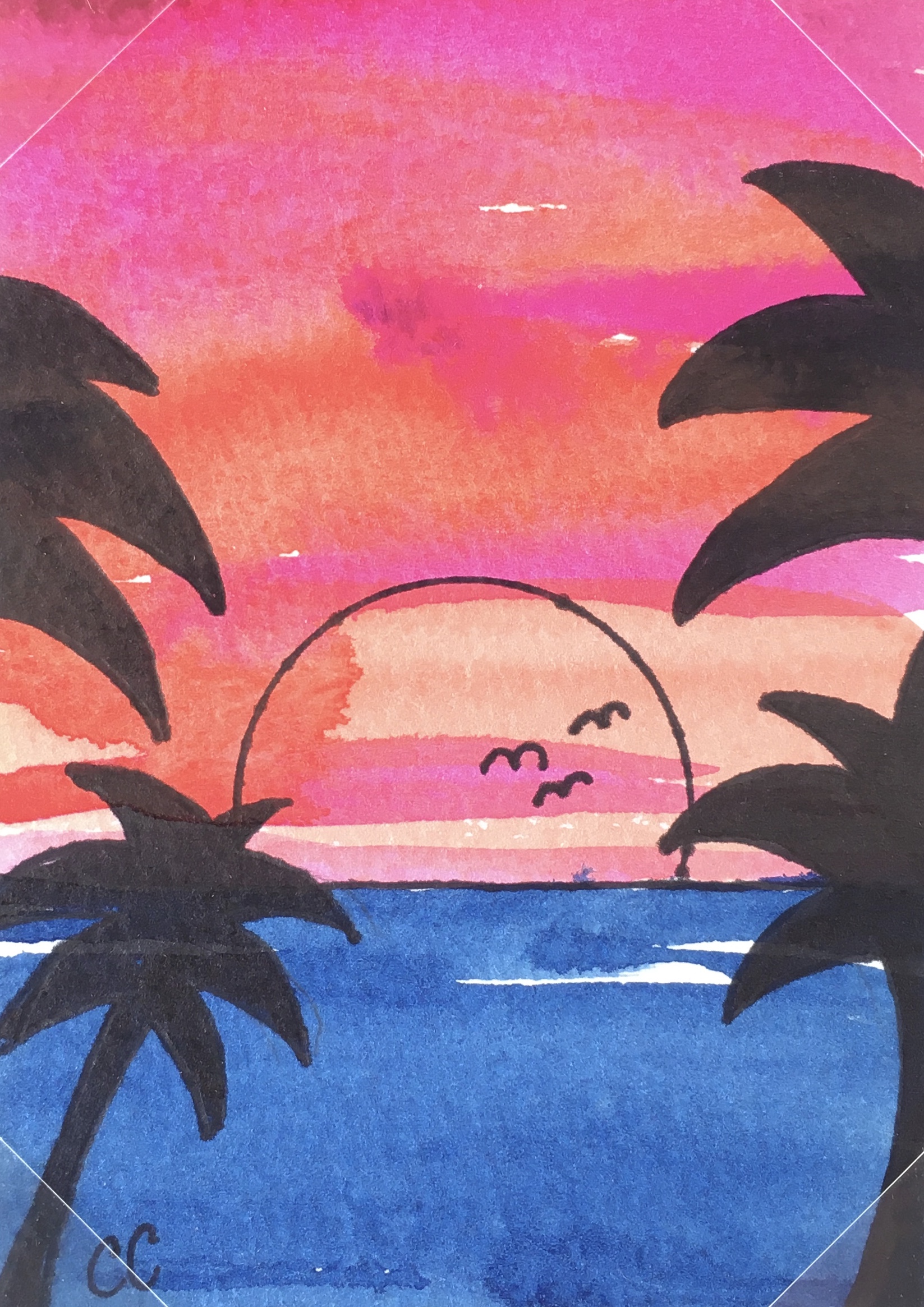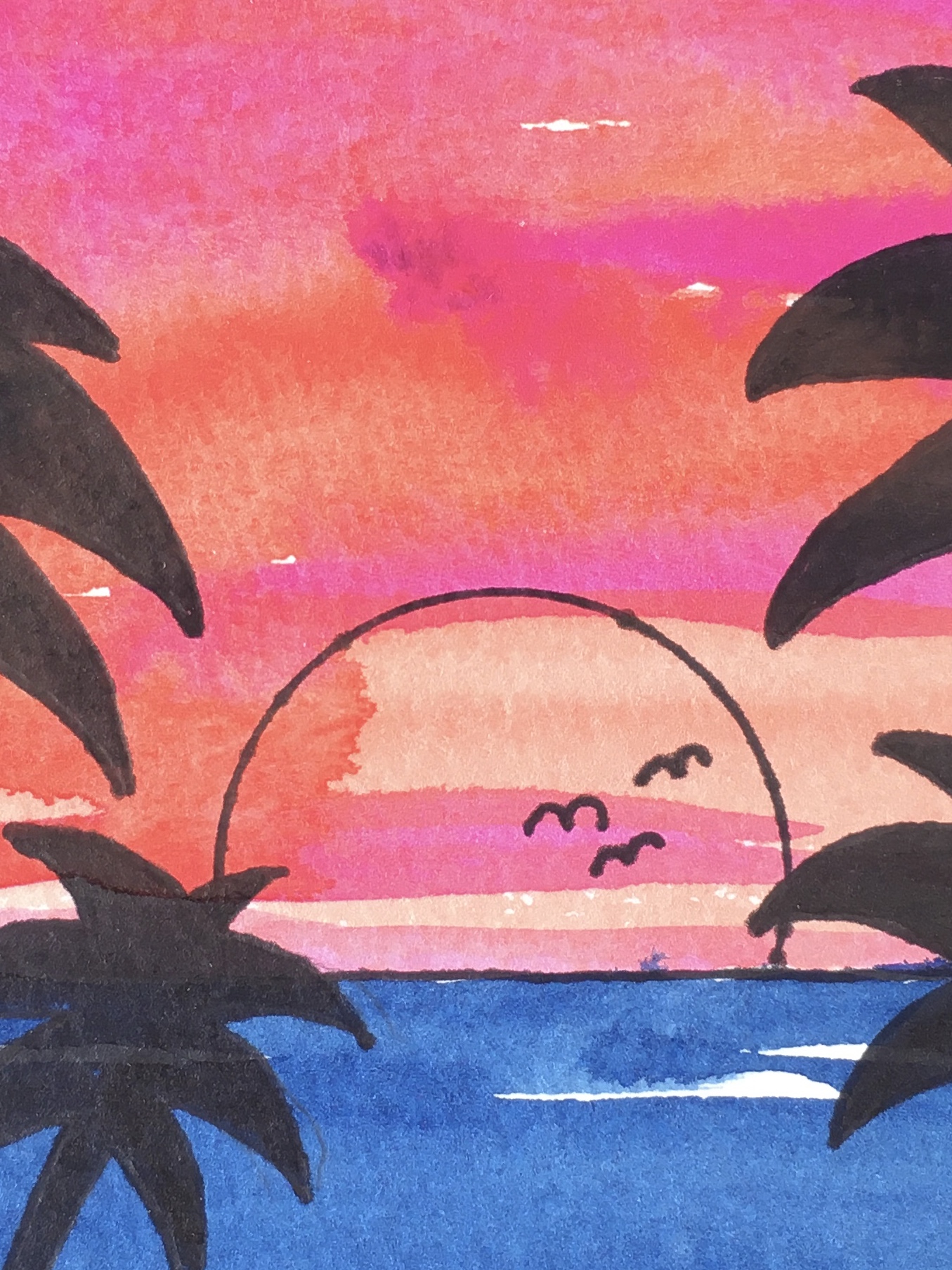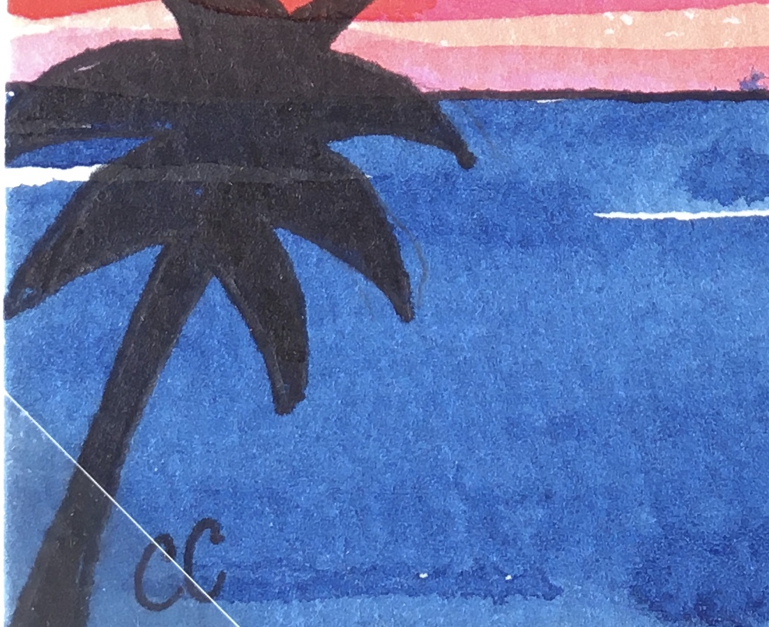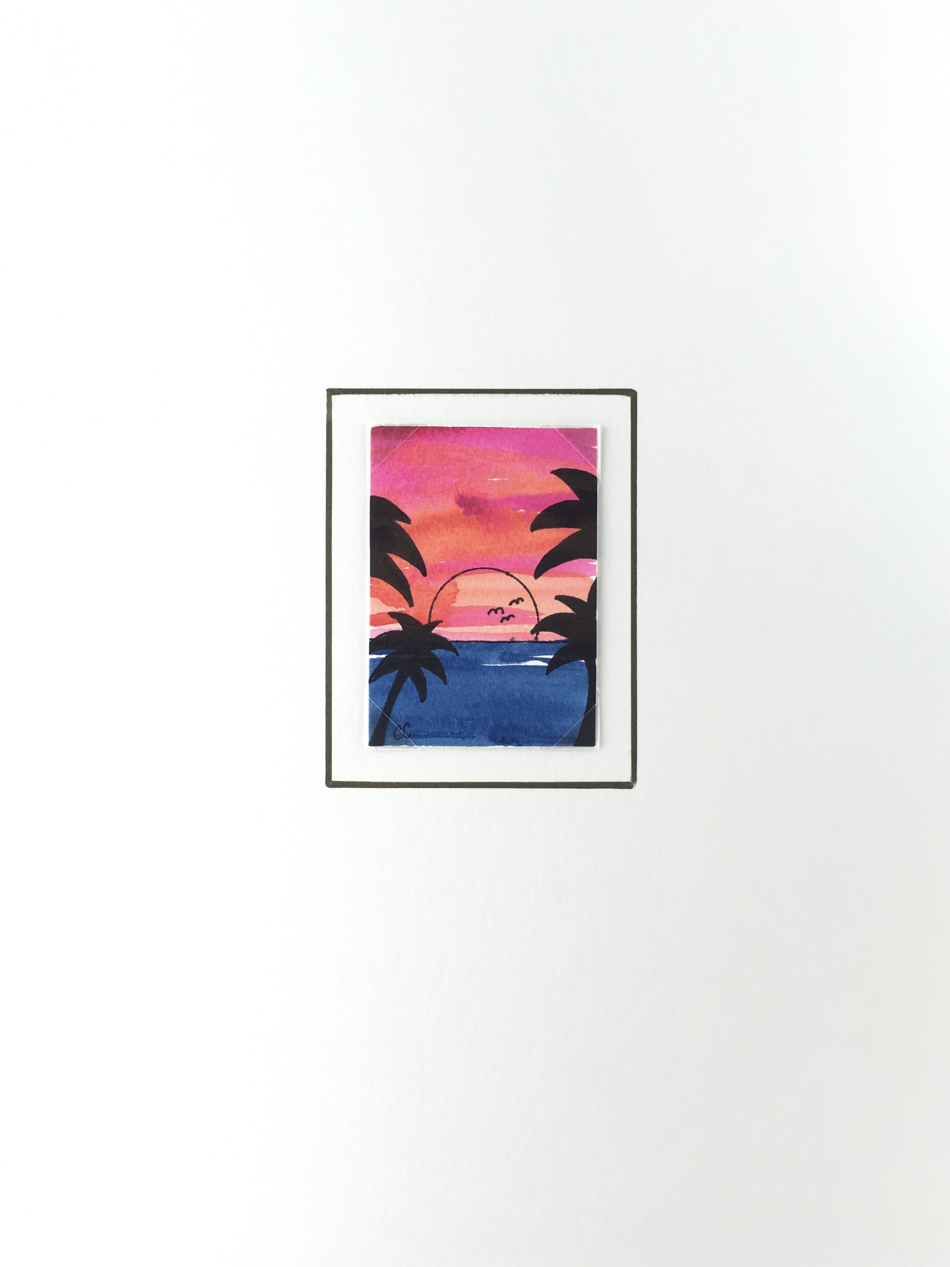Original Art on paper displayed on a white mat with a gold border. Mat fits a standard-size frame. Archival plastic sleeve and Certificate of Authenticity included. Original Art, 2.5″W x 3.5″H; mat, 12″W x 16″H.