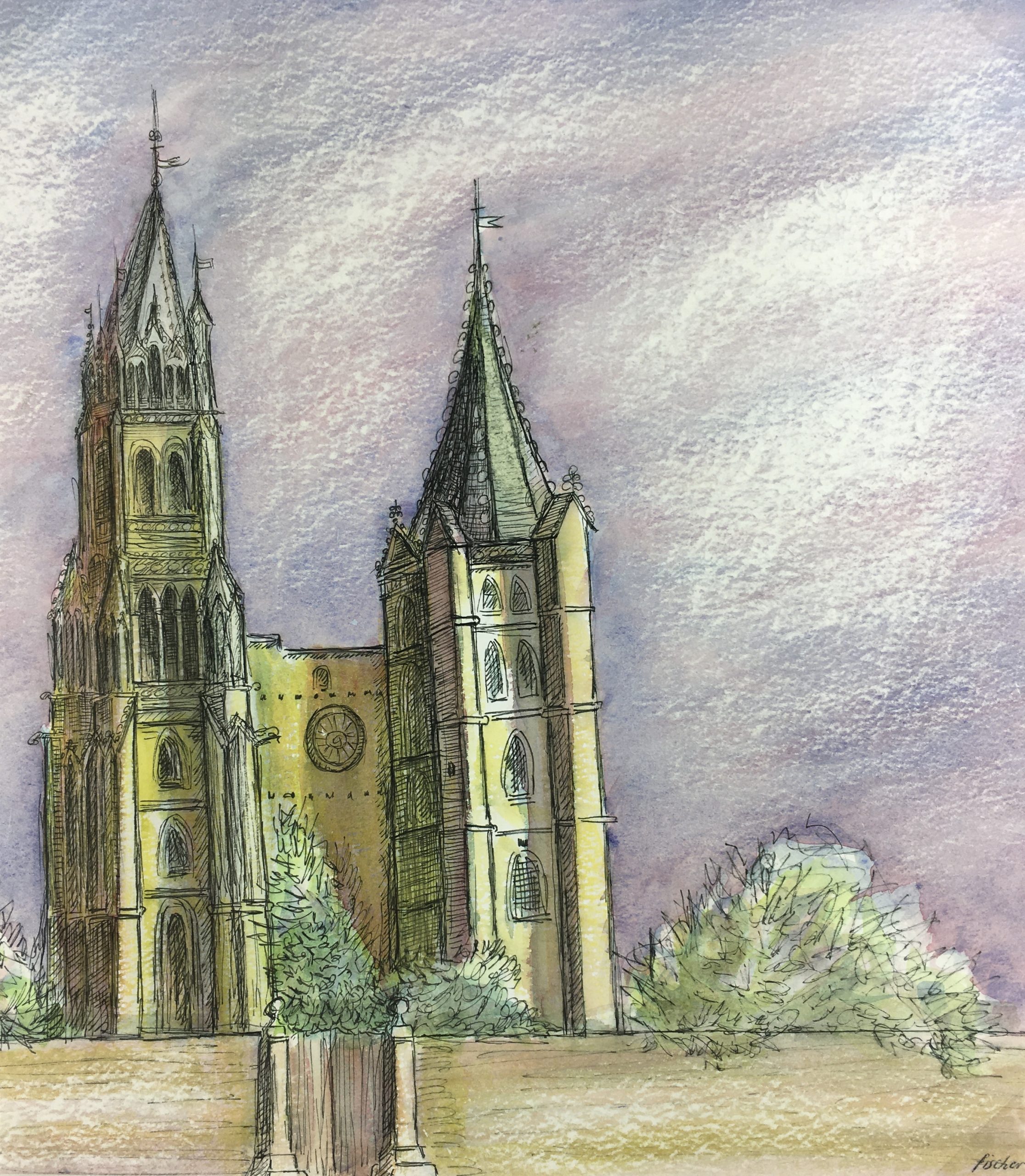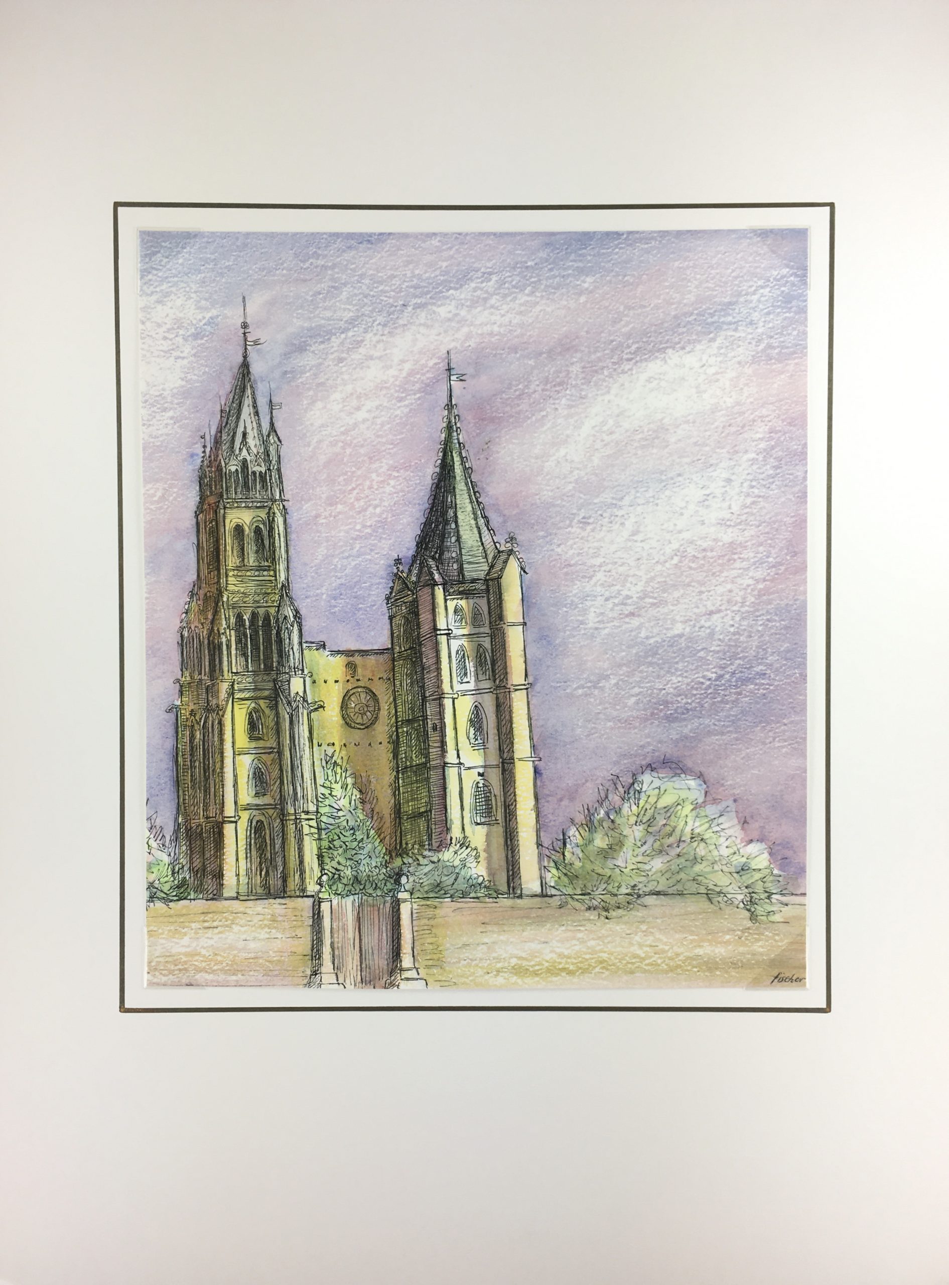 Original Art on paper displayed on a white mat with a gold border. Mat fits a standard-size frame. Archival plastic sleeve and Certificate of Authenticity included. Original Art, 12.25″W x 14″H; mat, 18″W x 24″H.