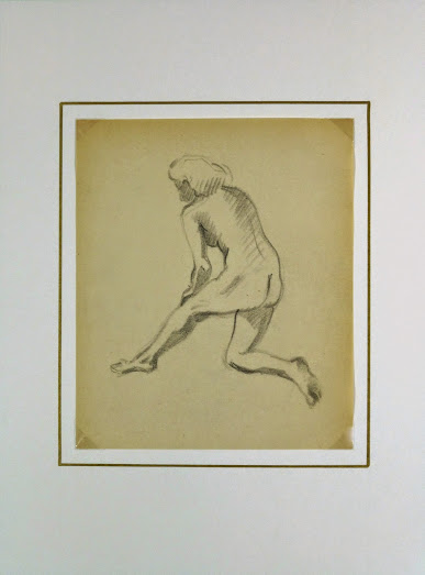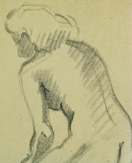 Softly rendered charcoal sketch of a nude female figure in mid-kneeling pose by Belgian artist Jean Ernst, circa 1930.