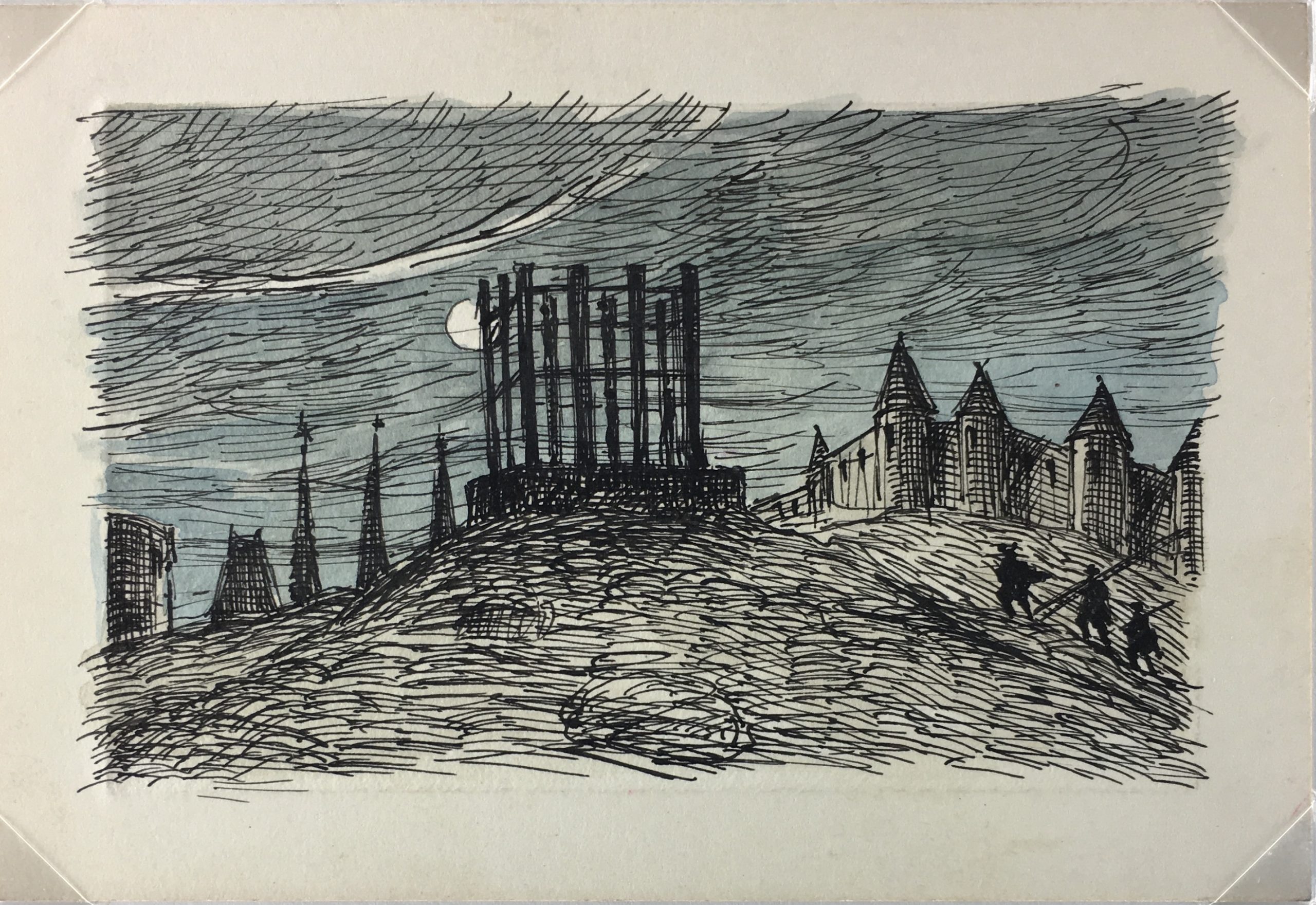 Original Art on paper displayed on a white mat with a gold border. Mat fits a standard-size frame. Archival plastic sleeve and Certificate of Authenticity included. Original Art, 5″W x 3.5″H; mat, 12″W x 16″H.