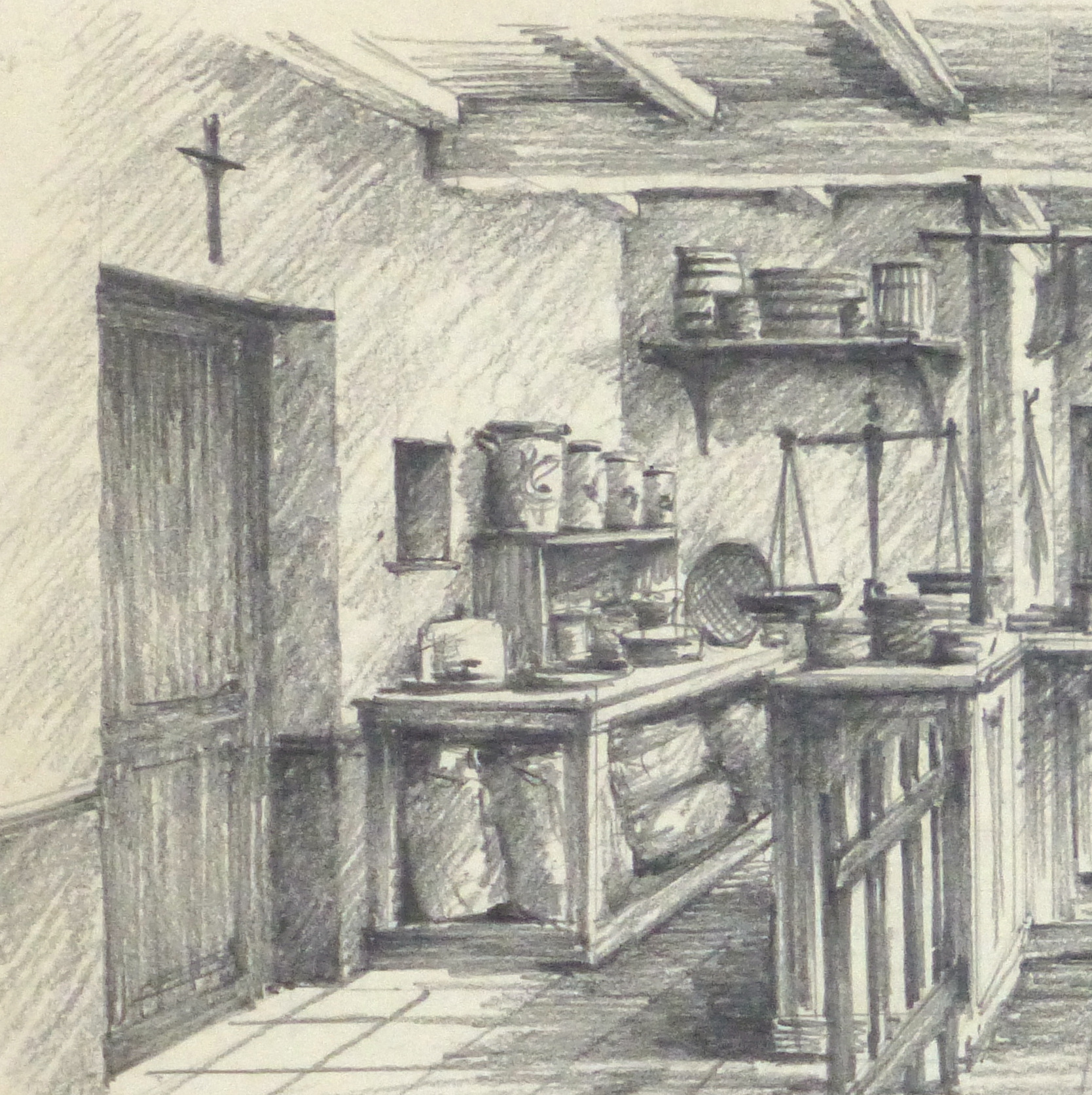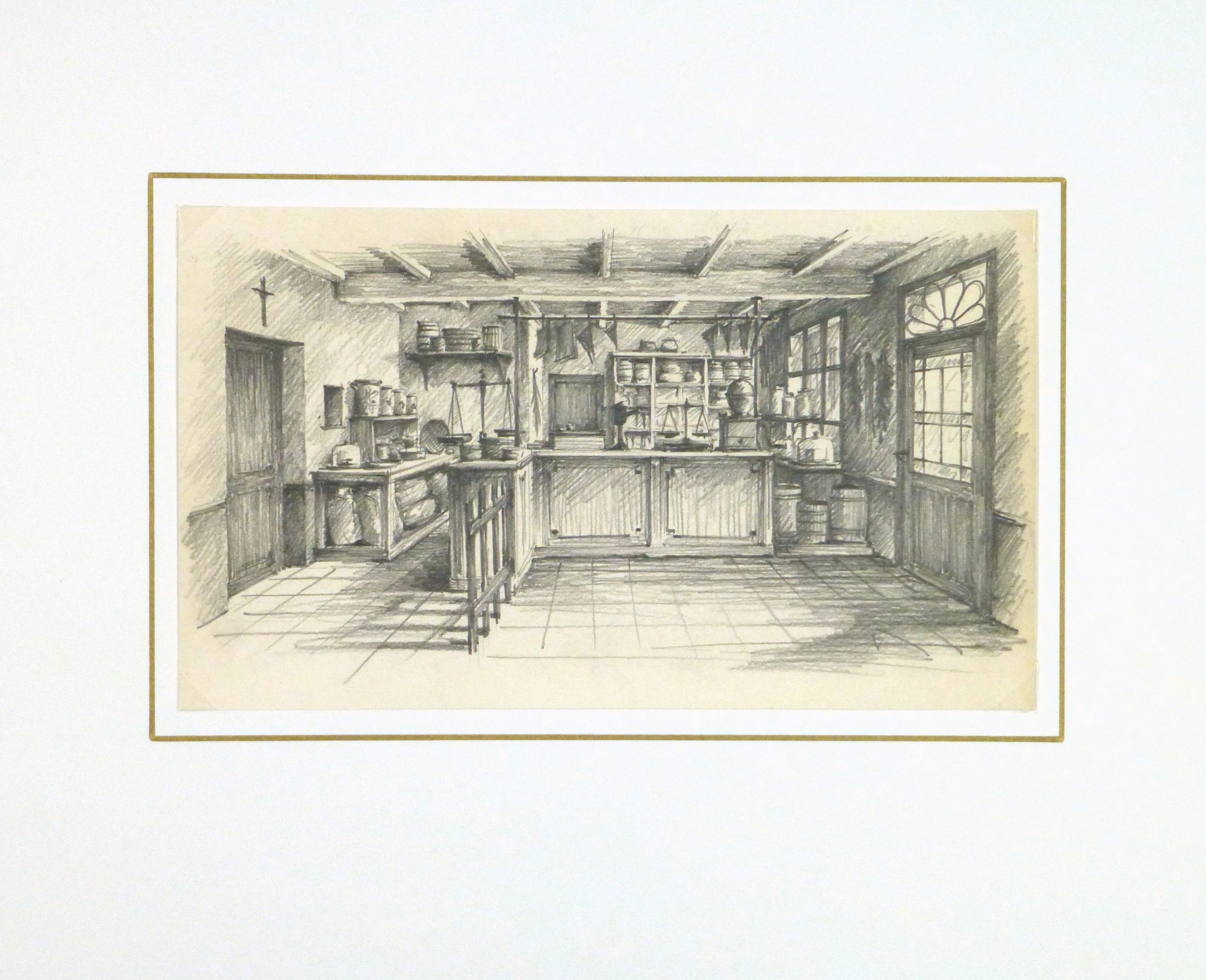 Interior decor study pencil drawing of a French general store, circa 1950. Unsigned.