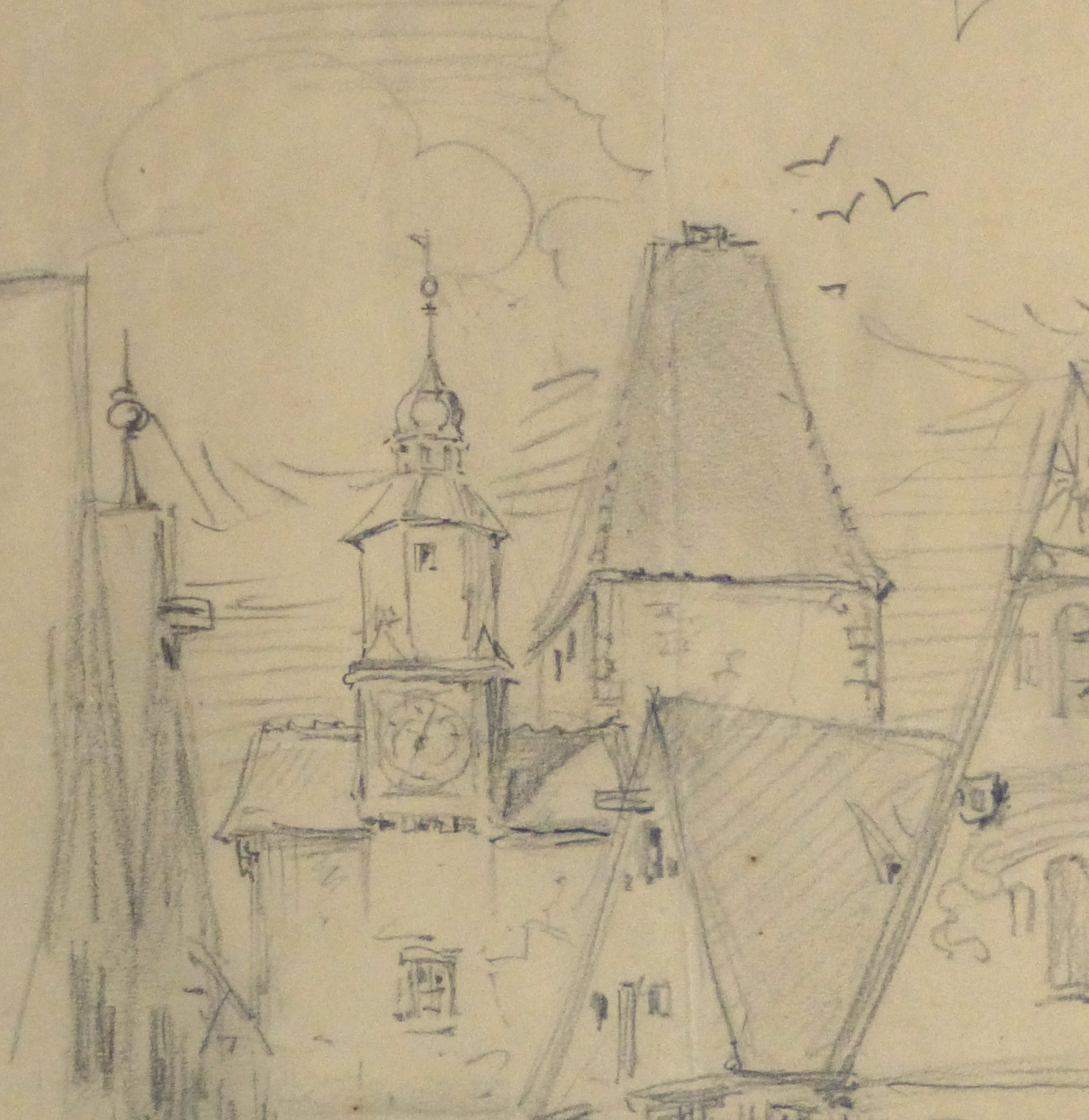 Delightful pencil drawing of a charming village street in Germany, circa 1930.