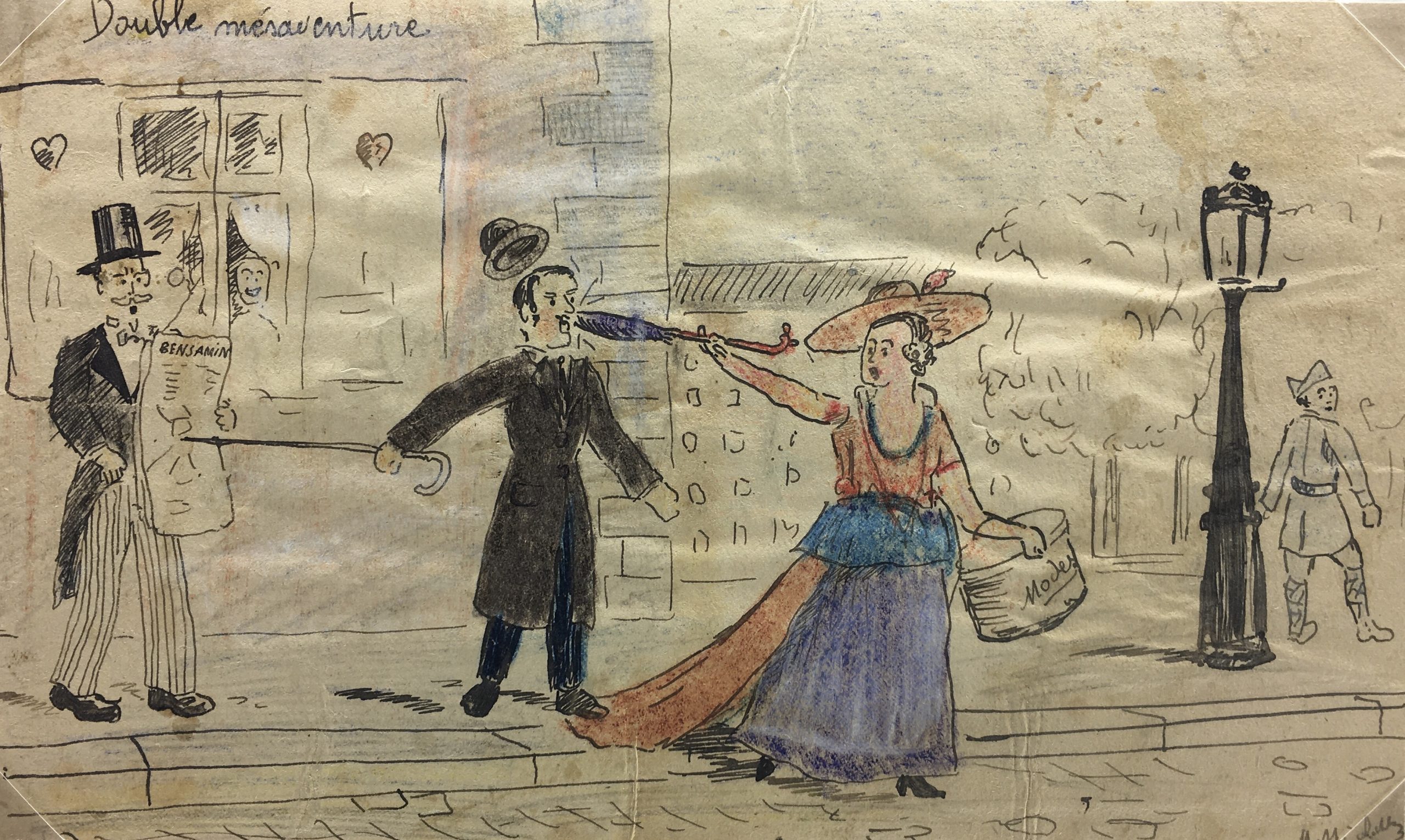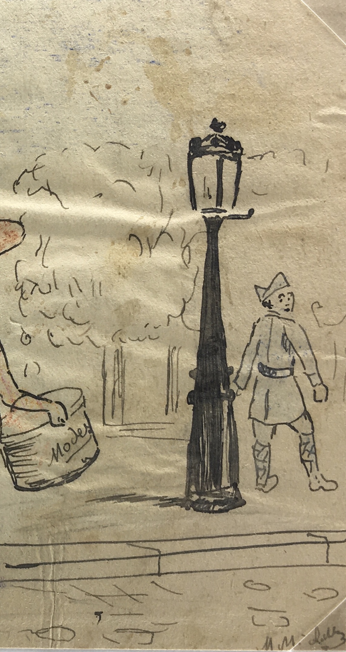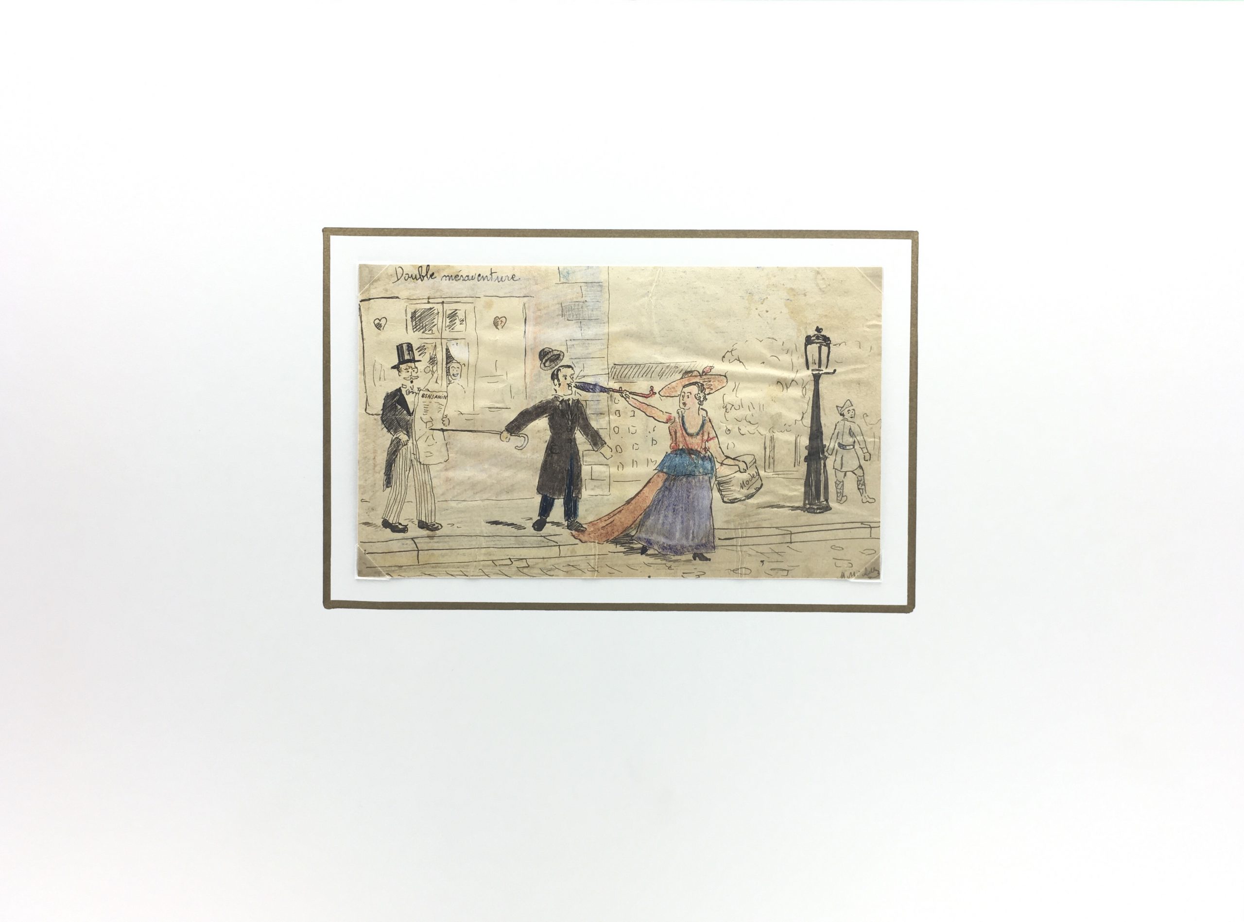 Original Art on paper displayed on a white mat with a gold border. Mat fits a standard-size frame. Archival plastic sleeve and Certificate of Authenticity included. Original Art, 6.75″W x 4″H; mat, 16″W x 12″H.