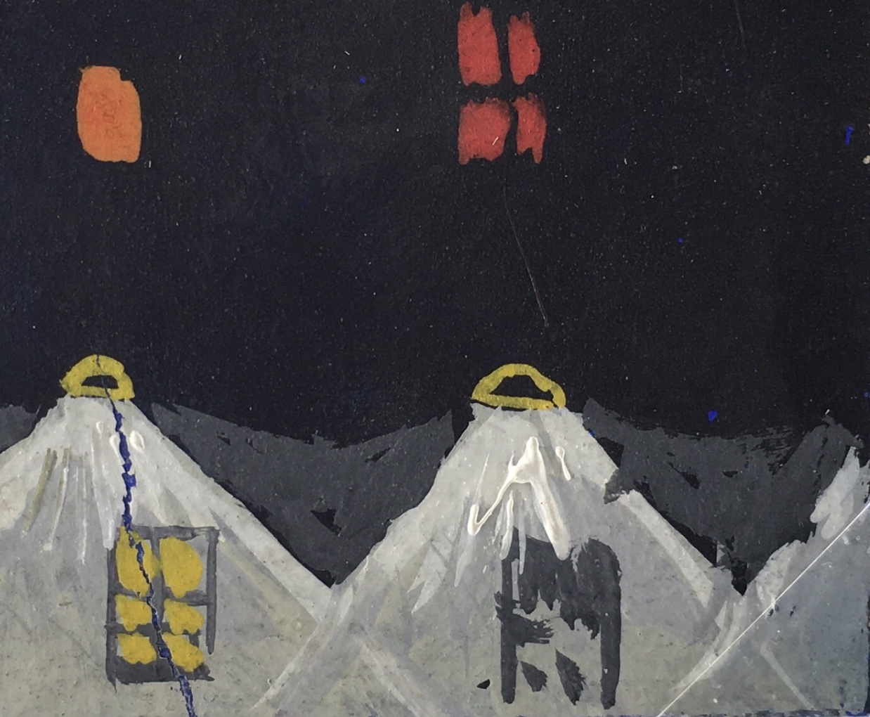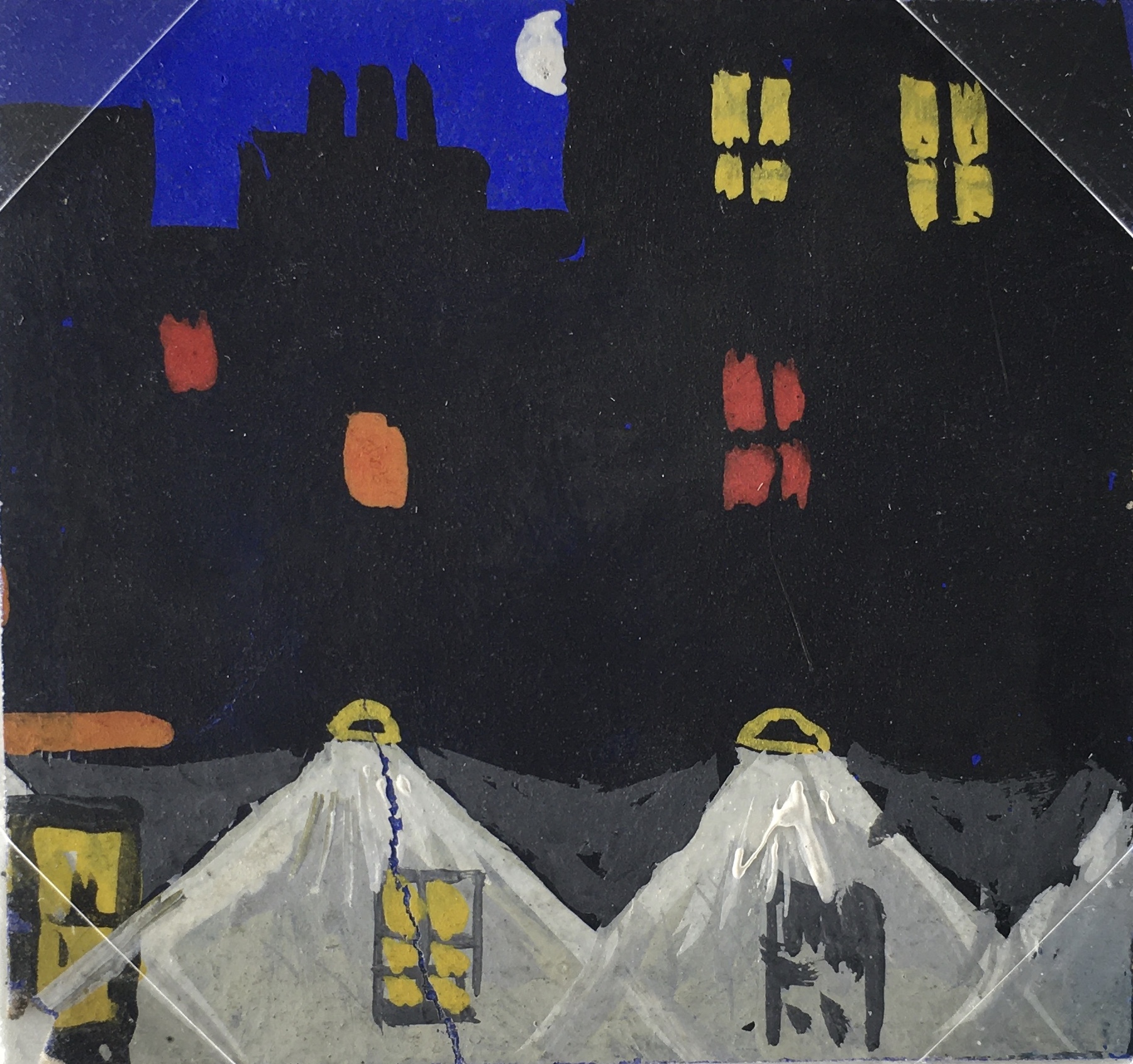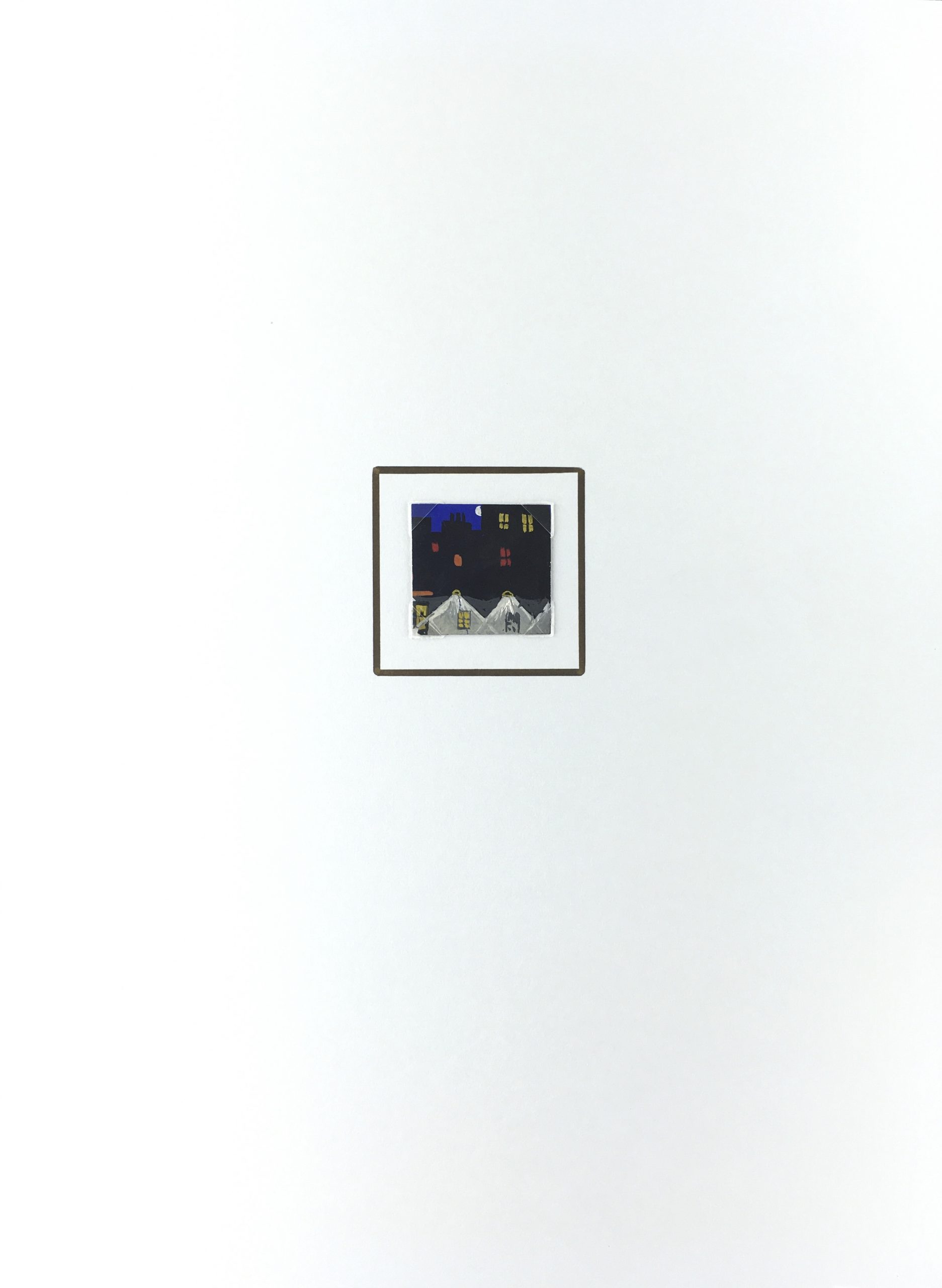 Original Art on paper displayed on a white mat with a gold border. Mat fits a standard-size frame. Archival plastic sleeve and Certificate of Authenticity included. Original Art, 1.75″W x 1.75″H; mat, 12″W x 16″H.