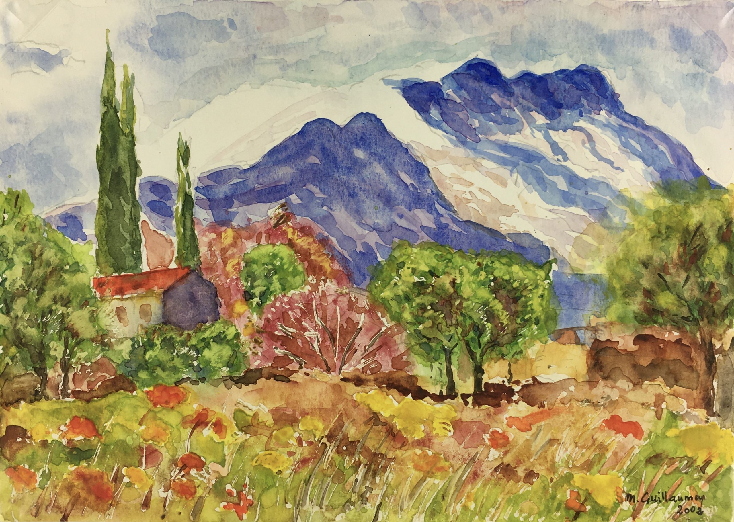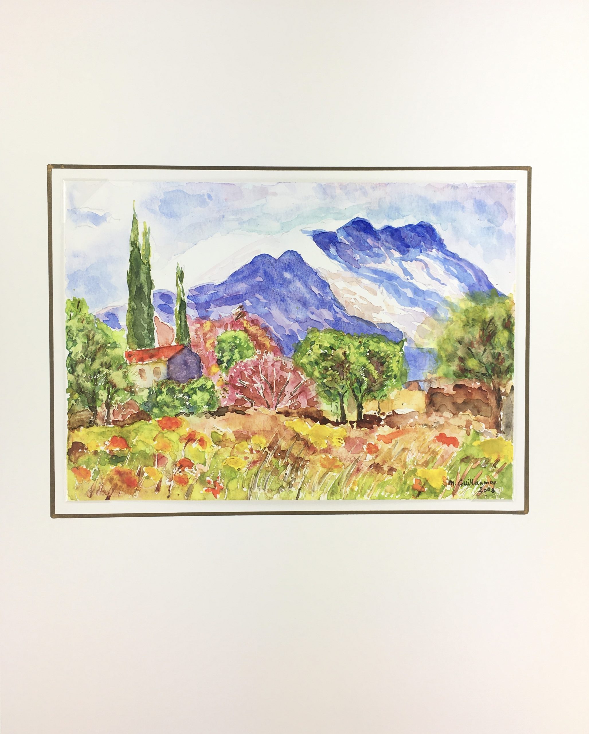 Original Art on paper displayed on a white mat with a gold border. Mat fits a standard-size frame. Archival plastic sleeve and Certificate of Authenticity included. Original Art, 12″W x 8.75″H; mat, 16″W x 20″H.