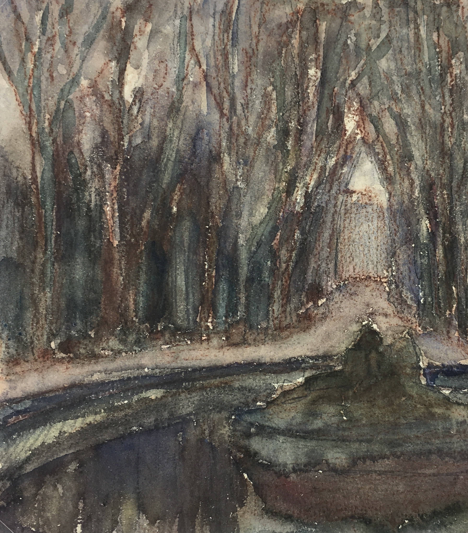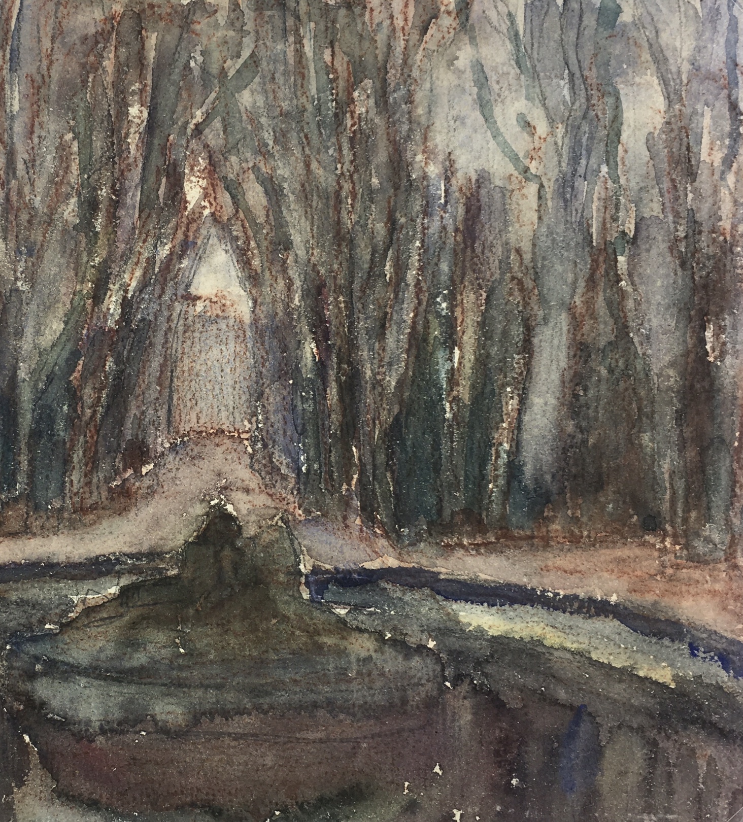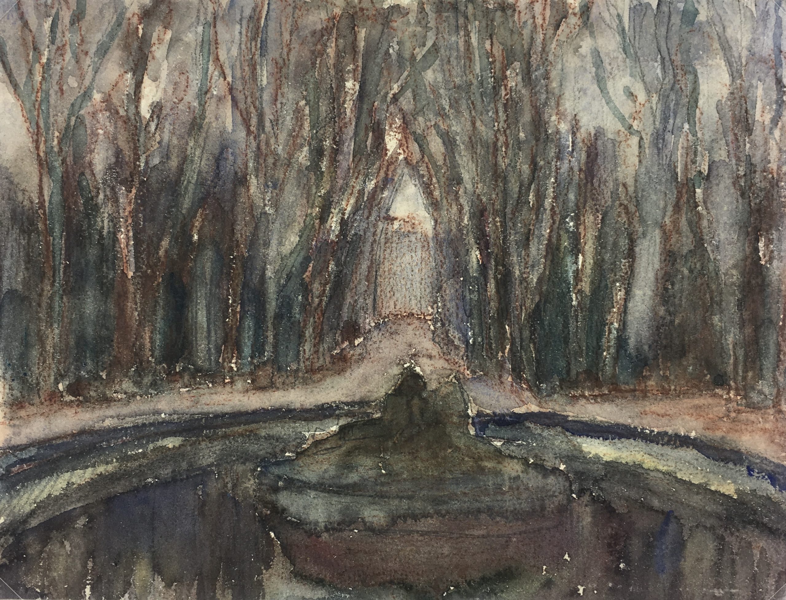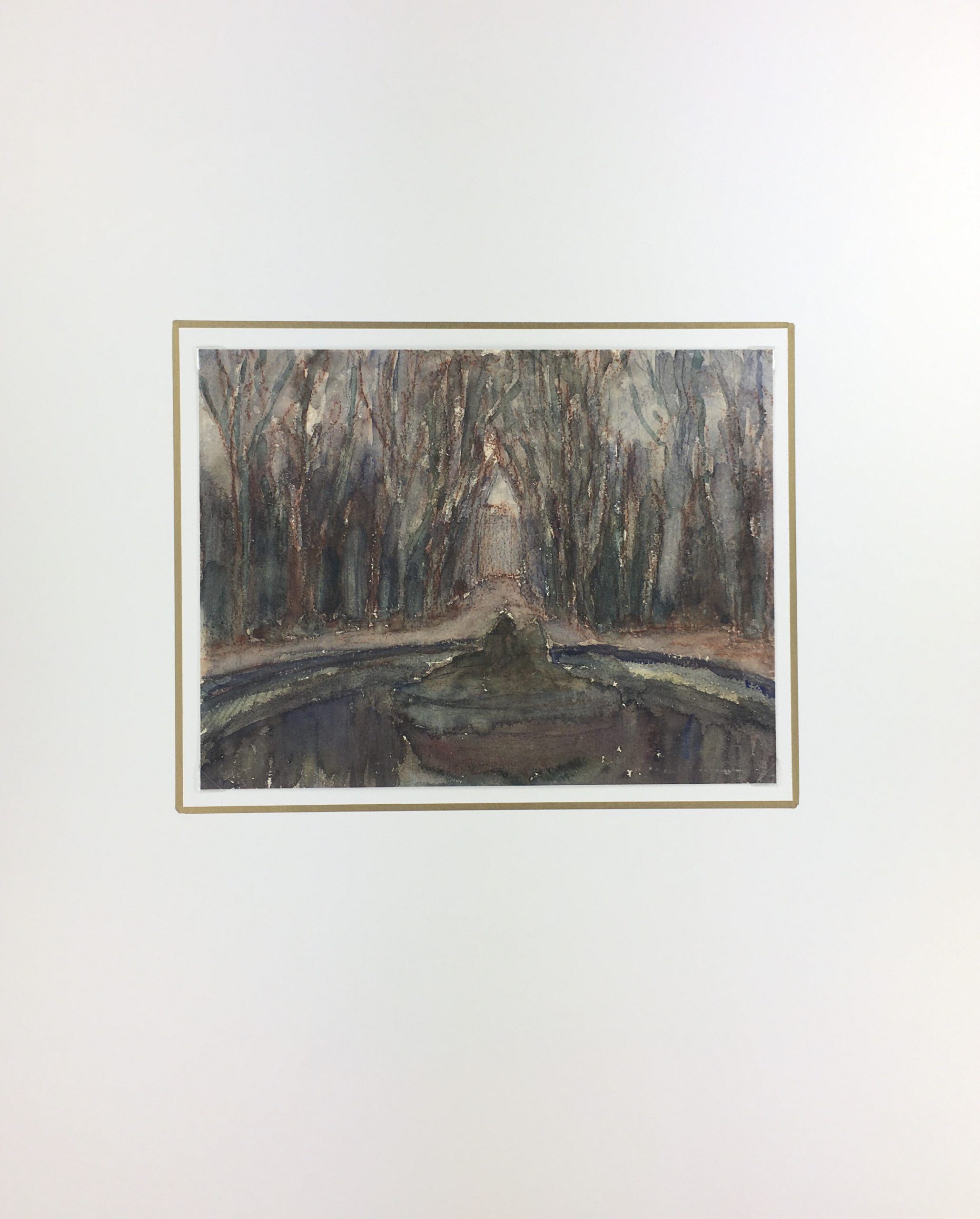 Original Art on paper displayed on a white mat with a gold border. Mat fits a standard-size frame. Archival plastic sleeve and Certificate of Authenticity included. Original Art, 9.25″W x 7″H; mat, 16″W x 20″H.
