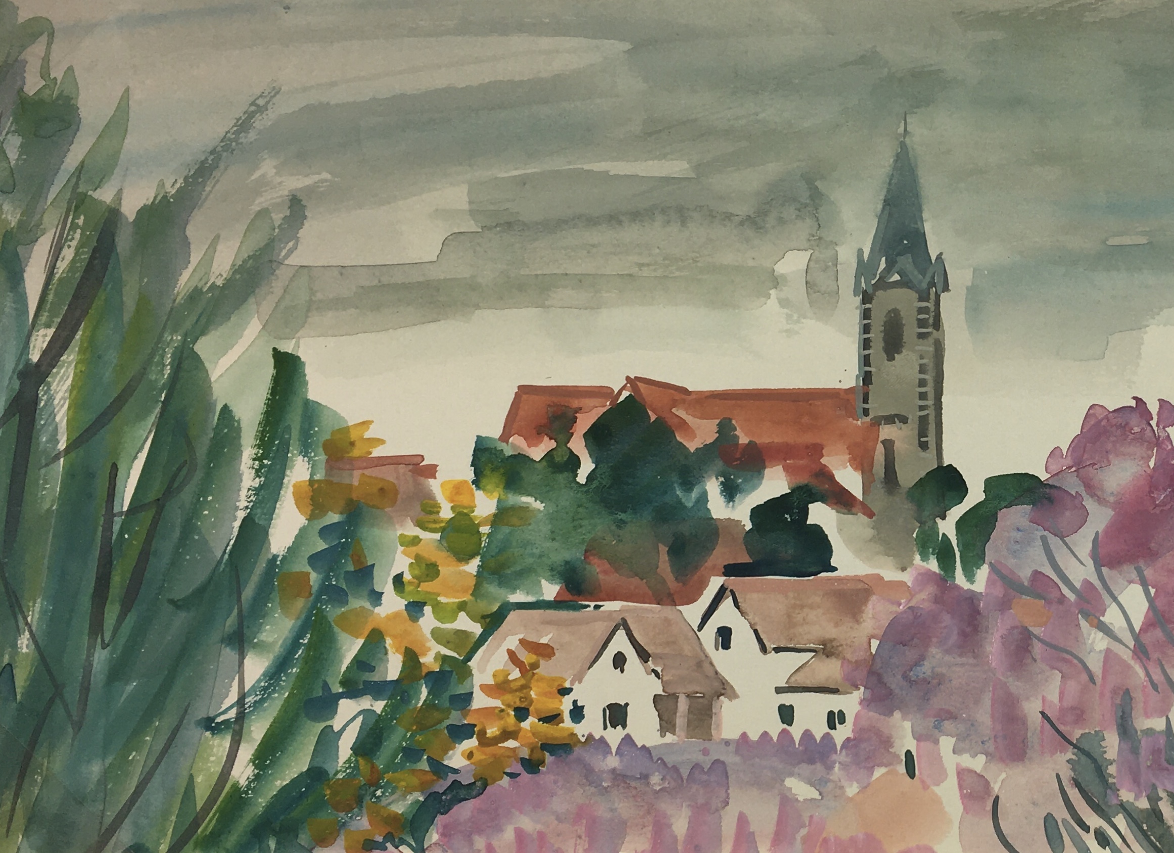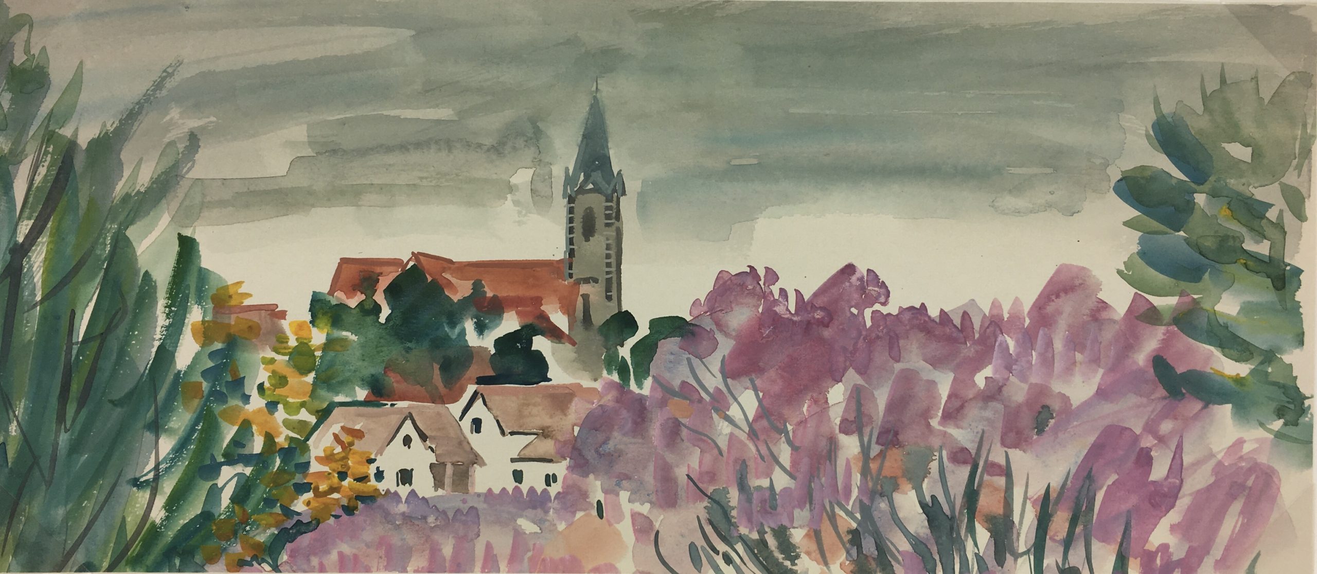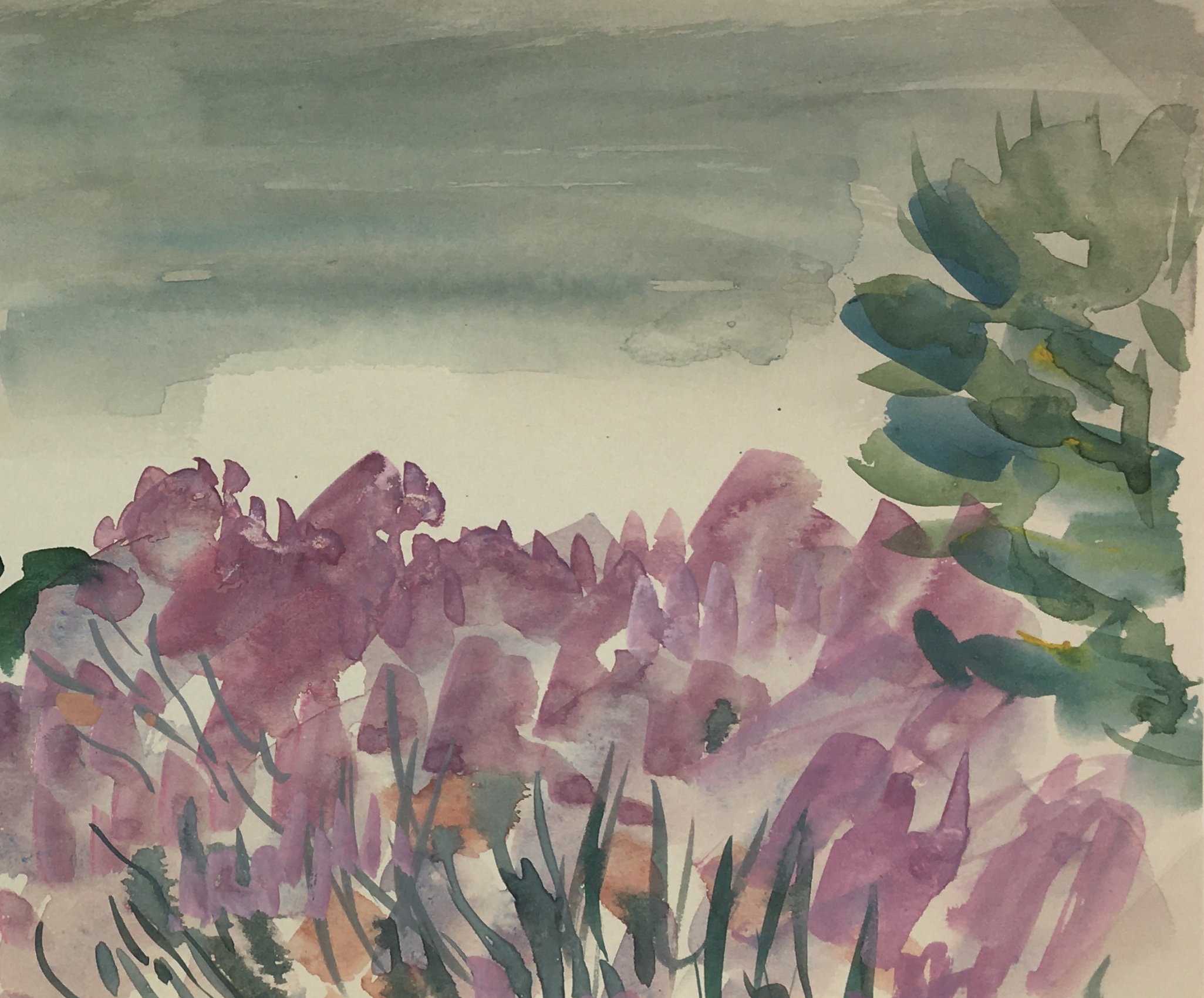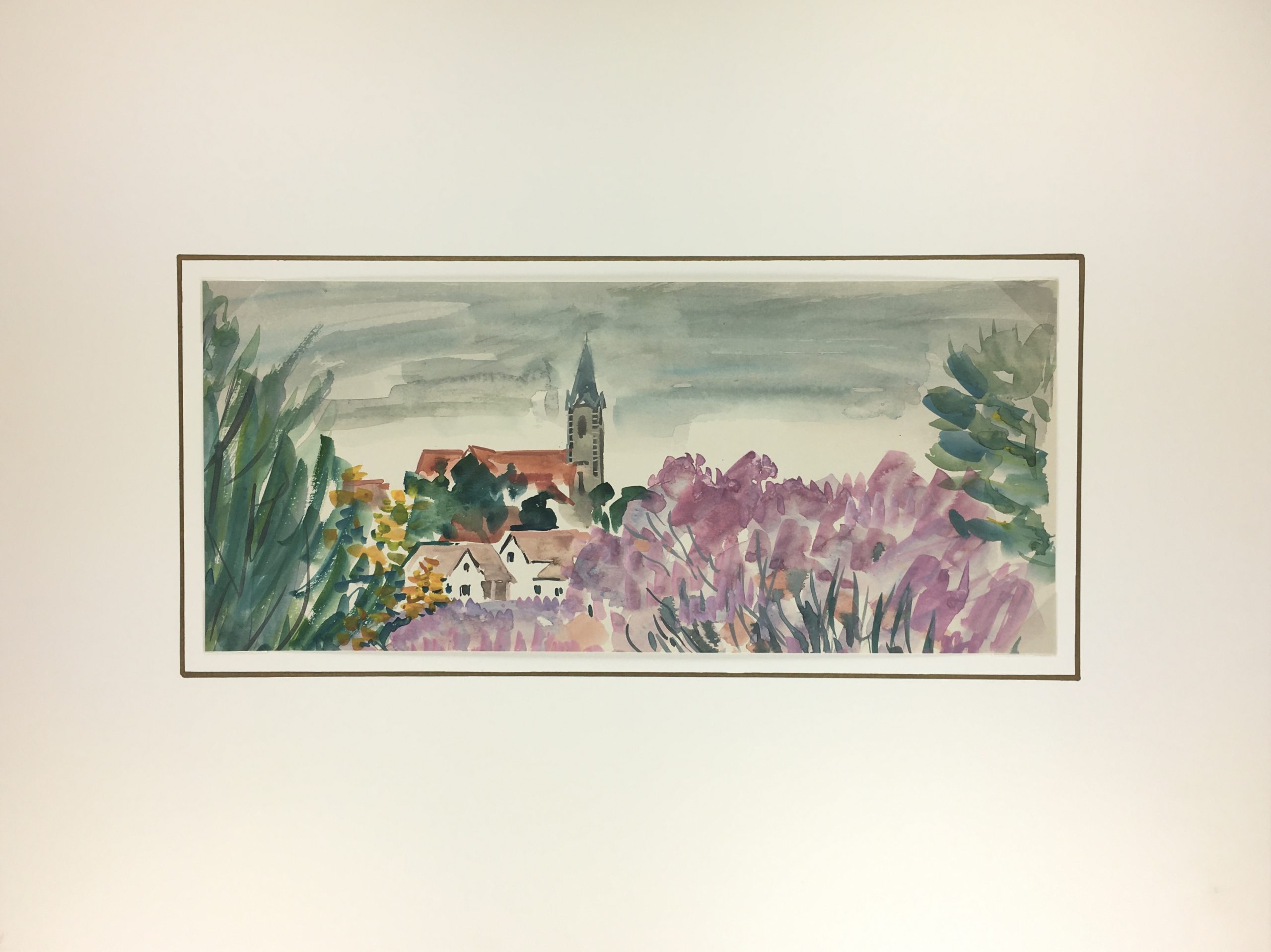 Original Art on paper displayed on a white mat with a gold border. Mat fits a standard-size frame. Archival plastic sleeve and Certificate of Authenticity included. Original Art, 16″W x 7″H; mat, 24″W x 18″H.