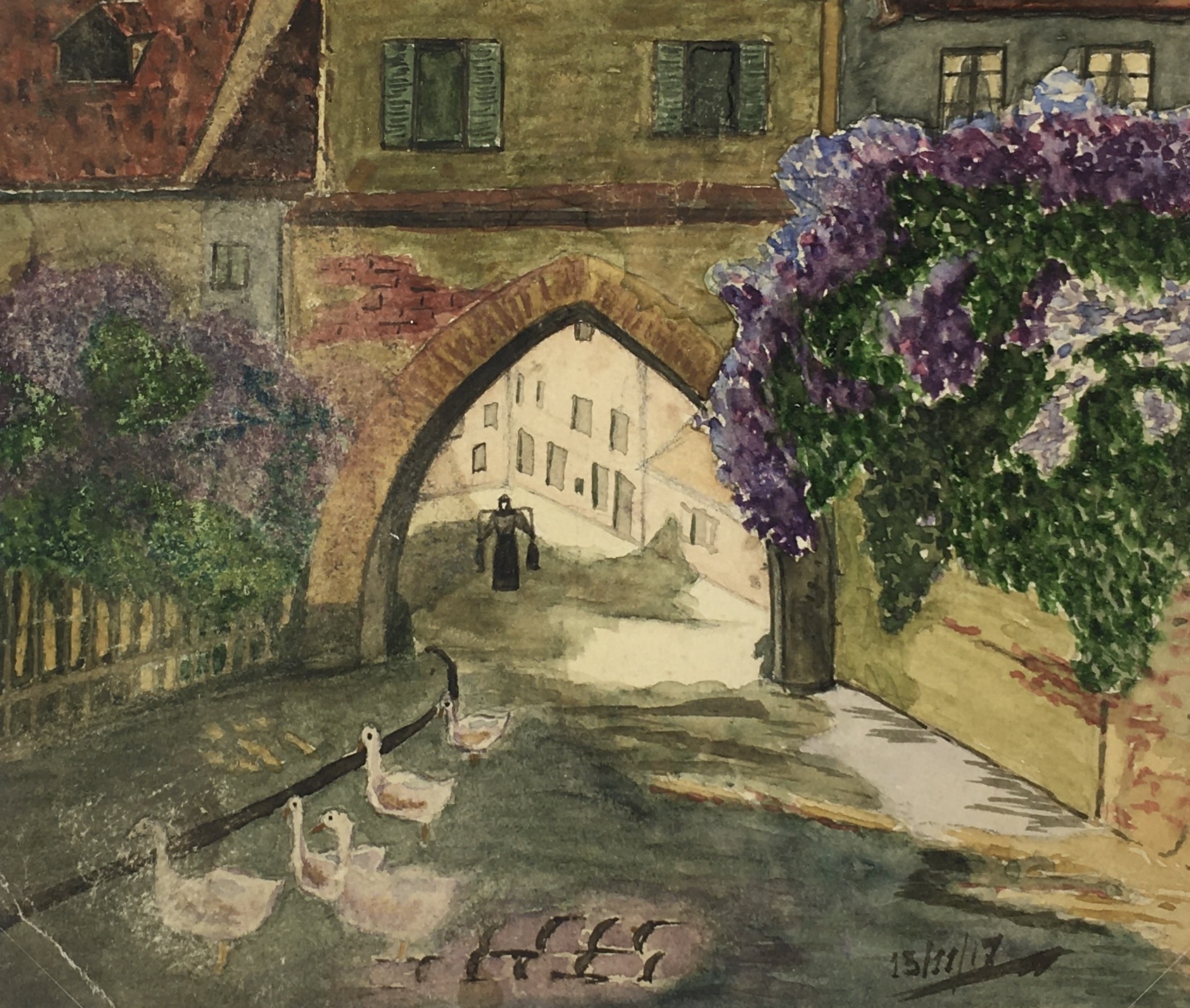 Original Art on paper displayed on a white mat with a gold border. Mat fits a standard-size frame. Archival plastic sleeve and Certificate of Authenticity included. Original Art, 5″W x 7″H; mat, 16″W x 20″H.