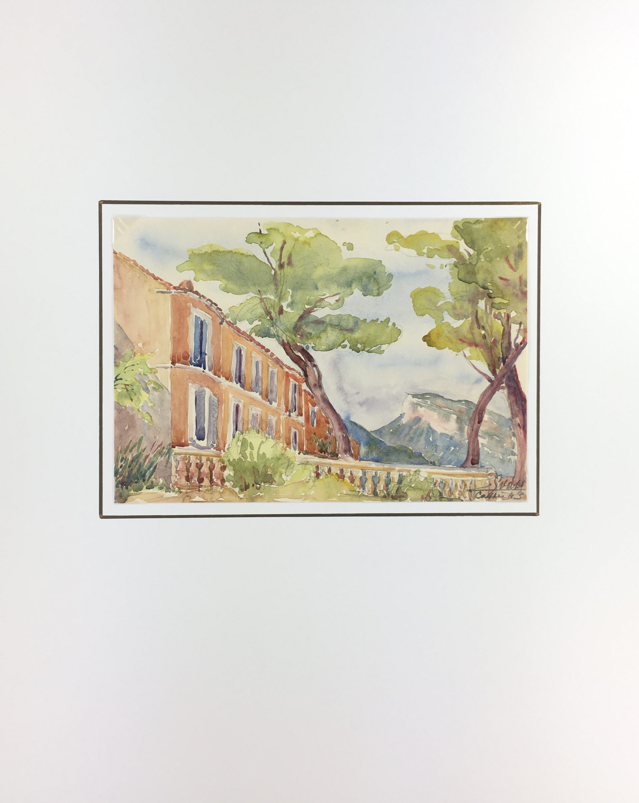 Original Art on paper displayed on a white mat with a gold border. Mat fits a standard-size frame. Archival plastic sleeve and Certificate of Authenticity included. Original Art, 10.25″W x 7″H; mat, 16″W x 20″H.