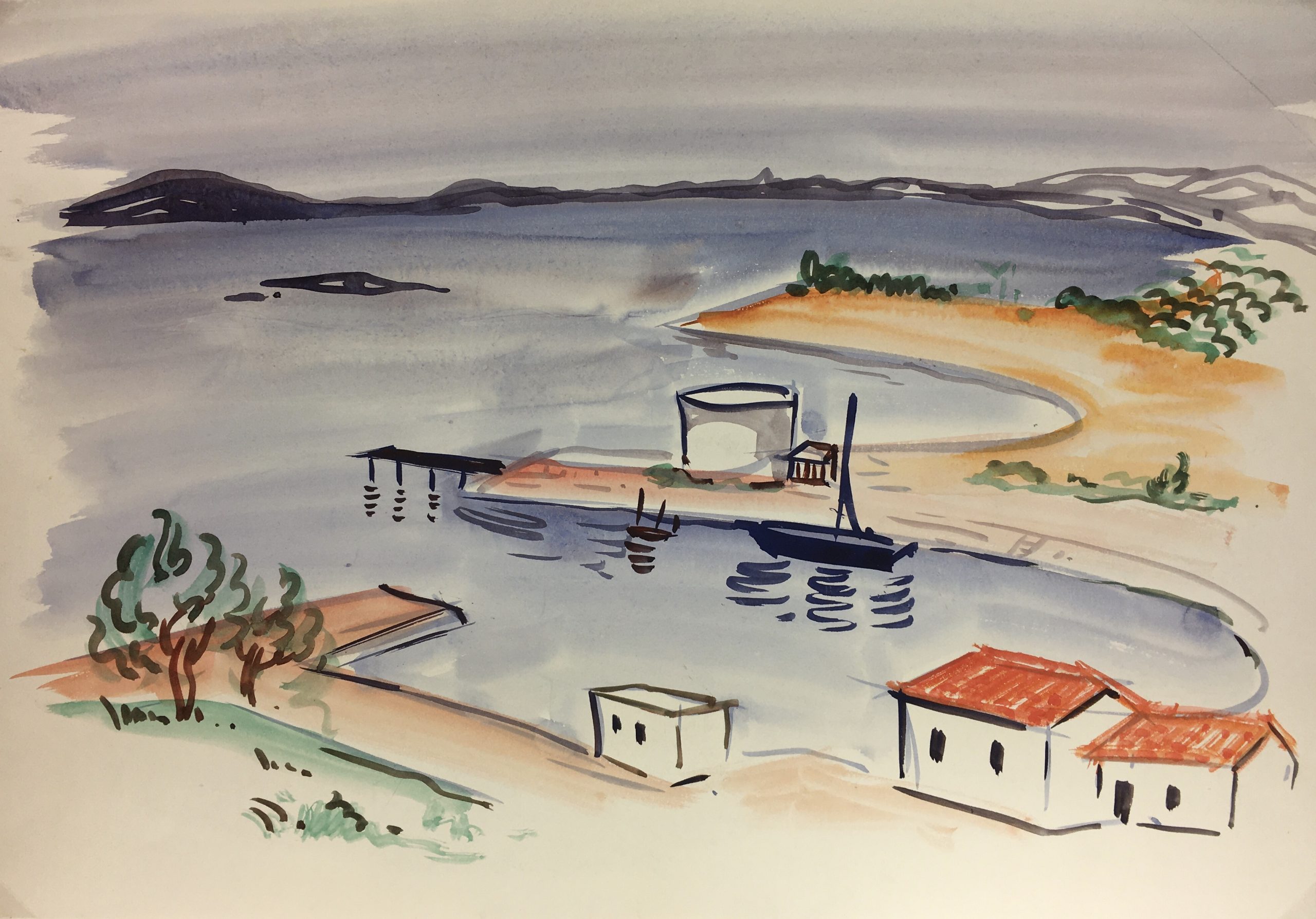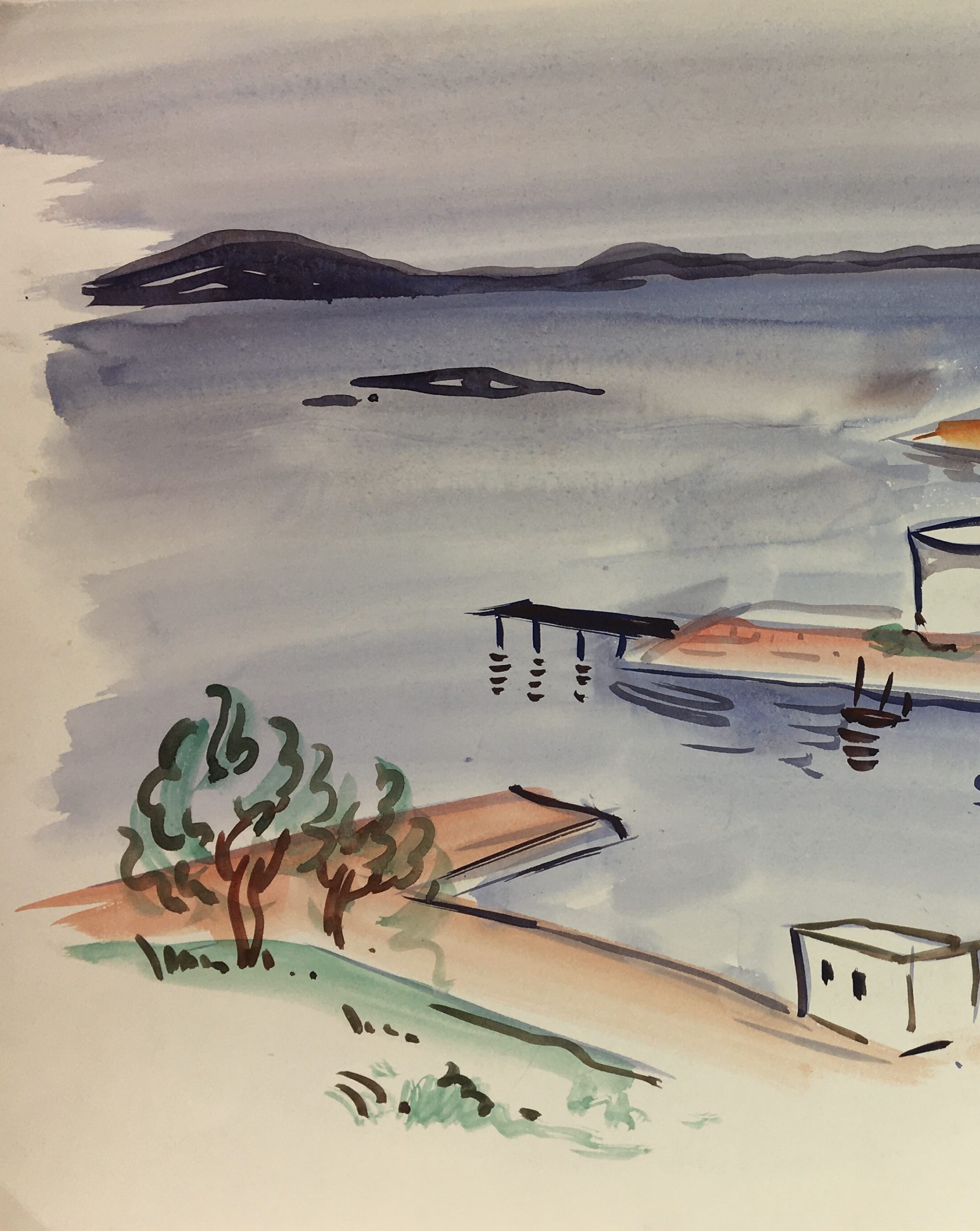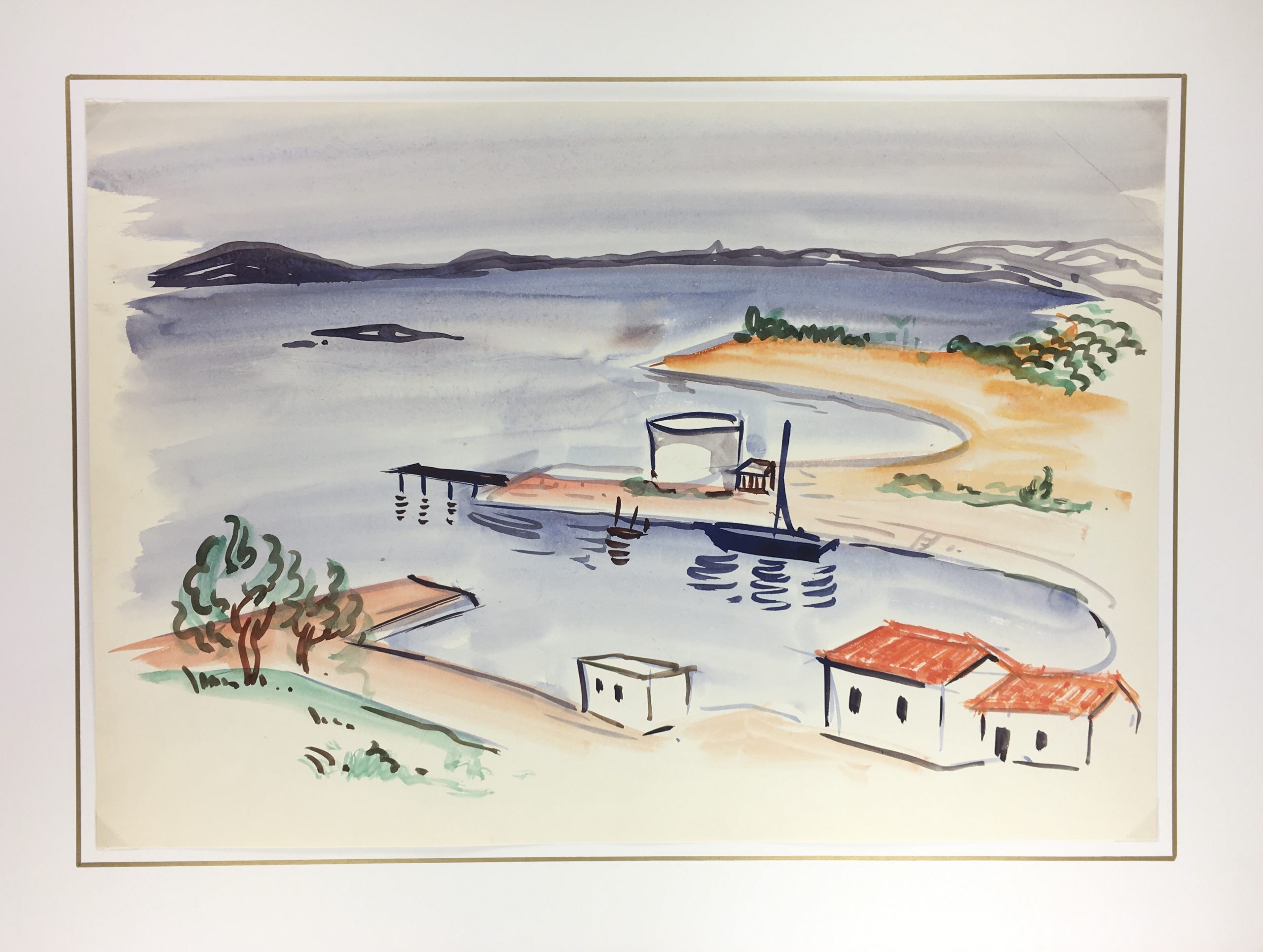 Original Art on paper displayed on a white mat with a gold border. Mat fits a standard-size frame. Archival plastic sleeve and Certificate of Authenticity included. Original Art, 20″W x 13.75″H; mat, 24″W x 18″H.