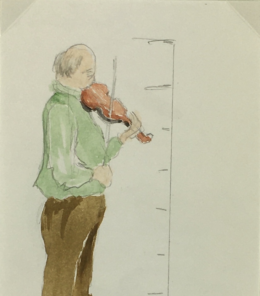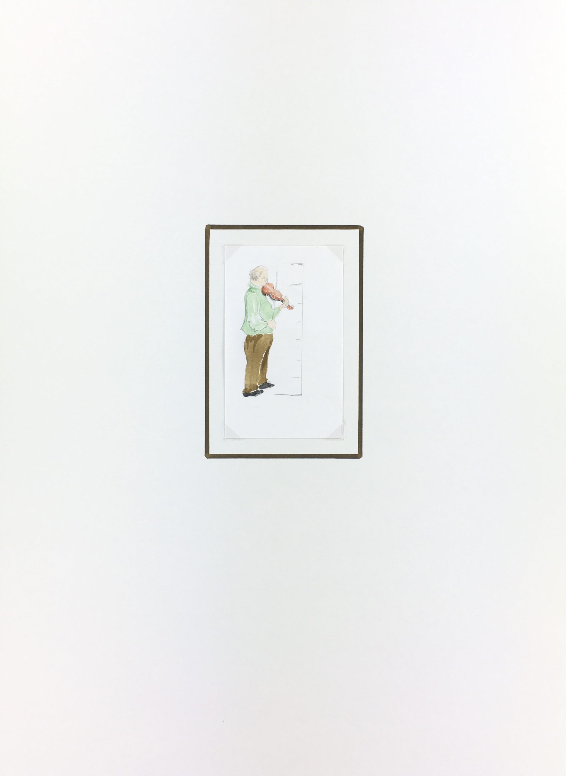 Original Art on paper displayed on a white mat with a gold border. Mat fits a standard-size frame. Archival plastic sleeve and Certificate of Authenticity included. Original Art, 2.5″W x 4″H; mat, 12″W x 16″H.