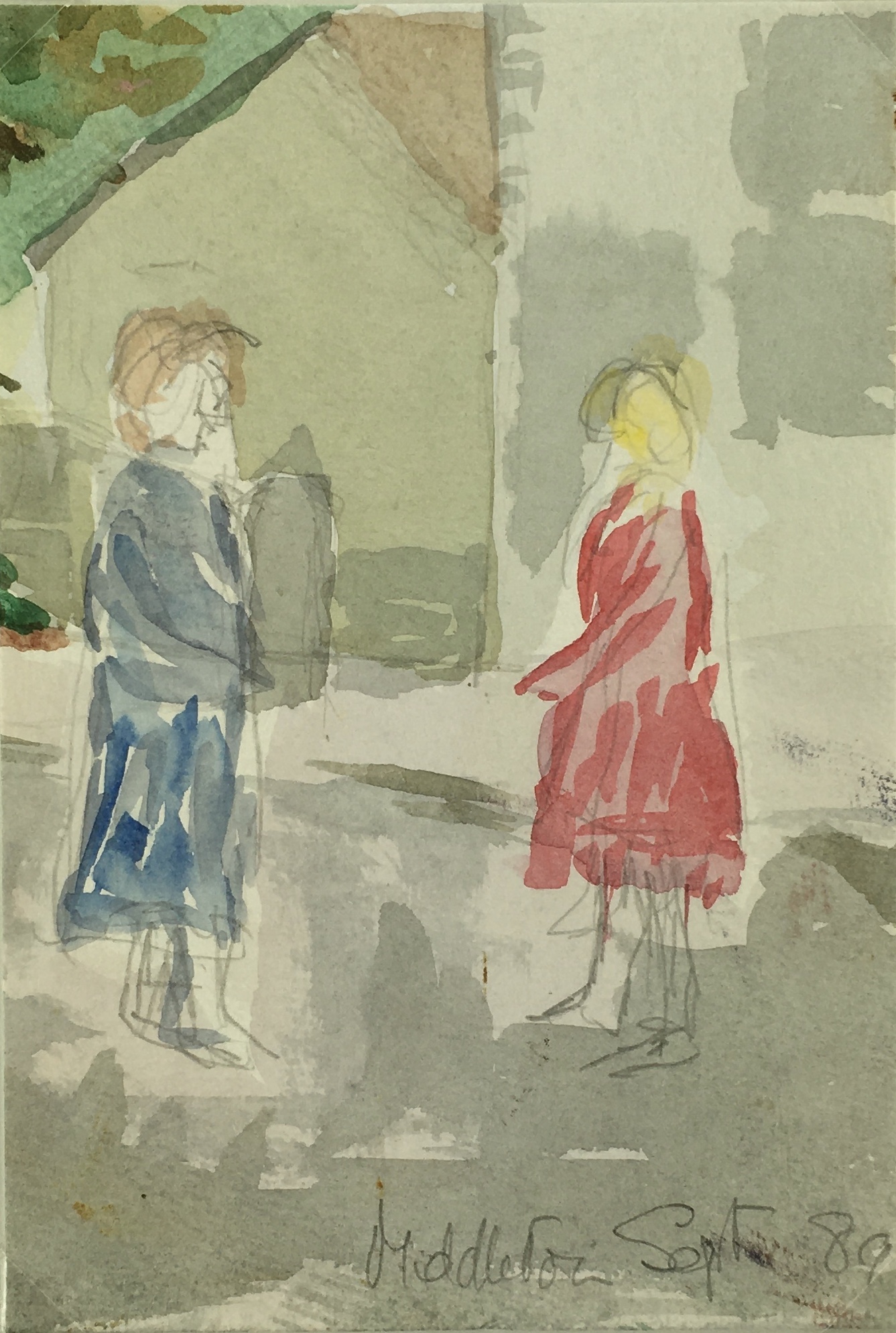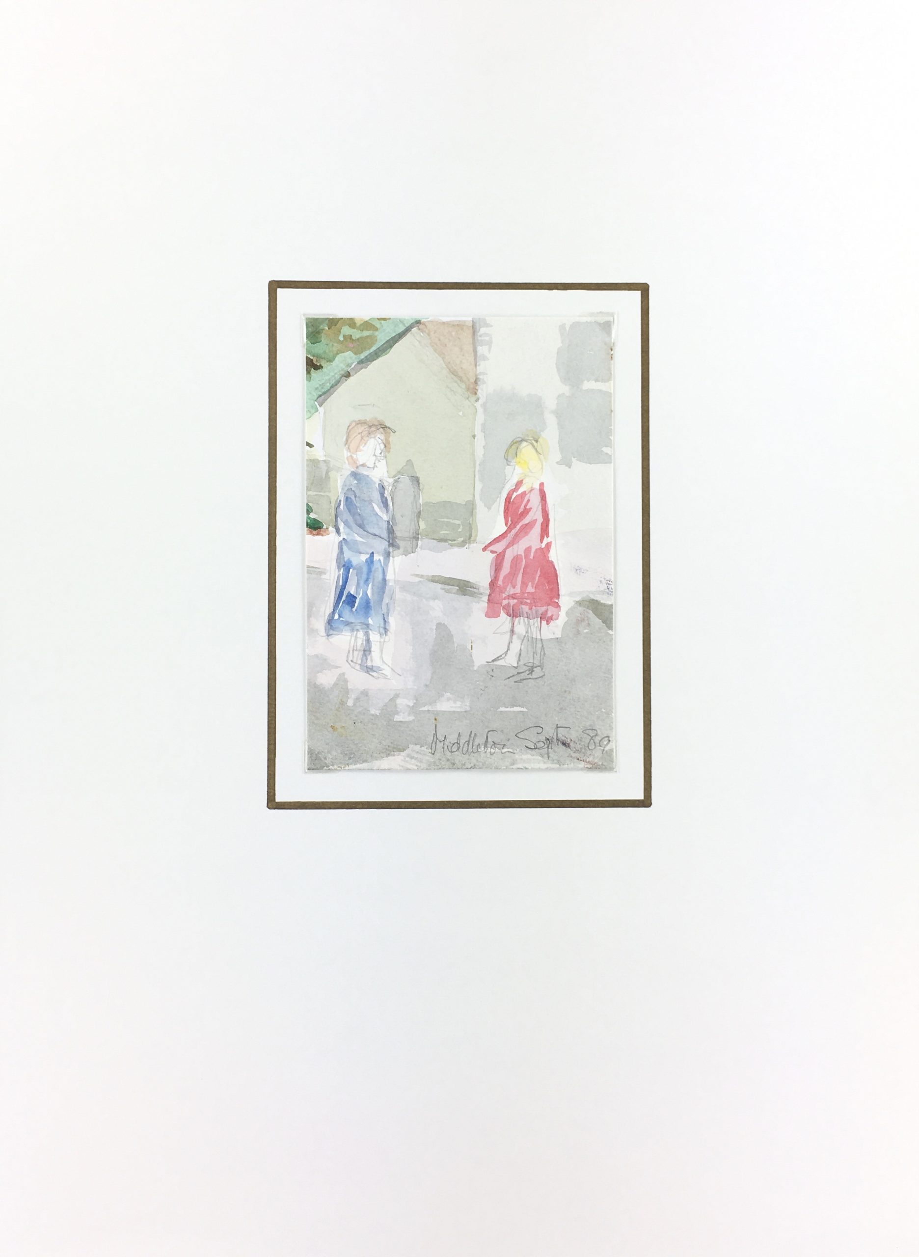 Original Art on paper displayed on a white mat with a gold border. Mat fits a standard-size frame. Archival plastic sleeve and Certificate of Authenticity included. Original Art, 4″W x 5.75″H; mat, 12″W x 16″H.
