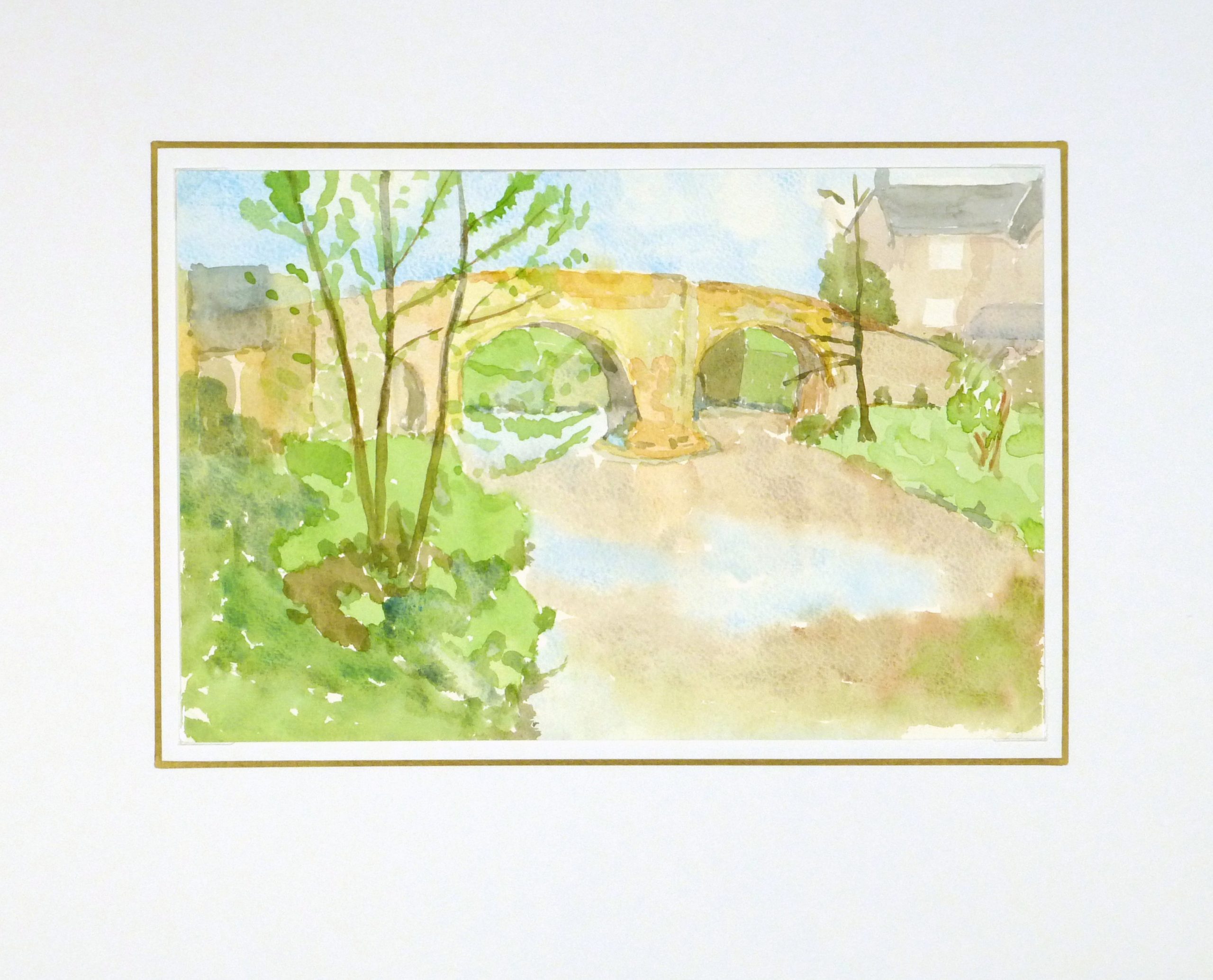 Vintage English watercolor of a stone bridge over a small river on a clear and sunny day.