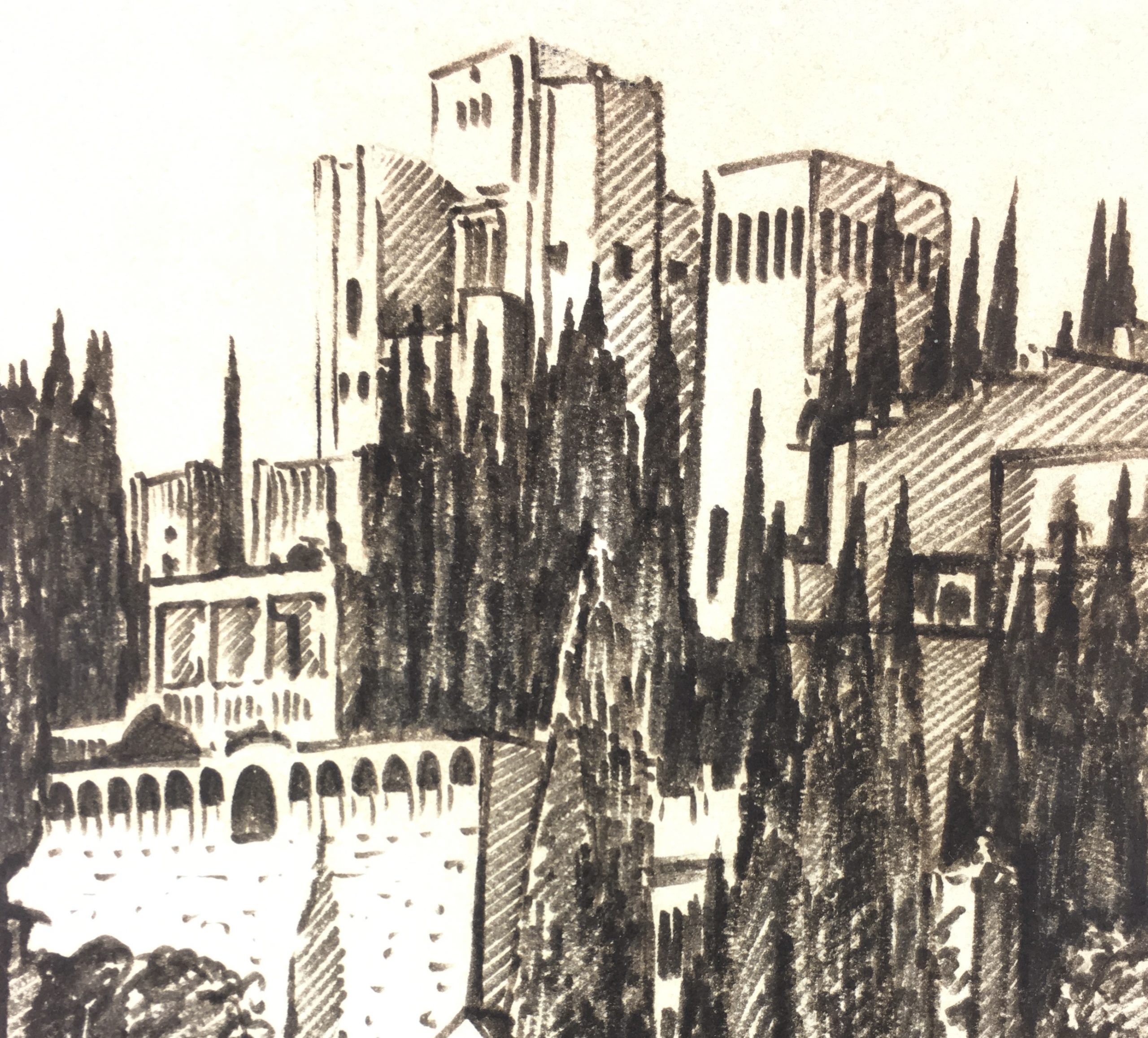 Original Art on paper displayed on a white mat with a gold border. Mat fits a standard-size frame. Archival plastic sleeve and Certificate of Authenticity included. Original Art, 7″W x 10.25″H; mat, 16″W x 20″H.