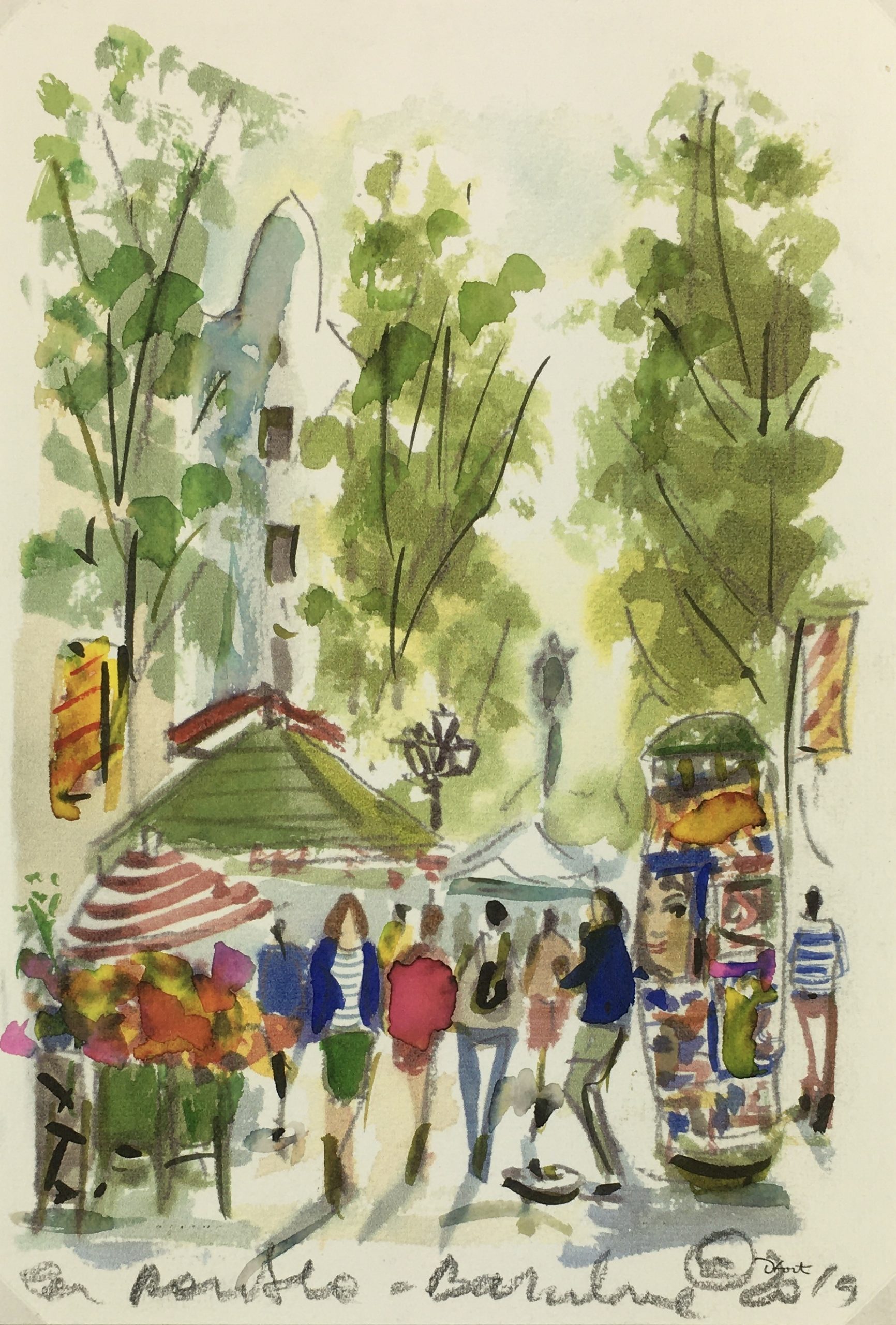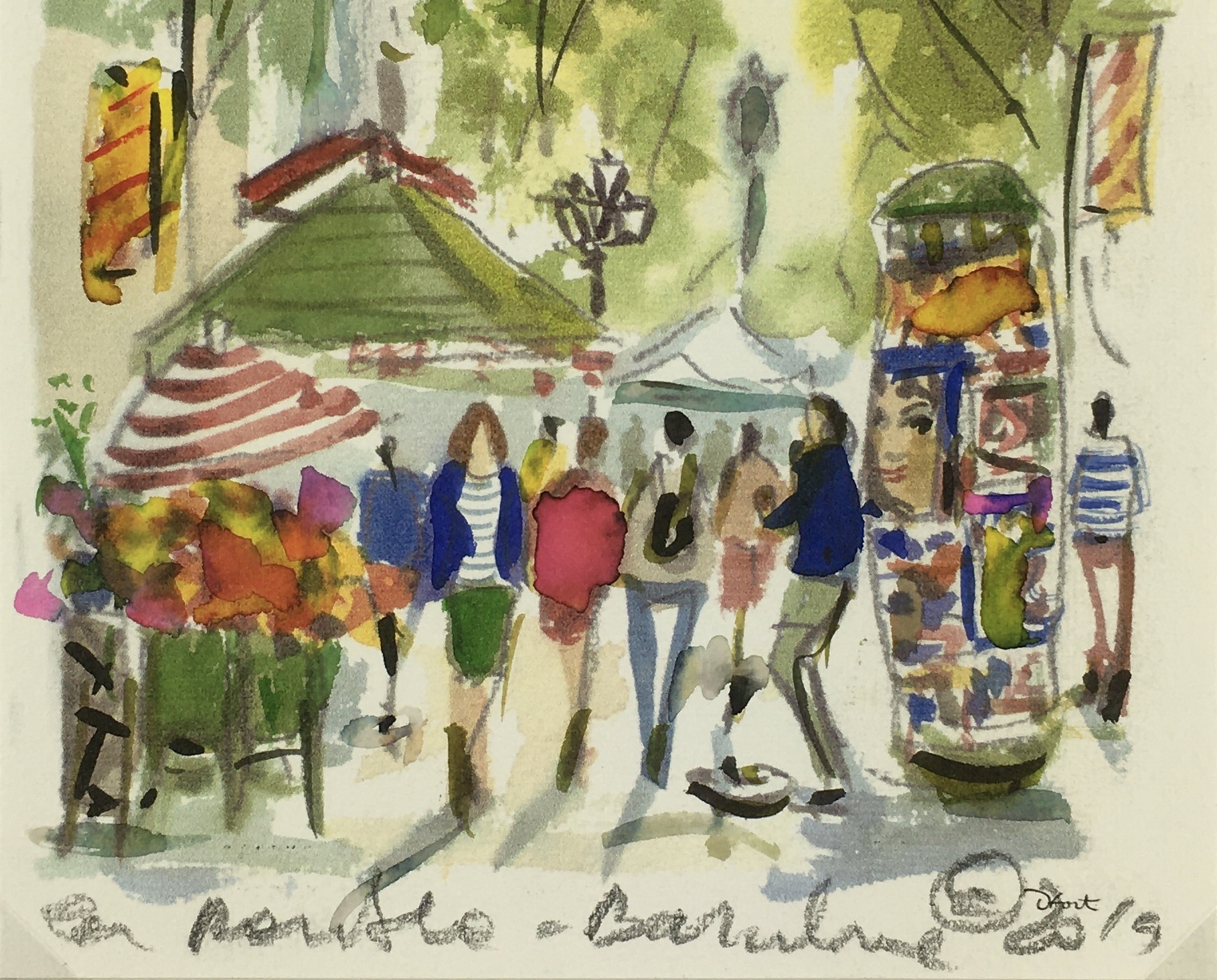 Original Art on paper displayed on a white mat with a gold border. Mat fits a standard-size frame. Archival plastic sleeve and Certificate of Authenticity included. Original Art, 5.5″W x 8″H; mat, 16″W x 20″H.