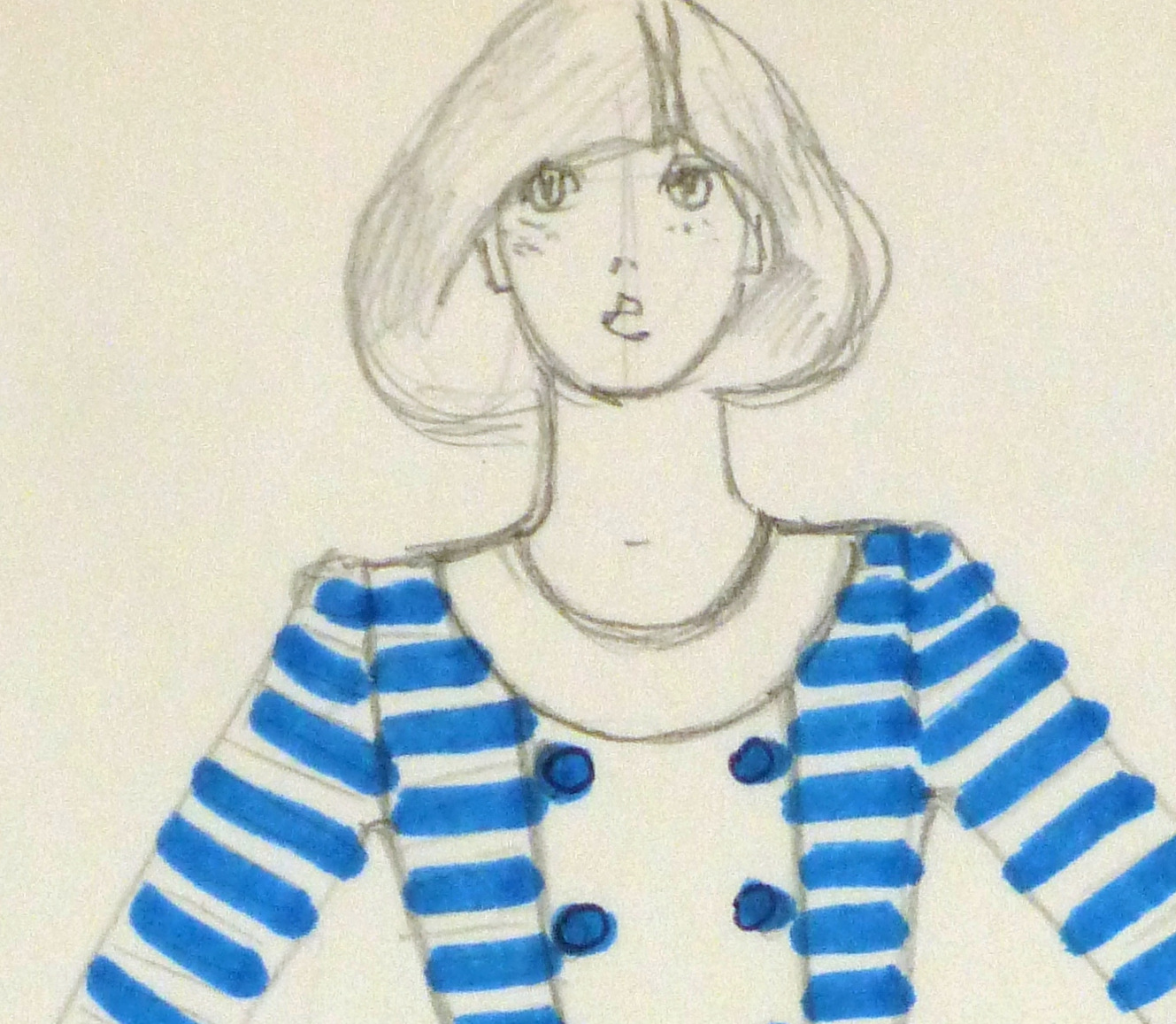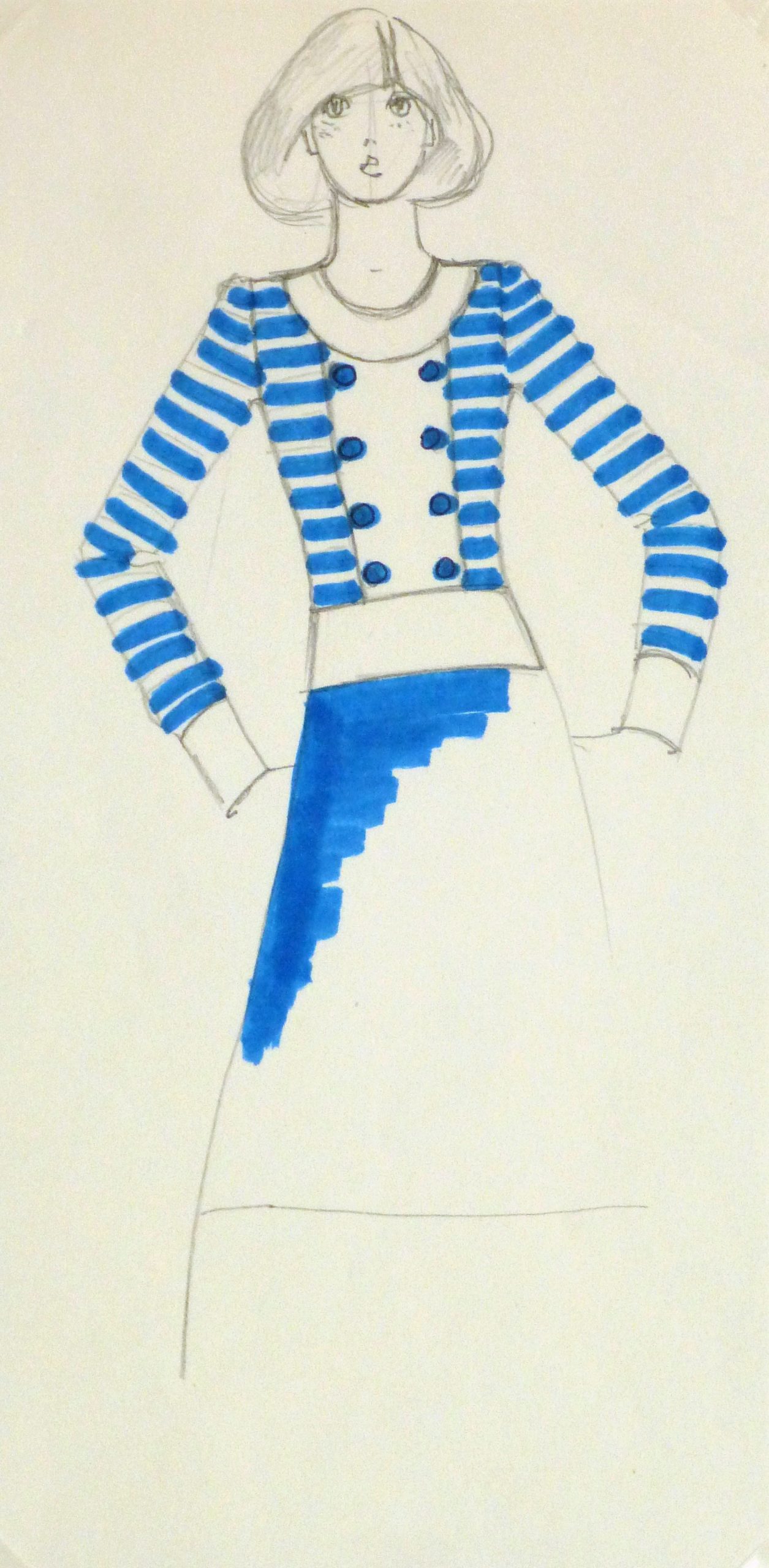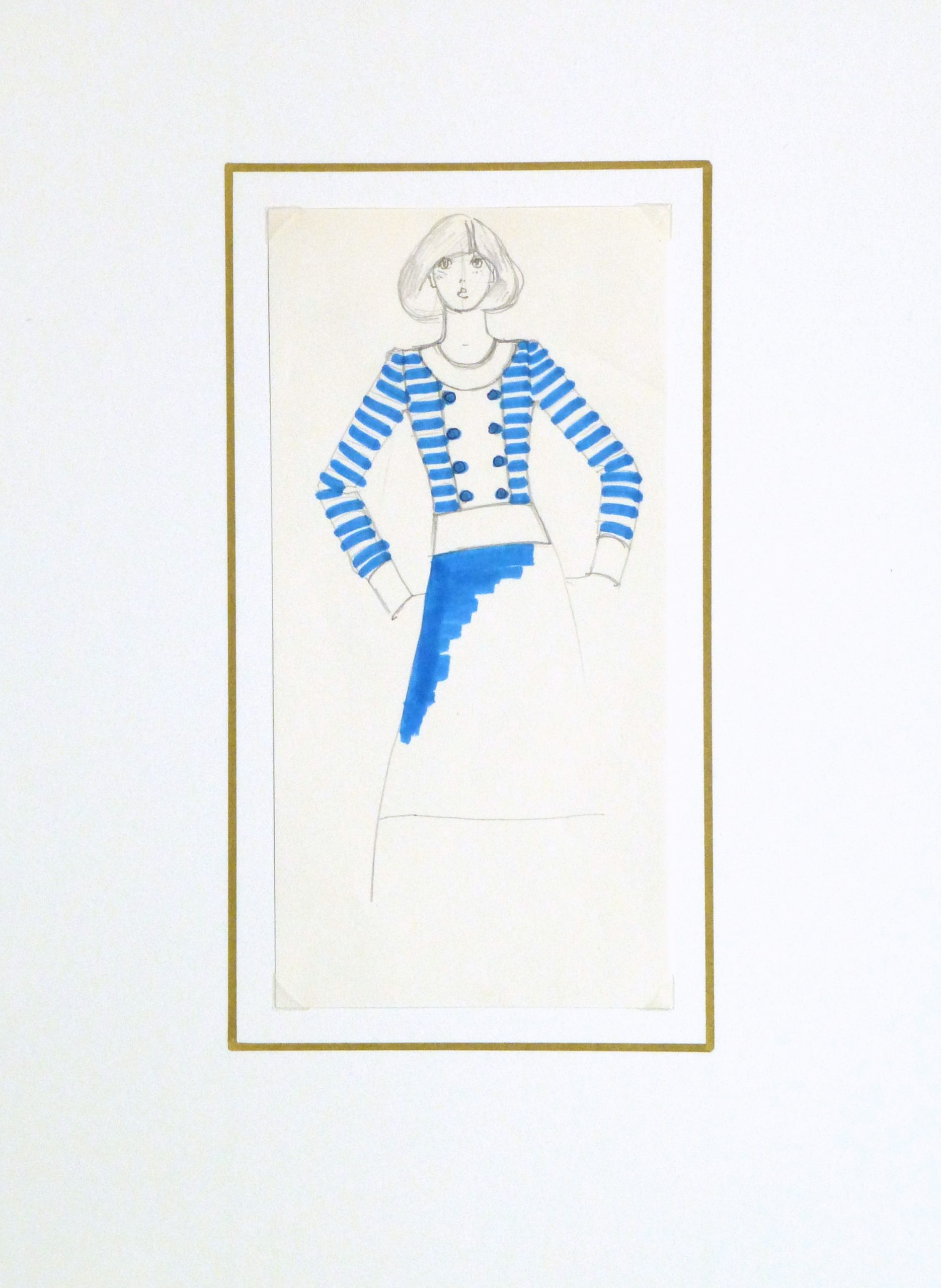 Vintage ink and pencil fashion sketch of a long sleeved stripe top accented with rows of buttons by Balmain Fashion House of Paris, circa 1970.