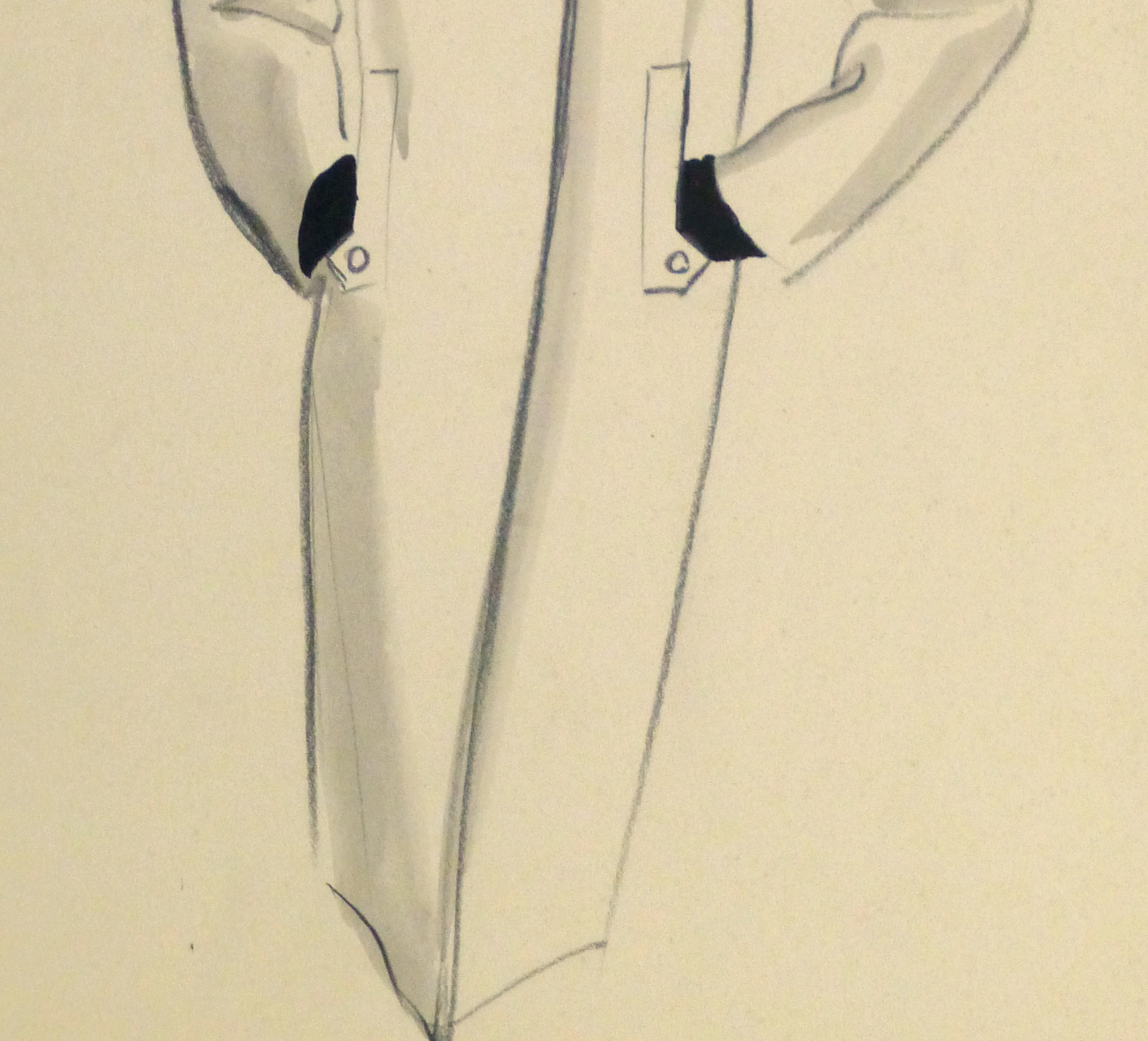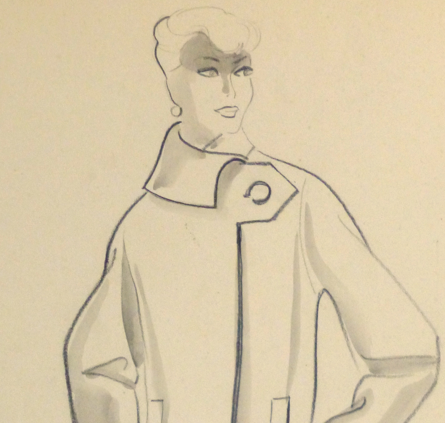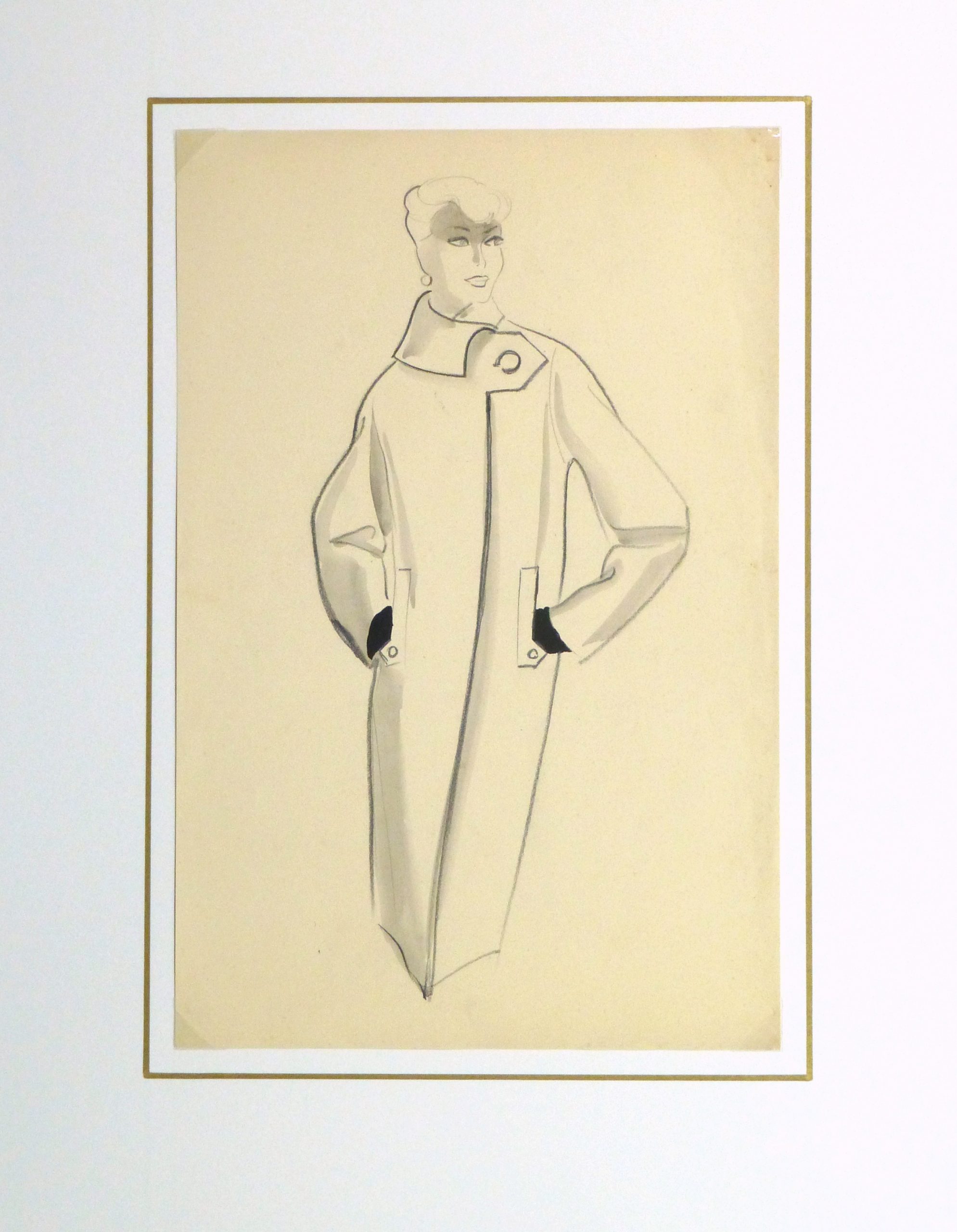 Sophisticated pencil fashion sketch of a stylish long coat with a button tab closure fitting dress by Hendlin, 1957.