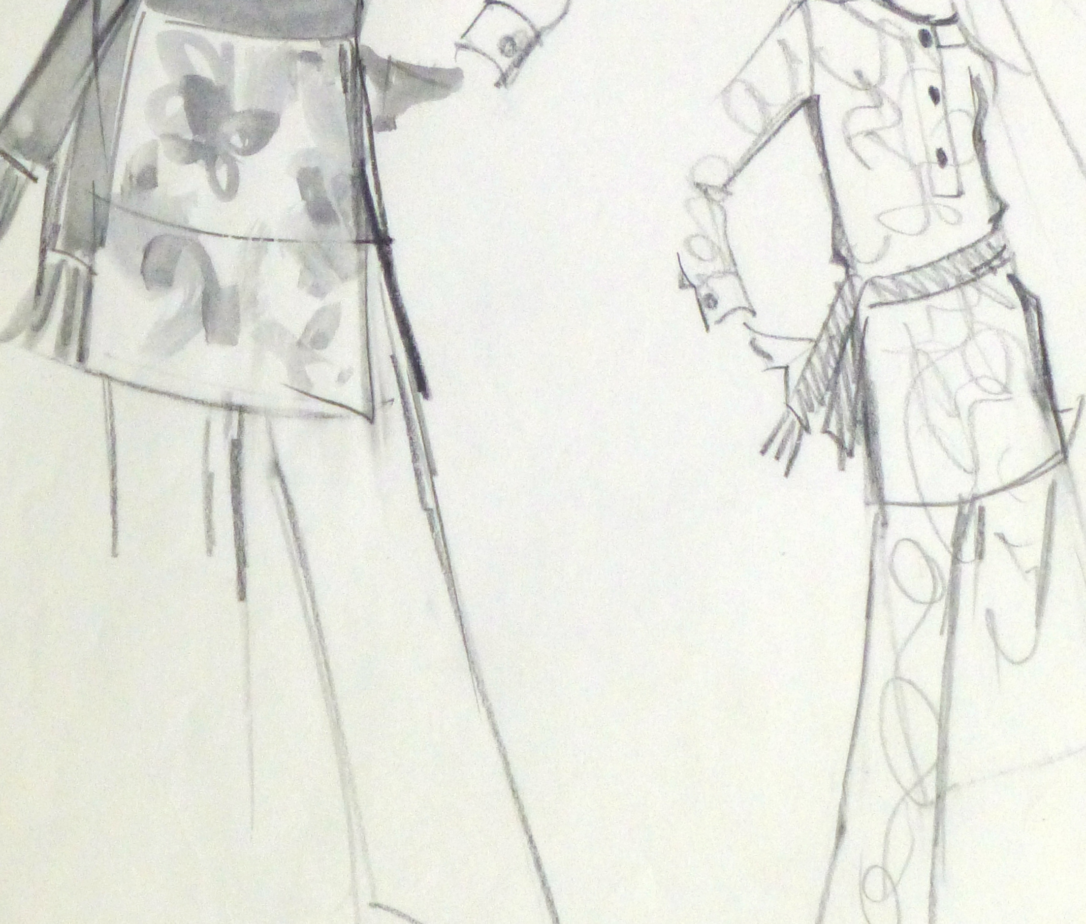 Vintage black and white watercolor and pencil fashion sketch of a floral print tunic by Balmain Fashion House of Paris, circa 1960.