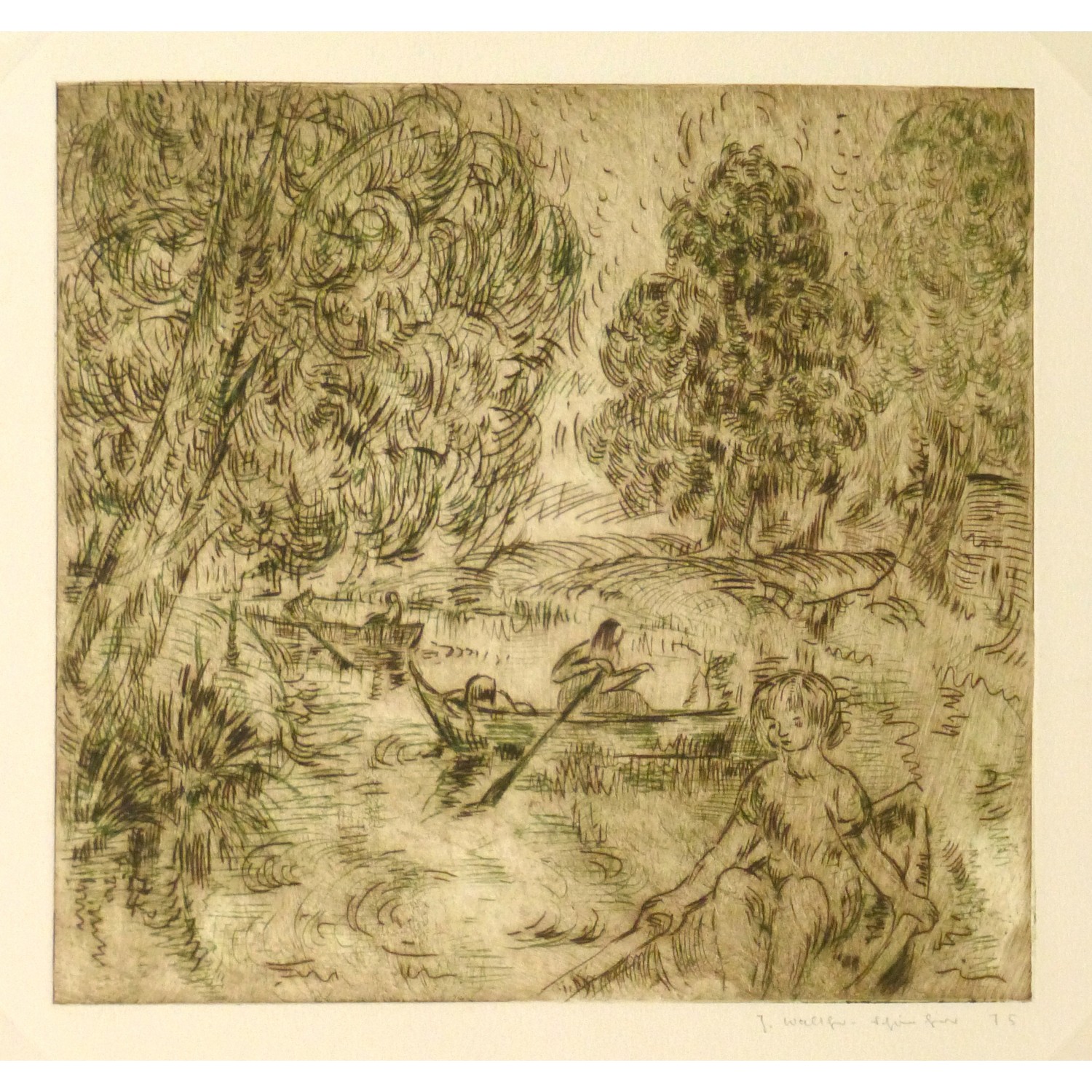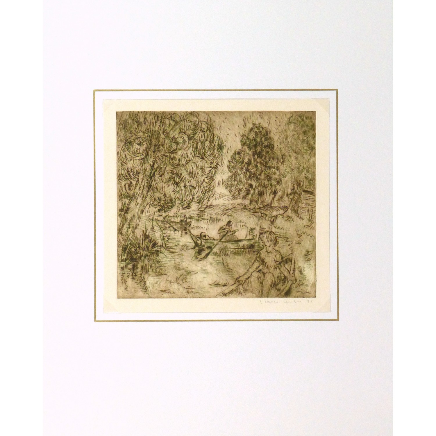 Charming aquatint etching of adults and children enjoying a day out on the pond in row boats by Julla Walther, 1975. Signed and dated in pencil lower right.