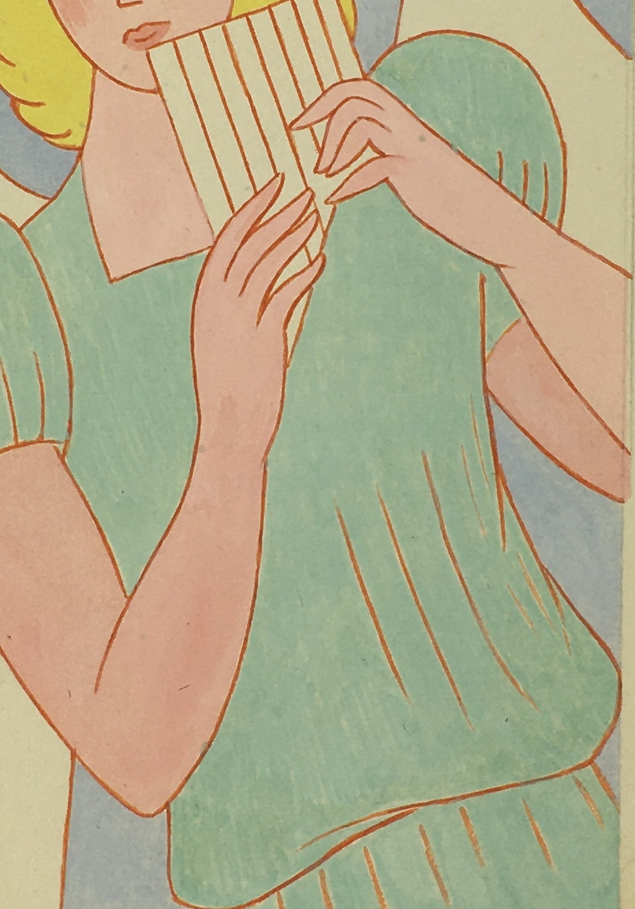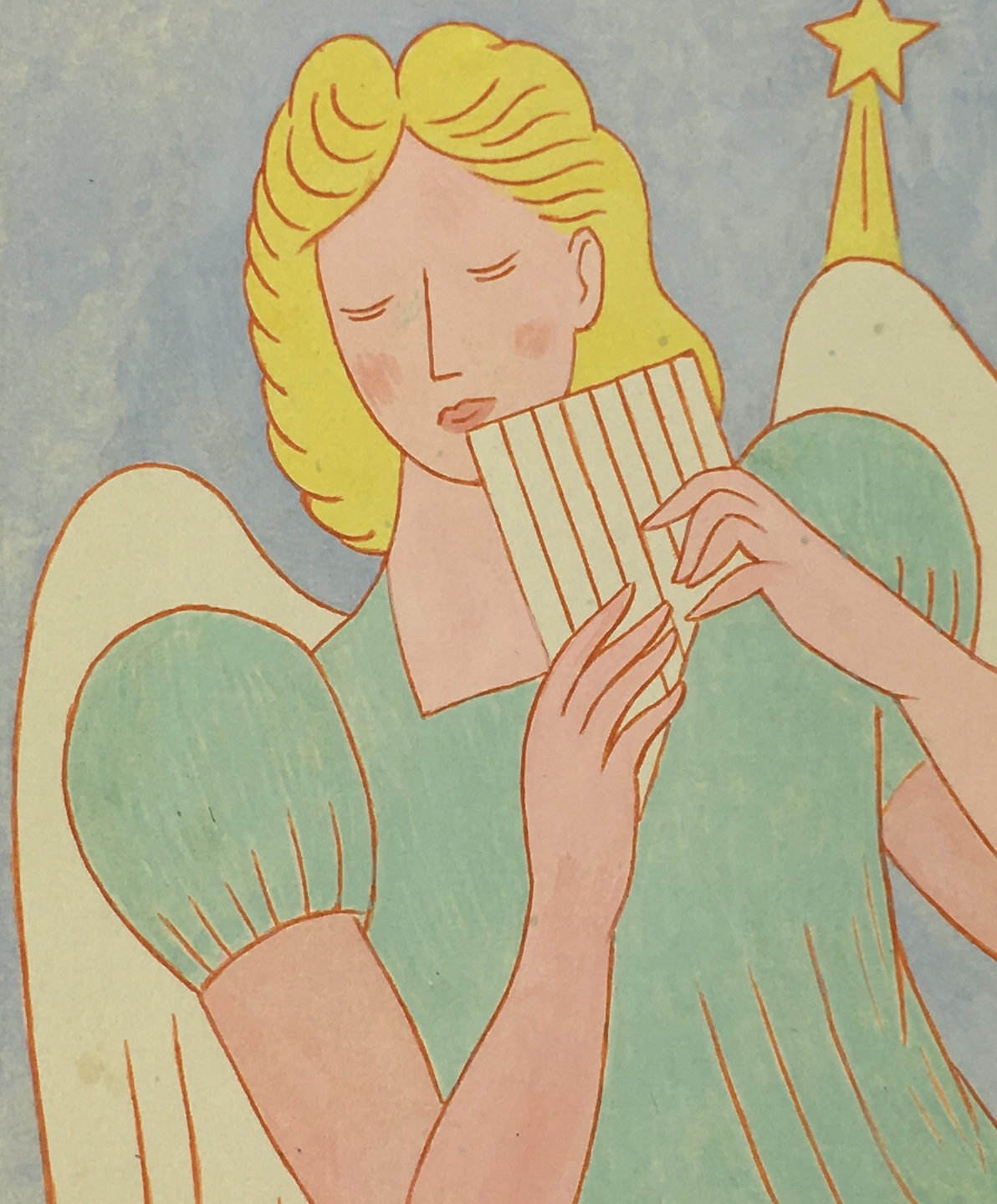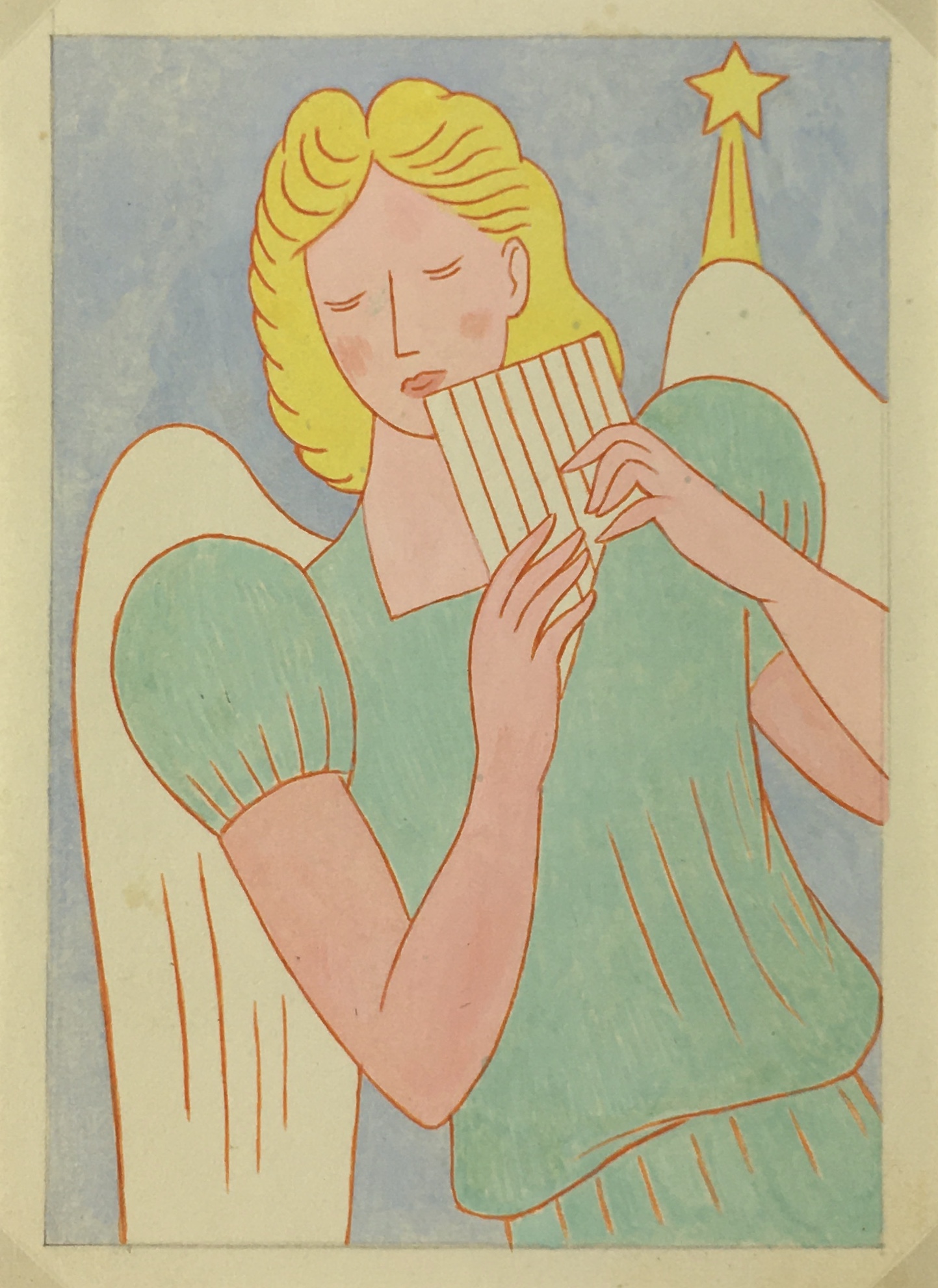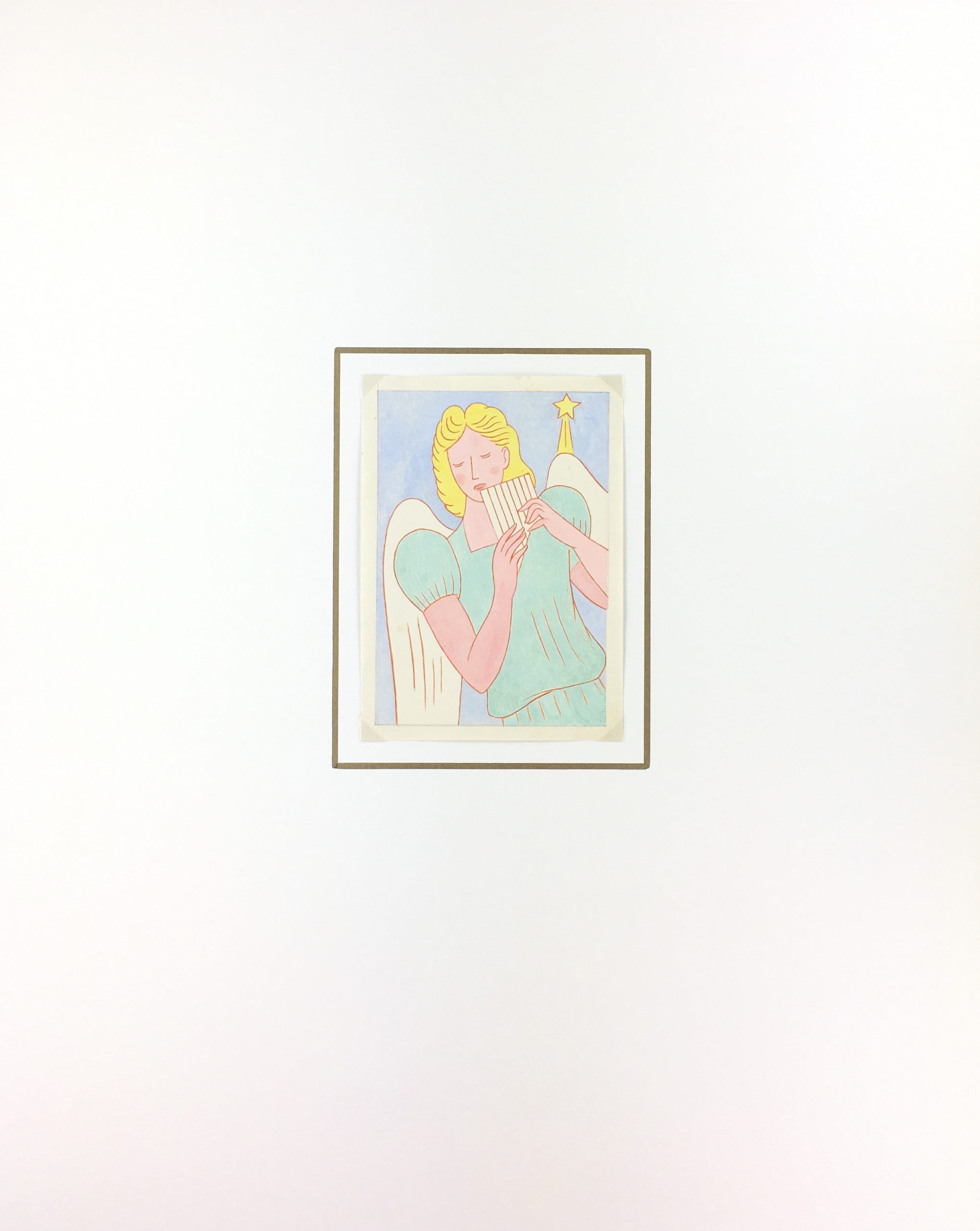 Original Art on paper displayed on a white mat with a gold border. Mat fits a standard-size frame. Archival plastic sleeve and Certificate of Authenticity included. Original Art, 4.25″W x 6″H; mat, 16″W x 20″H.