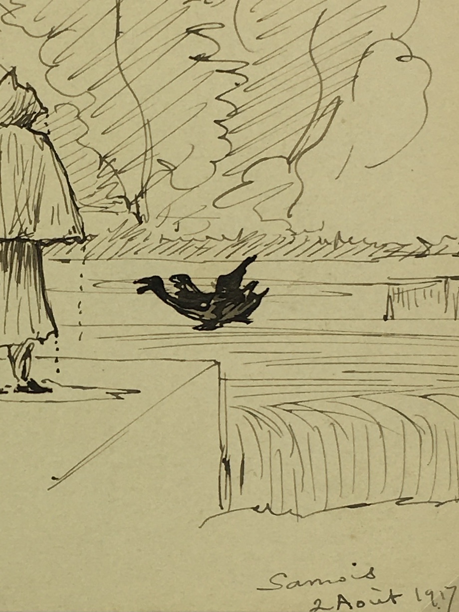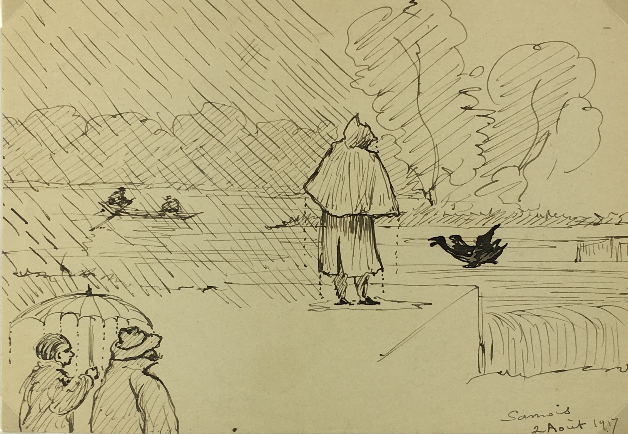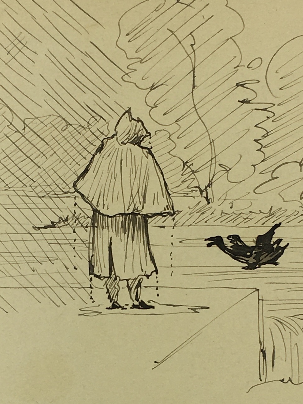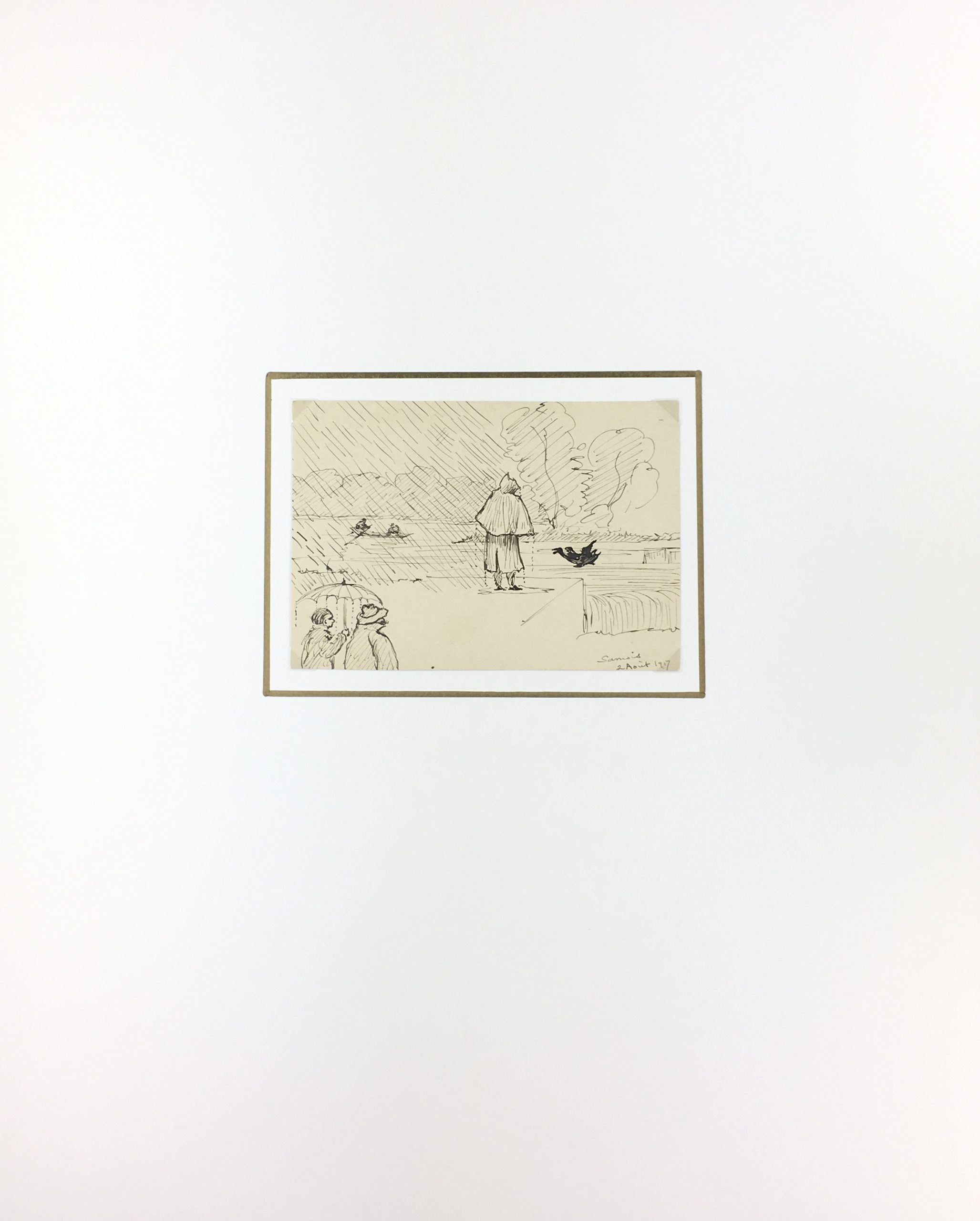 Original Art on paper displayed on a white mat with a gold border. Mat fits a standard-size frame. Archival plastic sleeve and Certificate of Authenticity included. Original Art, 6.5″W x 5.5″H; mat, 16″W x 20″H.
