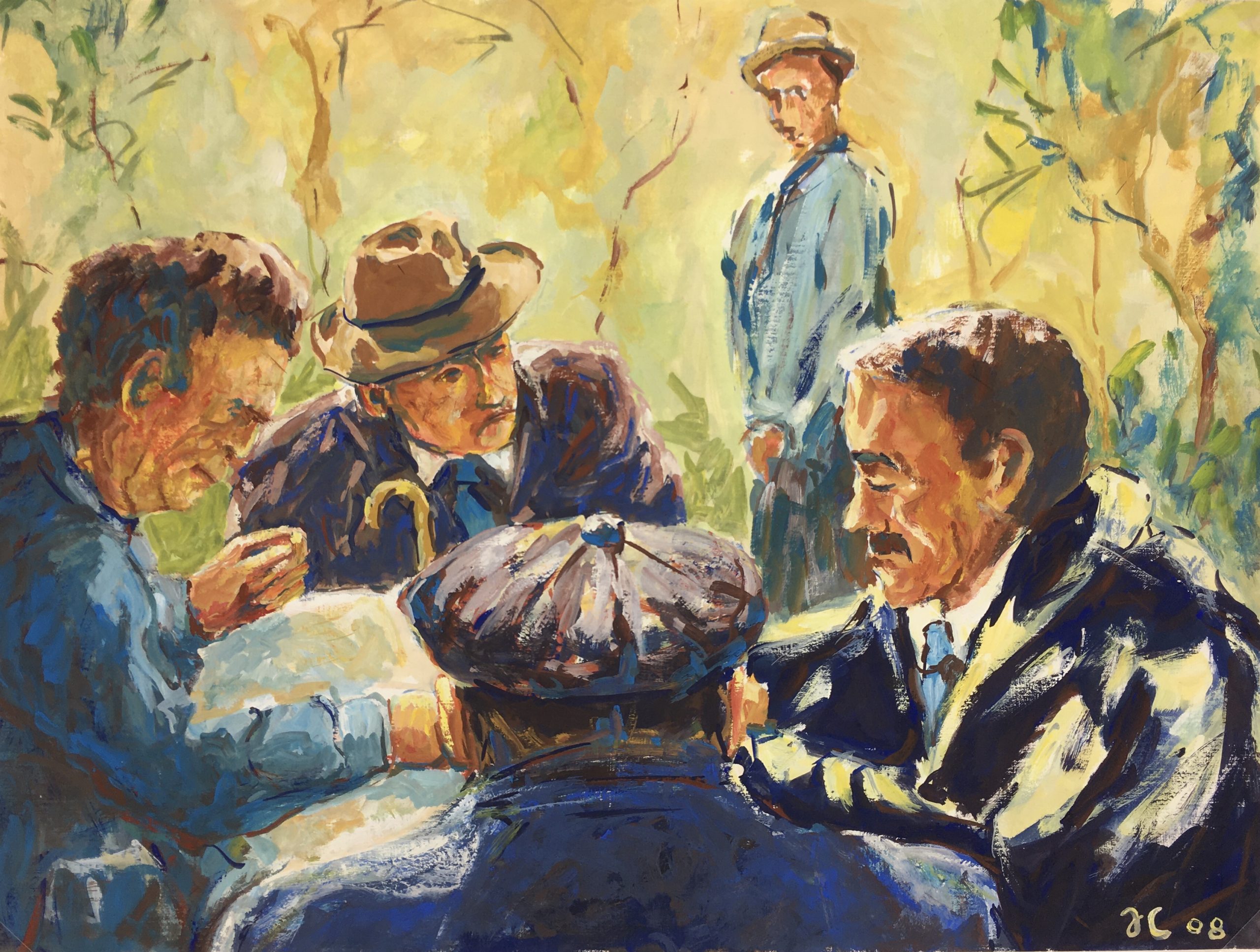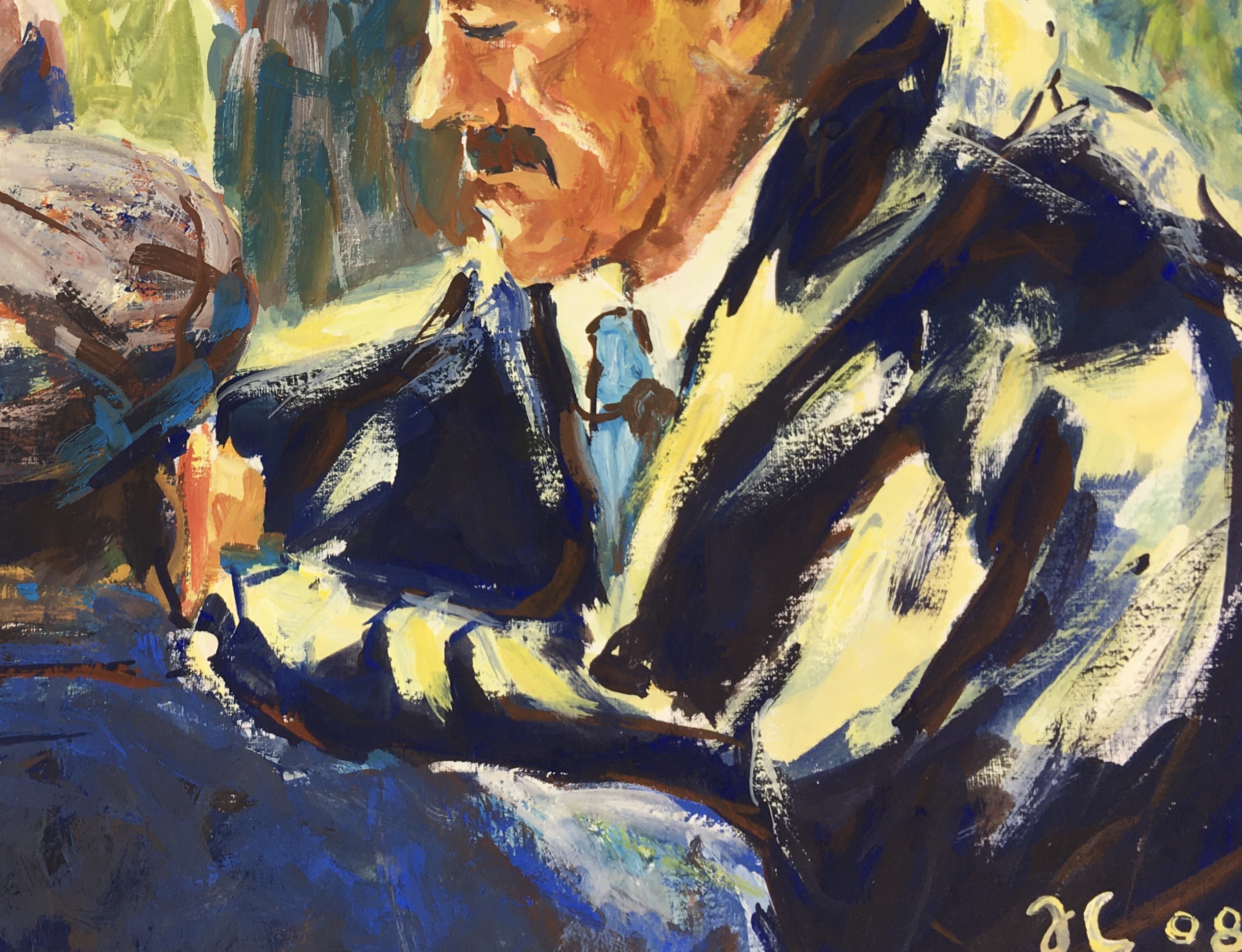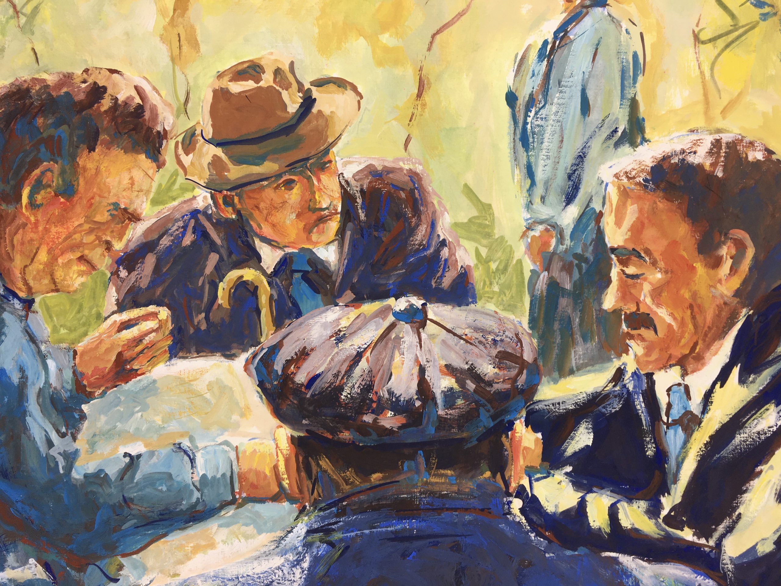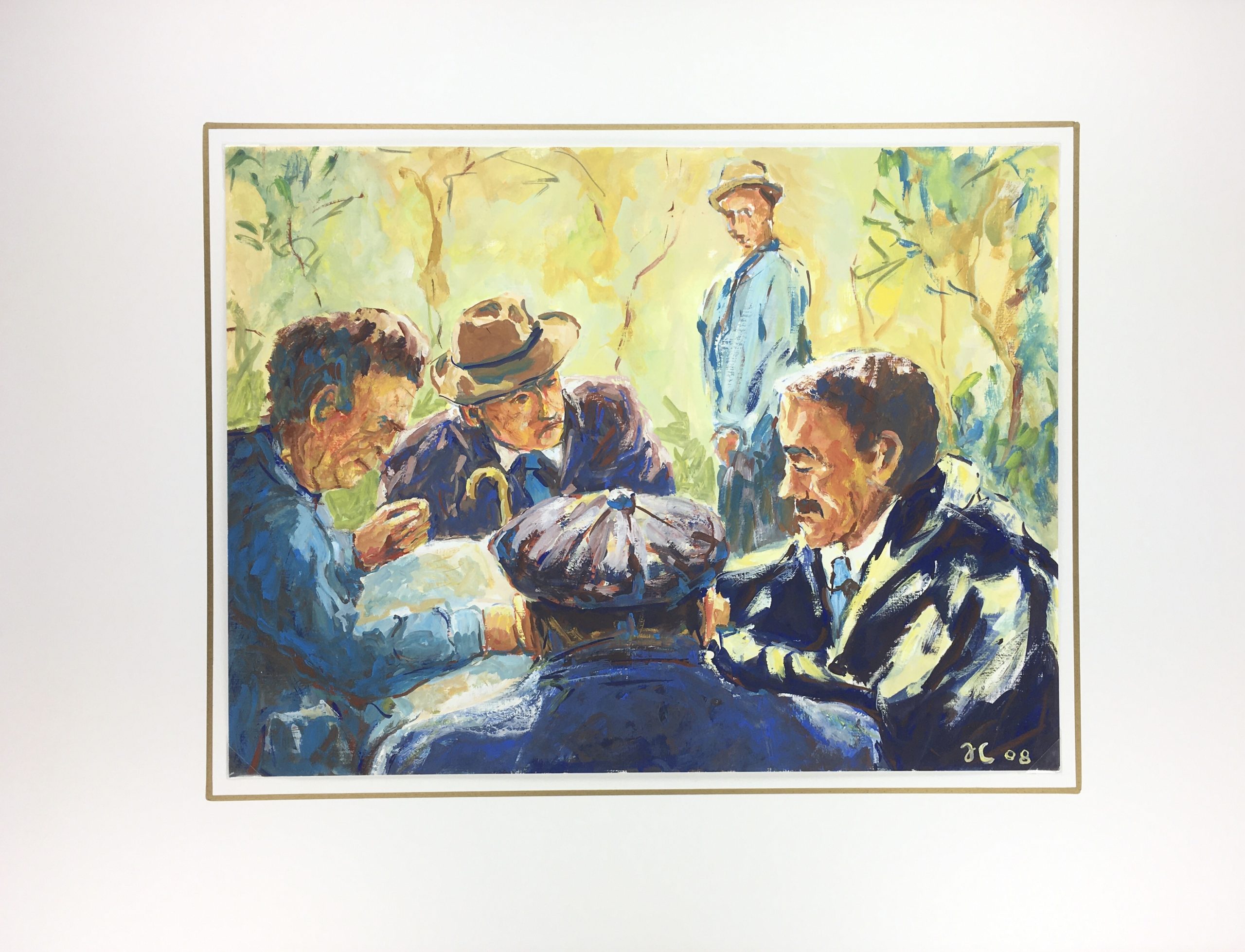 Original Art on paper displayed on a white mat with a gold border. Mat fits a standard-size frame. Archival plastic sleeve and Certificate of Authenticity included. Original Art, 15.5″W x 11.75″H; mat, 18″W x 24″H.