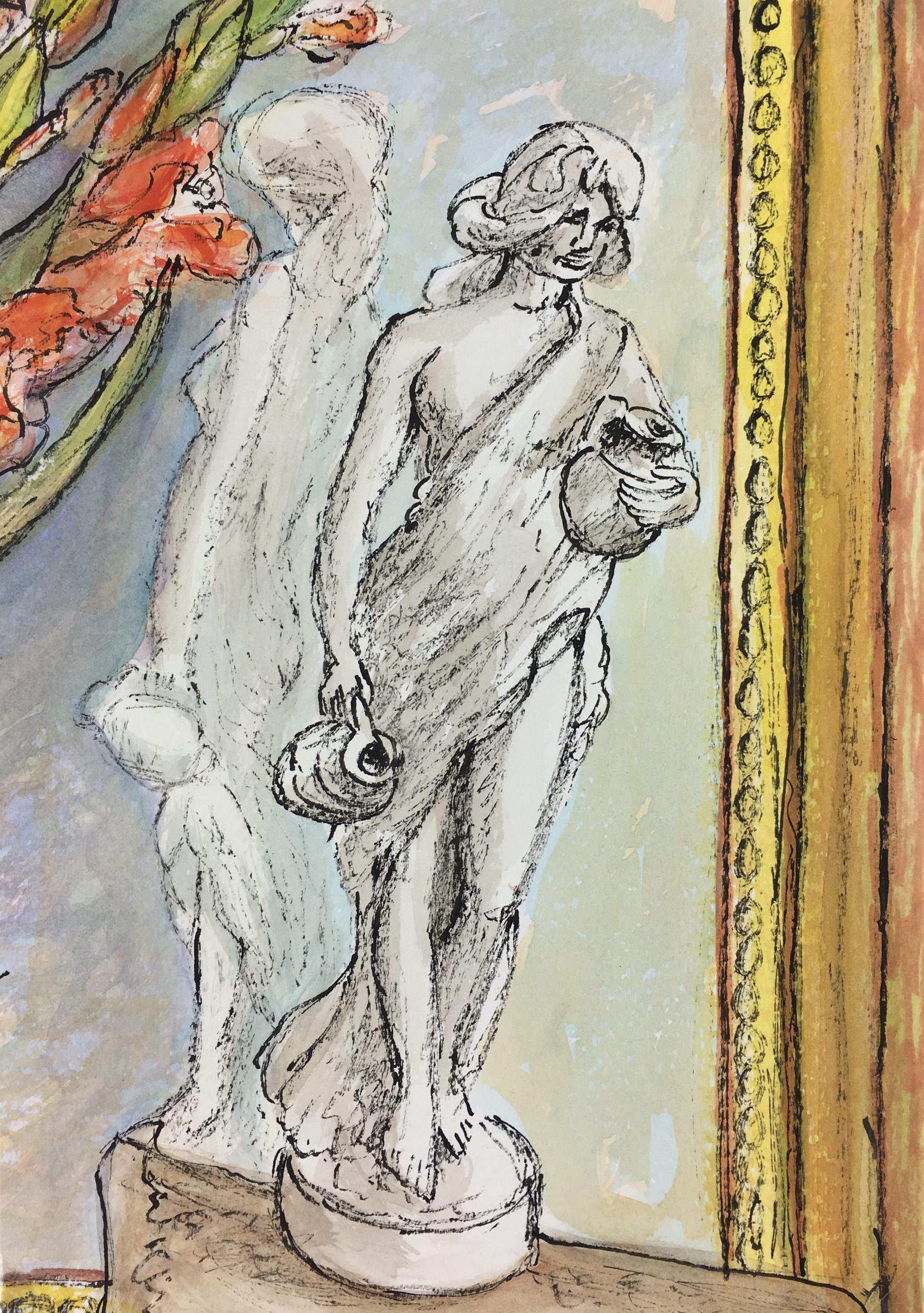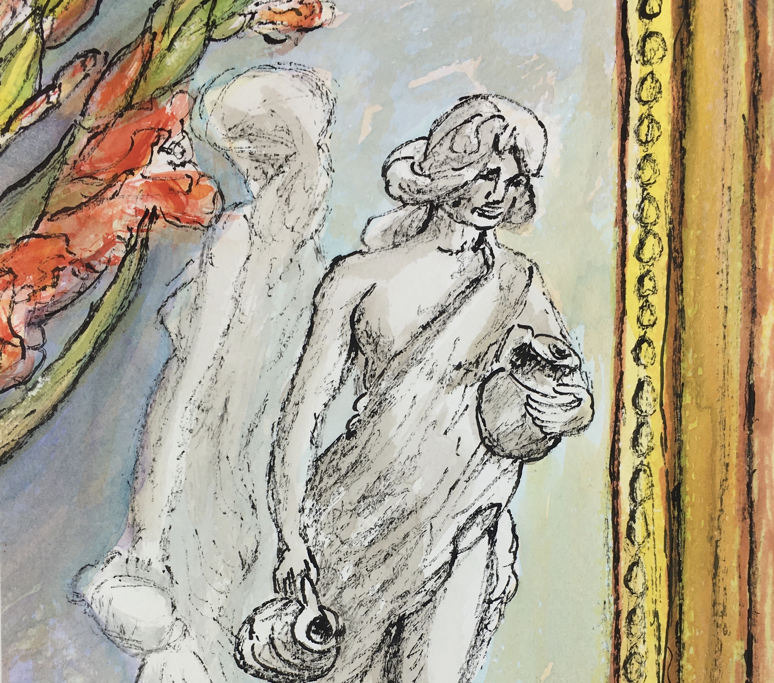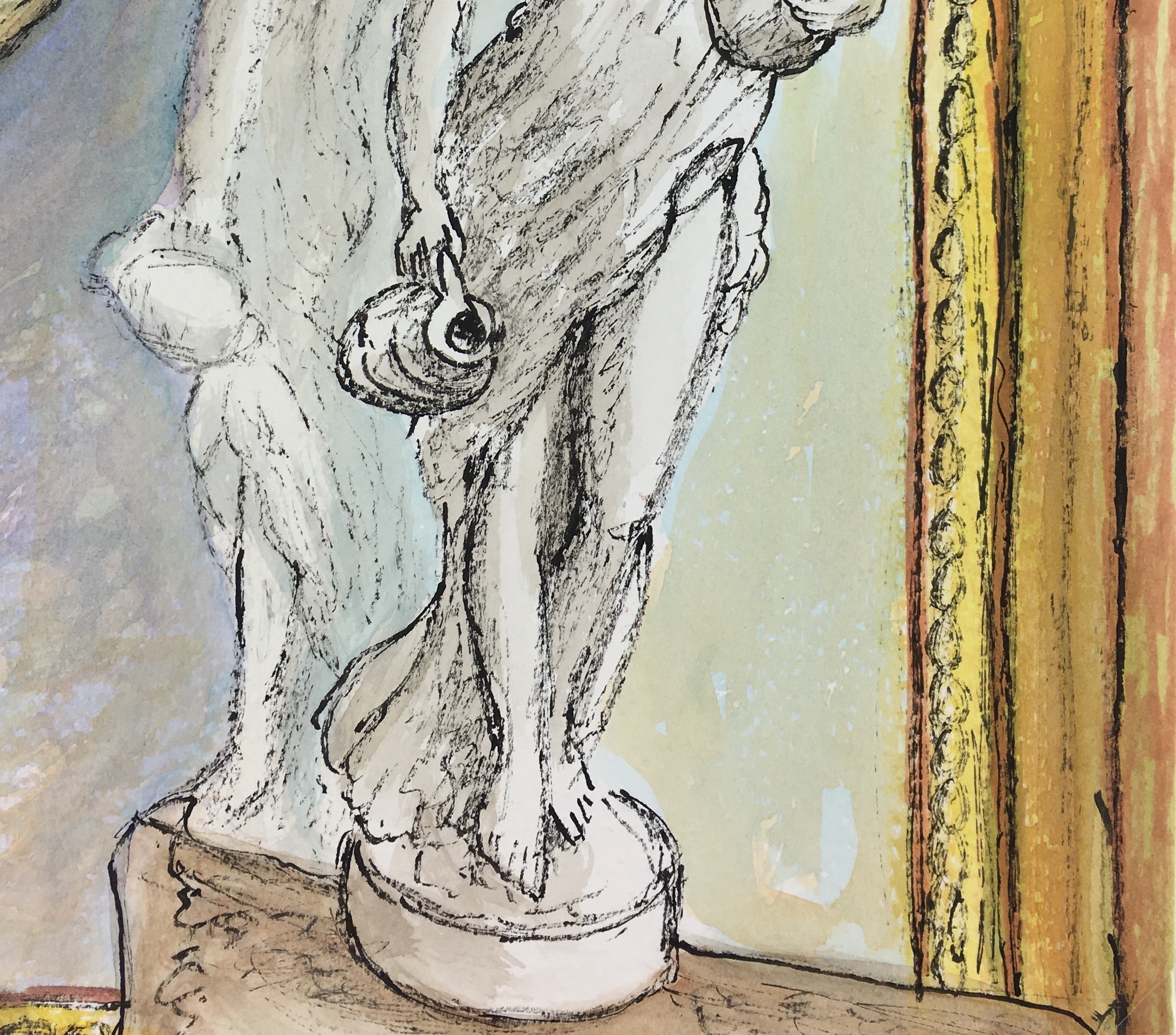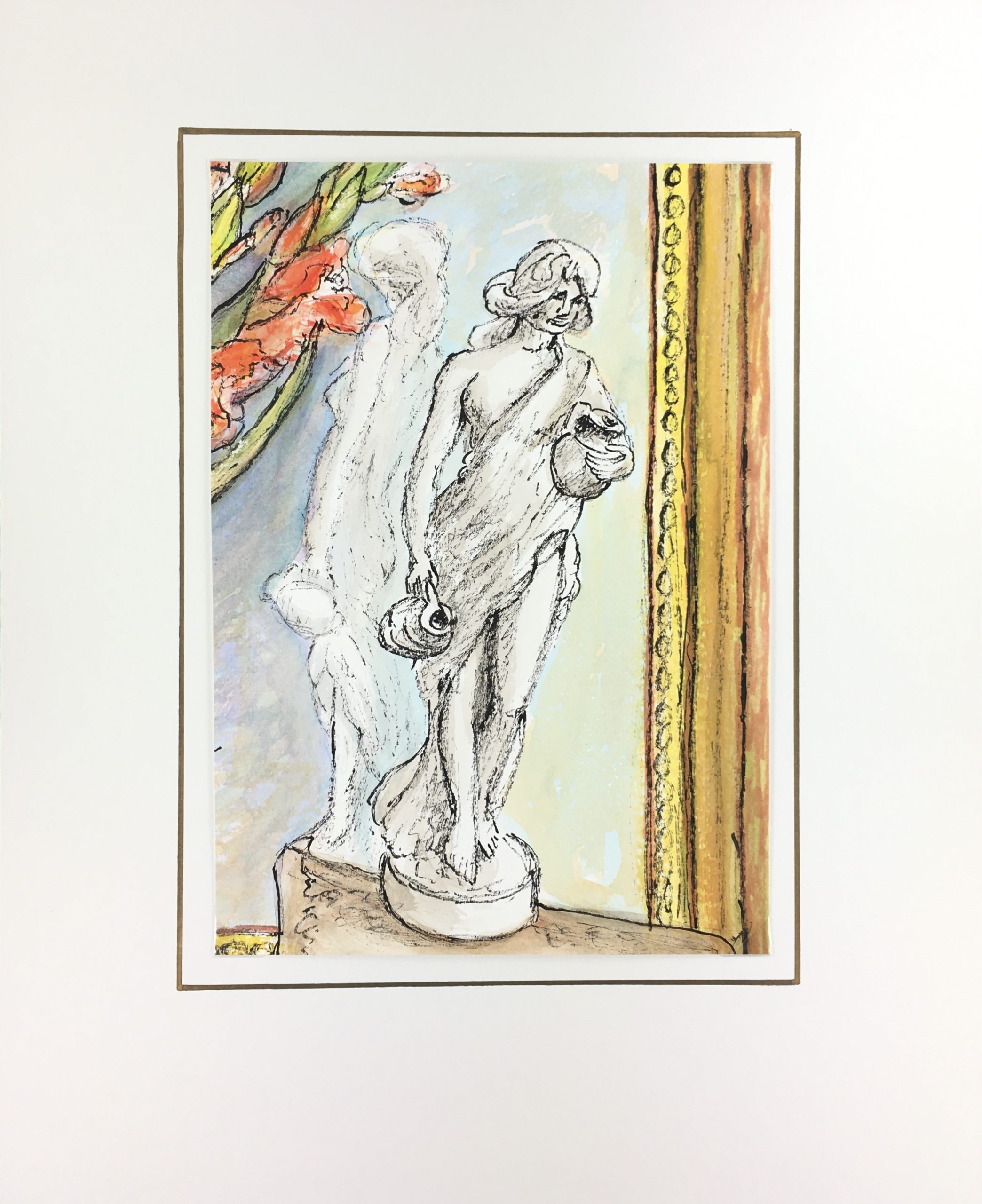 Original Art on paper displayed on a white mat with a gold border. Mat fits a standard-size frame. Archival plastic sleeve and Certificate of Authenticity included. Original Art, 9″W x 13″H; mat, 16″W x 20″H.
